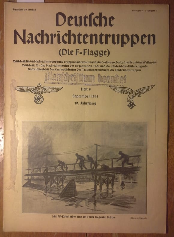 Deutsche Nachrichtentruppen Die F, Flagge, Stuttgart, 1943, In German. The listing price of $99 is for a single issue of the periodical. Several issues are available during the period indicated in the listing title. Please inquire about availability of specific issues, id3-009712