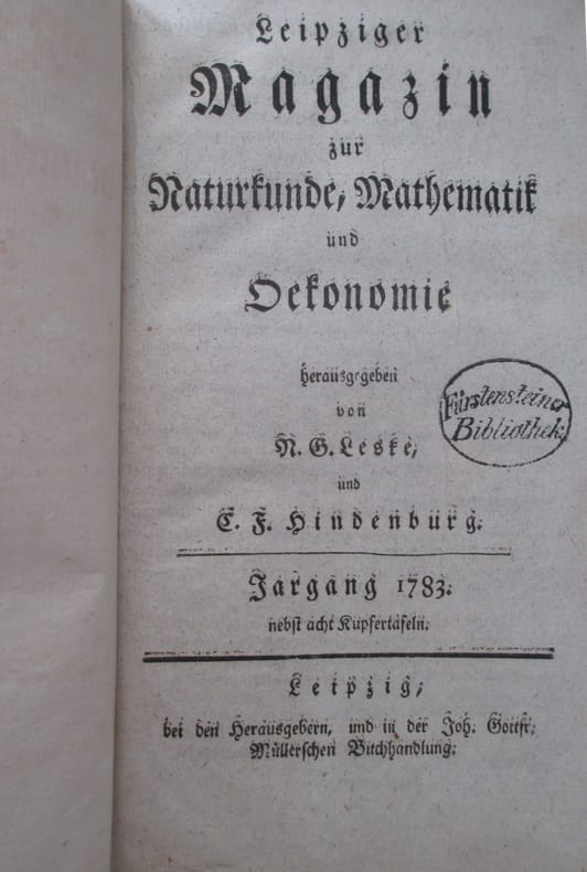 Leipziger Magazin zur Naturkunde, Mathematik, publisher: Hindenburg, Leipzig, In German, 1783, 1786. The listing price of $99 is for a single issue of the periodical. Several issues are available during the period indicated in the listing title. Please inquire about availability of specific issues, id3-009715