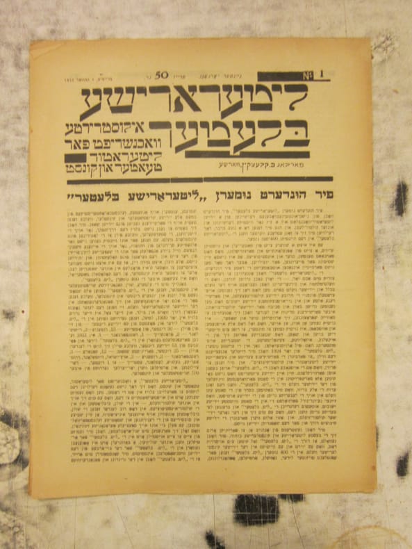 Literarisze Bleter, publisher: Drukarnia B, ci Wojcikiewicz, Warsaw, In Yiddish, 1929, 1930, 1931, 1932, 1935. The listing price of $99 is for a single issue of the periodical. Several issues are available during the period indicated in the listing title. Please inquire about availability of specific issues, id3-009731