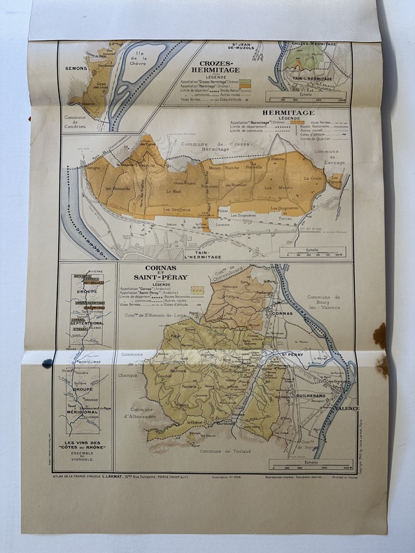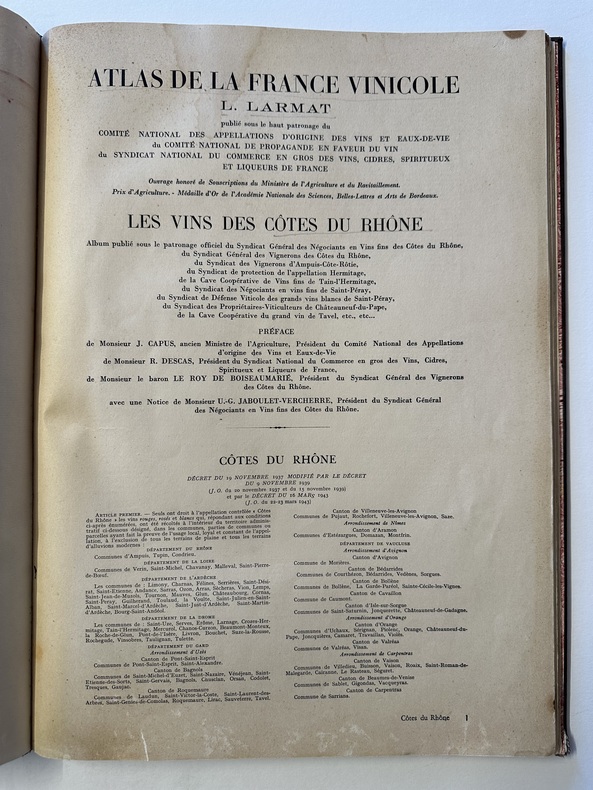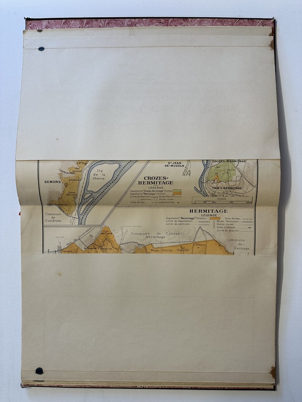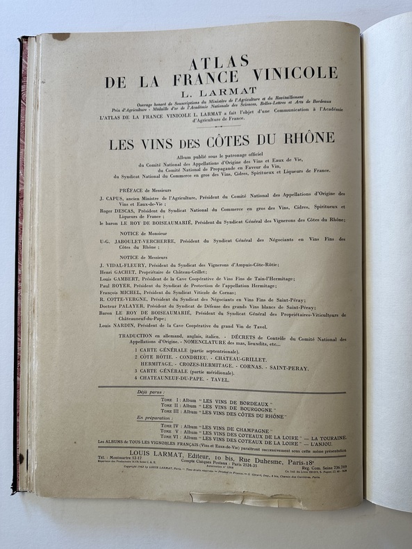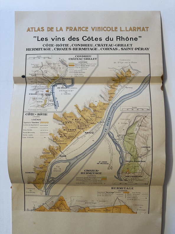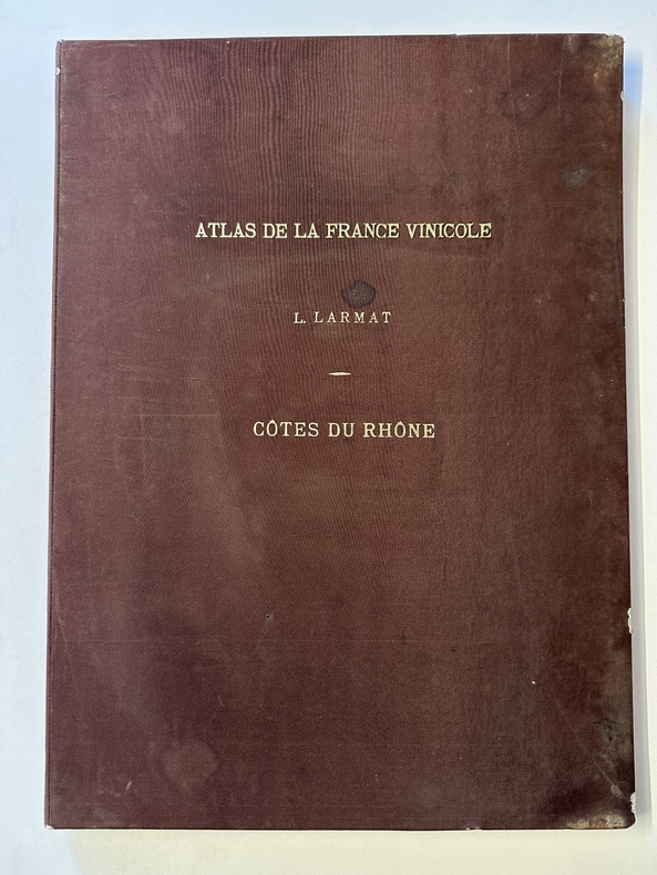 Atlas de la France Vinicole. Tome 3. Les Vins des Côtes du Rhône. Louis Larmat Éditeur, Paris, 1943. Un volume in-folio. Hauteur des feuillets 44,5 cm. 24 pages. 4 cartes dépliantes montées sur serpentes. Exemplaire relié.