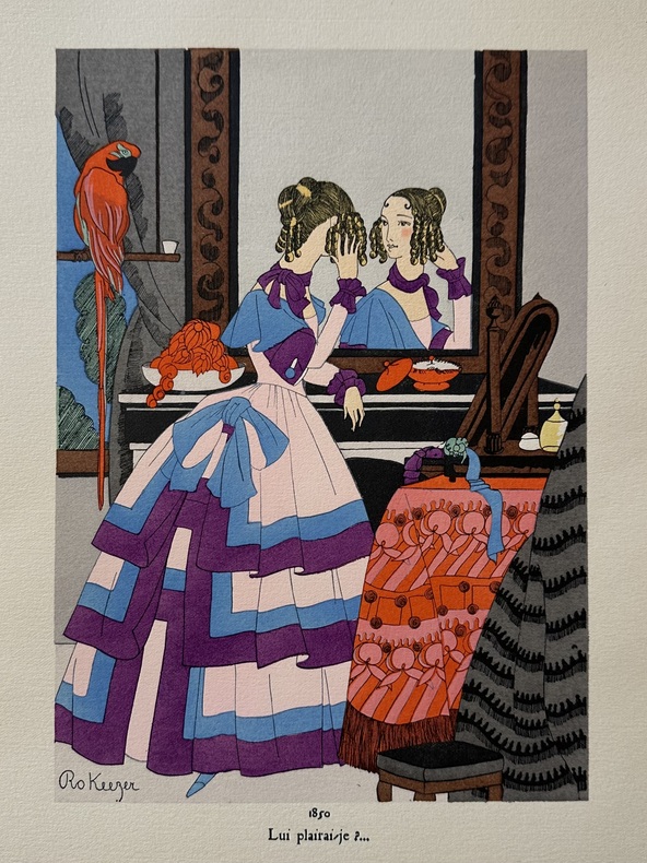 La Toilette Féminine et les Bibelots de l'Époque Romantique. Éditions Nilsson, sans date, c.1930. Planche illustrant l'année 1850 intitulée Lui plairai-je ?... 28 x 38 cm.