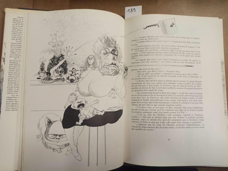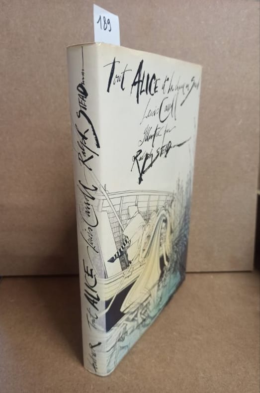 Editions Aubier 1986. Fort in-4 cartonnage éditeur pleine toile bleue avec titre au dos, de 336 pages au format 29,5 x 5 x 20,5 cm. Jaquette et magnifiques illustrations en noir, avec parfois des fonds de couleur, par Ralph Steadman. Contient l'intégrale des Aventures d'Alice au Pays des Merveilles et de l'autre coté du Miroir, suivies de la Chasse au Snark. Traduction d'Henri Parisot. Superbe état général. Rare édition originale française illustrée.