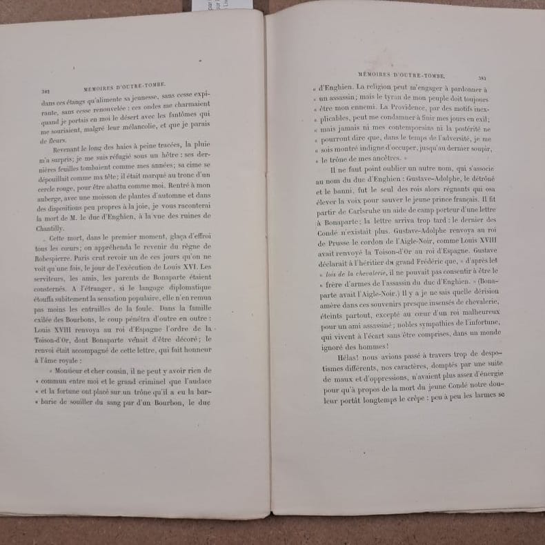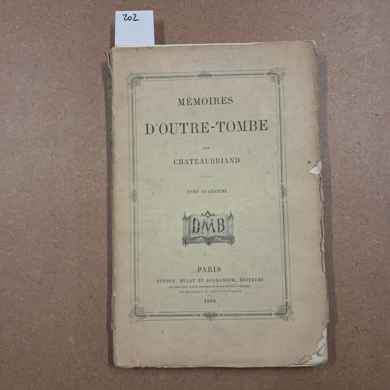 1860 - broché - A paris, Dufour, Mulat et Boulanger, Editeurs, rue de Beaune, 6, près le Pont-Royal - Imprimerie de J. Claye, Paris - Tome IV - 1860 - Petit in-4 (28 x 18 cm) broché - Paginé de pp. 289 à 582 - Quelques gravures en noir et blanc hors texte - Le livre est une édition ancienne des Mémoires d'Outre-tombe, proche de l'édition originale (Penaud Frères, 1849–1850) qui n'était pas divisée en livres. Il est orné de quelques gravures en noir et blanc. Ce tome est vendu seul et pourra satisfaire quelqu'un cherchant à compléter sa collection ou quelqu'un souhaitant le relier, le brochage du-dit volume étant quelque peu usé.