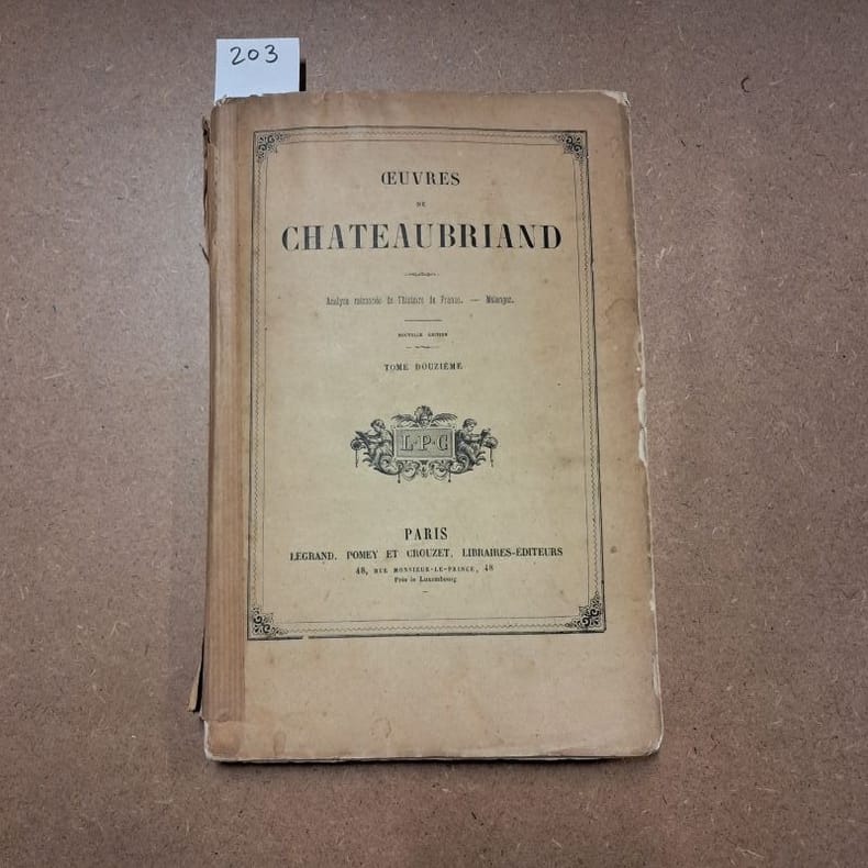 Non daté - broché - A paris, Legrand, Pomey et Crouzet, Libraires-Editeurs, 48 rue Monsieur-le-Prince, 48, Près le Luxembourg - Imprimerie de Paul Dupont, Clichy - Tome XII - Nouvelle édition - Ouvrage non daté (circa 1850) - Petit in-4 (28 x 18 cm) broché - 299 pages - Quelques gravures en noir et blanc hors texte - Le livre est une édition ancienne des Œuvres de Chateaubriand, proche des premières éditions. Outre de nombreuses éditions de chacun des ouvrages séparés de Chateaubriand, il a été fait plusieurs éditions de ses Œuvres complètes, dont celle de Pierre-François Ladvocat, en 31 volumes in-8°, Paris, 1826-1831, revue par l'auteur même, qui y a joint des éclaircissements et des notes critiques, et l'a enrichie de quelques œuvres inédites, et proche de l'édition en 20 volumes chez Eugène et Victor Penaud frères, éditeurs, en 1849-1850. Il est orné de quelques gravures en noir et blanc. Ce tome est vendu seul et pourra satisfaire quelqu'un cherchant à compléter sa collection ou quelqu'un souhaitant le relier, le brochage du-dit volume étant quelque peu usé.