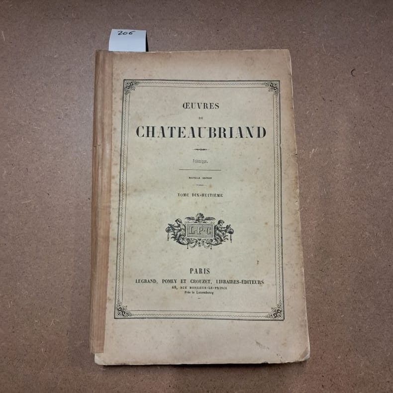 Non daté - broché - A paris, Legrand, Pomey et Crouzet, Libraires-Editeurs, 48 rue Monsieur-le-Prince, 48, Près le Luxembourg - Imprimerie de Paul Dupont, Clichy - Tome XVI - Nouvelle édition - Ouvrage non daté (circa 1850) - Petit in-4 (28 x 18 cm) broché - 264 pages - Quelques gravures en noir et blanc hors texte - Le livre est une édition ancienne des Œuvres de Chateaubriand, proche des premières éditions. Outre de nombreuses éditions de chacun des ouvrages séparés de Chateaubriand, il a été fait plusieurs éditions de ses Œuvres complètes, dont celle de Pierre-François Ladvocat, en 31 volumes in-8°, Paris, 1826-1831, revue par l'auteur même, qui y a joint des éclaircissements et des notes critiques, et l'a enrichie de quelques œuvres inédites, et proche de l'édition en 20 volumes chez Eugène et Victor Penaud frères, éditeurs, en 1849-1850. Il est orné de quelques gravures en noir et blanc. Ce tome est vendu seul et pourra satisfaire quelqu'un cherchant à compléter sa collection ou quelqu'un souhaitant le relier, le brochage du-dit volume étant quelque peu usé.