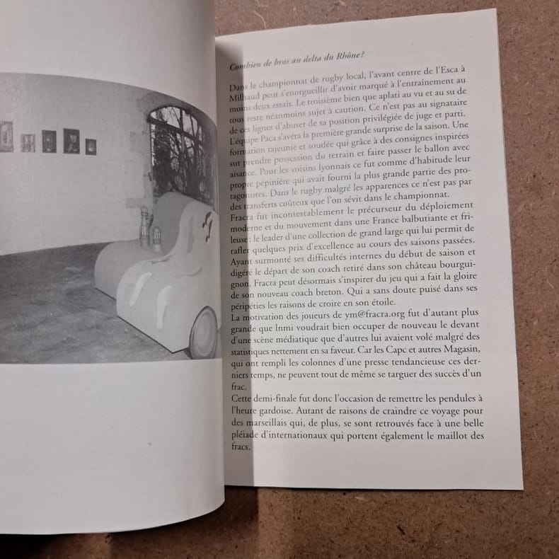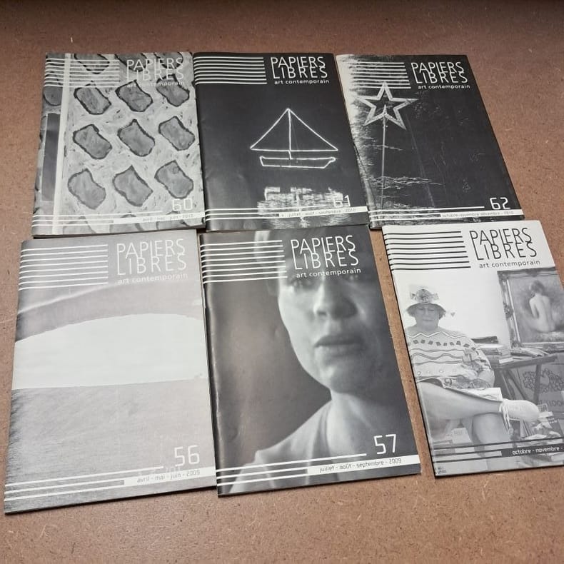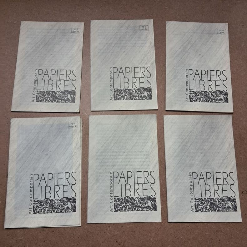 1995 - agrafé - Galerie ESCA, Nîmes - Revue trimestrielle - Numéro «0» de février 1995, concernant l’exposition de Paul Collins, puis du N° 1 (ISSN: 1263-5960) au N° 62 du dernier trimestre 2010 (ISSN 1263-5960) - In-12 (15 x 10 cm), feuillets agrafés - Nombreux textes d'artistes, d'exposition et de critiques, avec de nombreuses photographies en noir et blanc - Le carton contient aussi des numéros hors série: Numéro de Caroline Muheim (Les gens concernés) - Hors série 1995: Christian Liger (Passage du commerce St-André) - Hors série 2005 is/sud - Hamid Maghraoui & Bernard Veyrat 2k3 (2003) - Hors série 1998 - Hors série 1997 - PRESENTATION : Petite revue trimestrielle du Sud de la France éditée par une galerie d’art contemporain de Milhaud, présentant l’actualité régionale sans se dispenser de voyager au-delà. Comptes rendus d’exposition et analyses critiques portent sur Antoni Muntadas, les Rencontres de la photo d’Arles, Jean-Luc Verna, Paul Collins… Papiers Libres est une revue trimestrielle d’art contemporain publiée par ESCA depuis 1995, qui propose des comptes rendus d’expositions, des analyses critiques, des réflexions thématiques et des textes littéraires. Elle fait intervenir critiques, artistes et écrivains pour rendre compte de l’actualité artistique régionale tout en explorant des événements et pratiques au-delà du territoire, avec une approche mêlant critique, théorie et information. La Galerie ESCA, association d’art contemporain basée à Milhaud (près de Nîmes, Gard), soutient depuis les années 1990 des projets d’expositions, d’éditions et d’événements qui font dialoguer la création locale, nationale et internationale. Elle est connue pour son engagement à promouvoir la scène contemporaine hors des circuits strictement institutionnels, en particulier dans le Sud de la France.