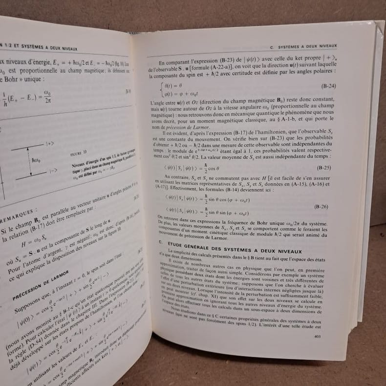 2eme édition revue, 1964 Contents, Chapitres : Préface de Louis de Broglie, vii, introduction, bibliographie, Texte, 299 pages - Introduction mathématique, vecteurs dans un espace de Hilbert - Les principes de la mécanique quantique - Les calculs de la mécanique quantique - Cas des ensembles continus de valeurs propres - Le corpuscule sans spin en mécanique quantique - Le spin - Le calcul des perturbations - Les systèmes à plusieurs électrons - La seconde quantification - Note : Les fonctions sphériques - La relation d'incertitude dans le temps - Problèmes sur le cours - Index - Jean Barriol, né le 2 janvier 1909 à Saint-Martin-des-Besaces (Calvados) et mort le 3 décembre 1989 à Nancy, est un chimiste français. - Mobilisé comme lieutenant dans l'artillerie en 1939, il est fait prisonnier en 1940 et passera 5 cinq ans dans plusieurs Oflag. Il met à profit cette période pour approfondir ses connaissances en physique quantique et dans la théorie mathématique des groupes grâce à des livres qui lui furent envoyés par ses camarades Ulmiens. À l'issue de cette période il présente le résultat de ses recherches dans une thèse intitulée Applications de la théorie des groupes aux vibrations moléculaires et cristallines. - À l'université de Nancy, la chaire de chimie théorique a constitué le noyau de la maîtrise de chimie physique. De cette expérience d'enseignement, Jean Barriol a tiré des ouvrages de références comme son Traité de mécanique quantique, préfacé par Louis de Broglie, paru dès 1952 et dont les rééditions successives attestent le succès. D'autres ouvrages comme Elements of quantum mechanisms with chemical applications ou Espectrocopie dela molecula ou le dernier Éléments de mécanique statistique des systèmes en interaction fortes démontrent le rôle joué par Jean Barriol dans le développement en France et en Europe de la chimie théorique et de ses applications en chimie. - Il fonda à Nancy un laboratoire de recherche de tout premier plan et l'un des premiers associé au Centre national de la recherche scientifique. Dans sa recherche, Jean Barriol s'est beaucoup intéressé à des problèmes de chimie et a consacré une grande partie de son activité à l'étude des propriétés diélectriques des liquides et à une question théorique délicate: l'obtention de grandeurs relatives à une seule molécule à partir de données macroscopiques obtenues sur les liquides purs ou des solutions. (source : Wikipedia) cartonnage très propre, intérieur frais et propre, infime petit manque de papier sur la page de faux-titre (petit trou discret sans manque de texte), cela reste un bel exemplaire