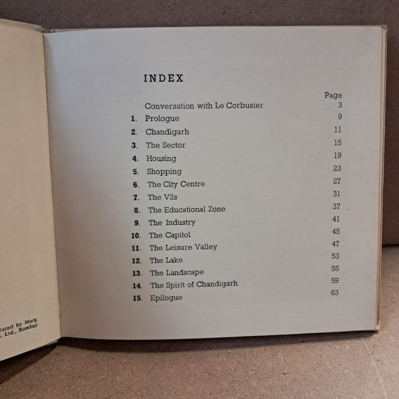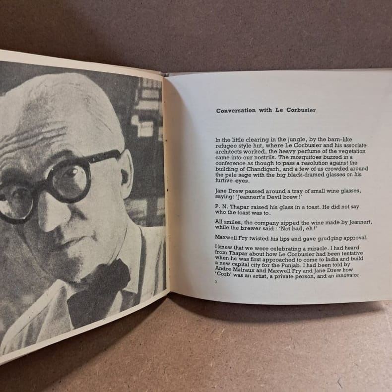 Sans date - cartonné - Publié par Aditya Prakash - Produced by Marg Publications, Bombay - Ouvrage non daté (1978) - In-8 format carré (17,5 x 19 cm) cartonné - 63 pages - Avec une "Conversation with Le Corbusier" de Mulk Raj ANAND - Avec des dessins en noir et blanc hors texte et une photographie en noir et blanc - Sunirmal CHATTERJEE (Sketches) - Dolly SAHIAR (Designer) - Behroze BILIMORIA (Production) - Texte en anglais