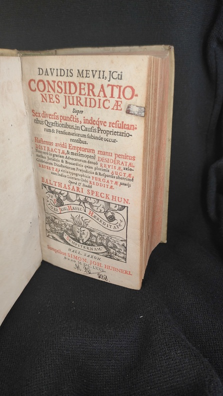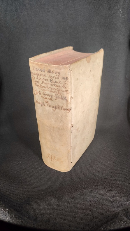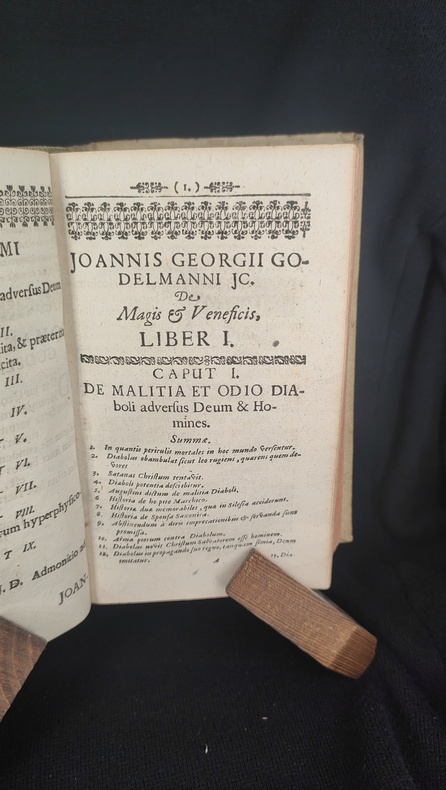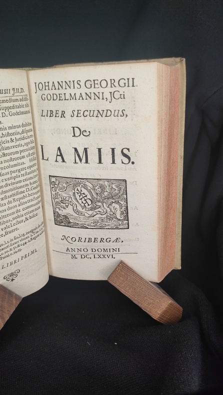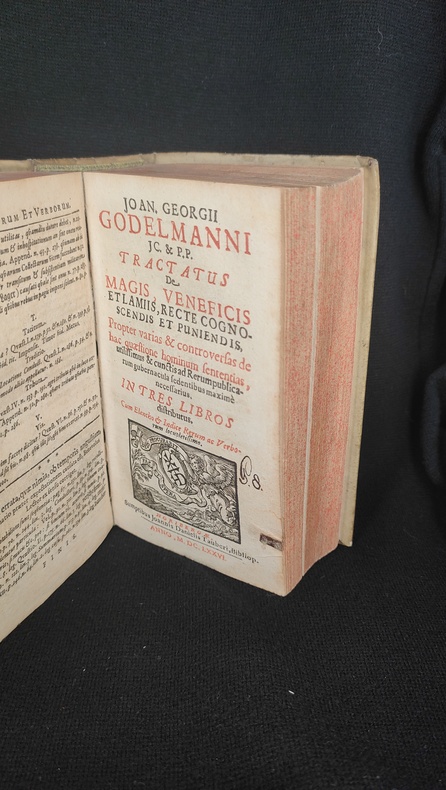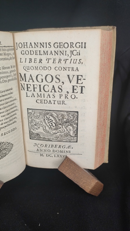 Nuremberg: Johann Daniel Tauber, 1676. Book in Latin and German. In-8. [12], 162; 102; 256, [73] pages, including errata leaf at end. Contemporary vellum, ink title on the spine, occasional light foxing. Title in red & black. Later edition of this work on magic and witchcraft by J.G. Godelmann (1559-1611), German diplomat and professor of law at Rostock University. Book contains 3 parts. The 1st and 2nd part contains information on magic, sorcerers, and witches, the 3rd part dedicates to legal procedures in witchcraft cases. The book was placed on the Index of prohibited books in 1601. Bibliography: Ref. VD-17 1:0629512, Caillet 4226, Coumont G 43.5., Thorndike VI, 535-37. USTC 2589027. Not in BL London. Coumont G 43.5. - "Godelmann's greatest achievement lies in his, for this time, exceptionally decisive stance against the belief in witches". Provenance: From the library of André Lambert, with ex-libris. Ownership sticker: Oskar Gershel, Buchhandlung Stuttgart, Kronprinzstrasse 32. bound with Law book by MEVIUS (David) titled: Considerationes juridicae super Sex diversis punctis, indeque resultantibus Quaestionibus, in Causis Proprietariorum Pensionariorum subinde occurrentibus. Hall. Saxon.[Halle-sur-Saale], Sumptibus Simon. Joh. Hubneri, 1675.