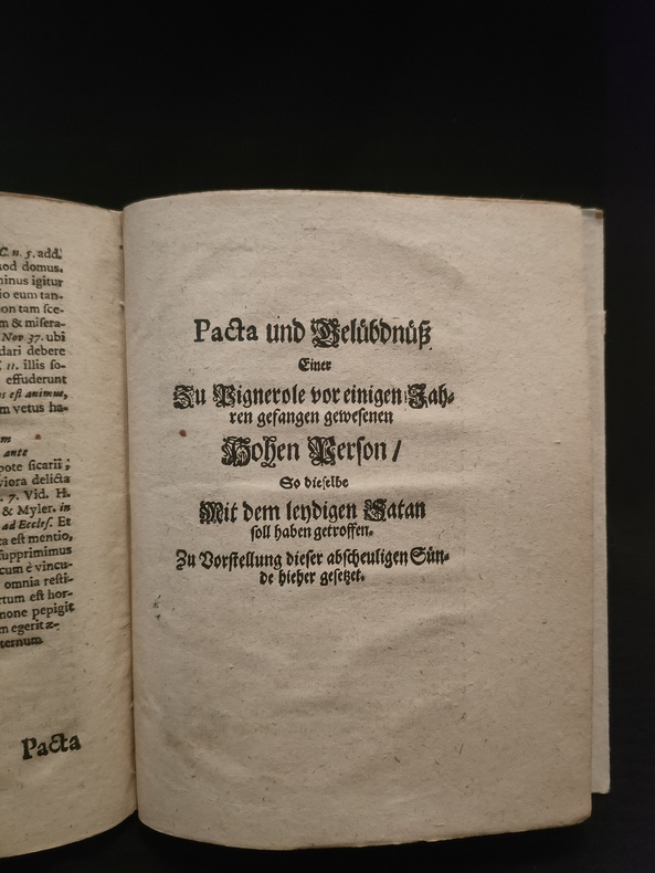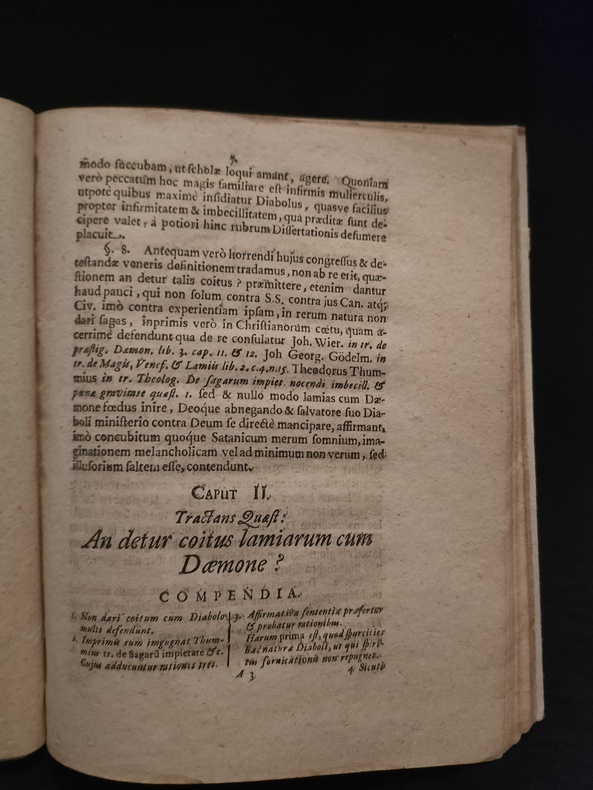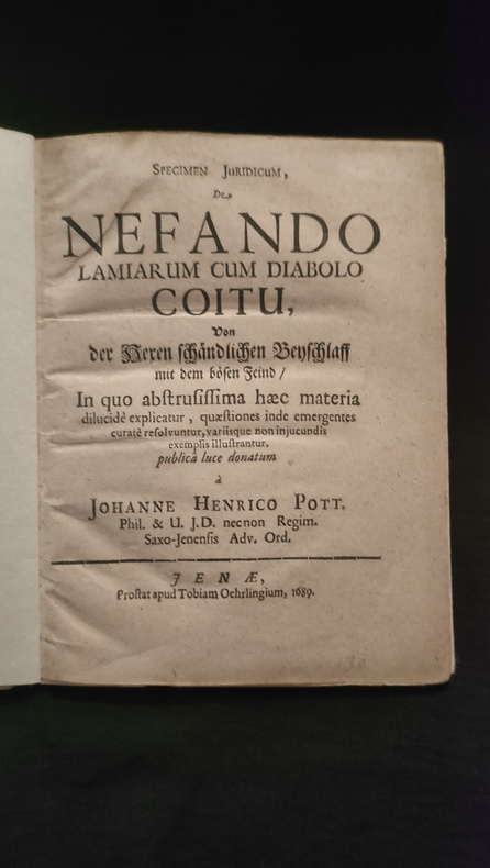 Jenae, T. Oehrlingium, 1689. Book in Latin and German. Small In-4. Pp. [8] 72, later XIX c. rubbed boards, joints worn, linen back and modern endpapers. Gothic lettering, wide margins, some light browning. Title in black. Otherwise very clean without any anotations or marks. Complete. 1st and only one edition of this extremely rare work on demonology by Johann Henric Pott, "who discovered witches in the county of Lancaster". This is a very rare volum dedicated to sexual cooperation between witches and demons. The author shares the same opinion as the Johann Sprenger and Martin Del Rio in the 16th century. For them, all demons are capable of reproducing, and they cites "amusing examples," since incubi have animal forms, and there are women who, as a consequence of their abominable relations with demons, have given birth to all sorts of animals (cat, dog, etc.) or different type of monsters. Bibliography: Cornell, Witchcraft Collection, p. 515, Coumont (P63.1), Bibliotheca magica et pneumatica, VII. 30, USTC No.2565741 and USTC No. 2591565. Provenance: From the Beltrame Collection (?).