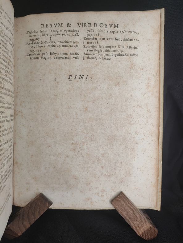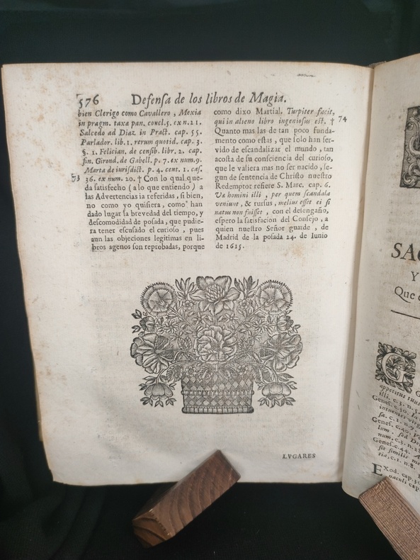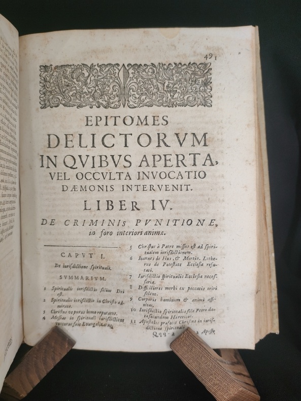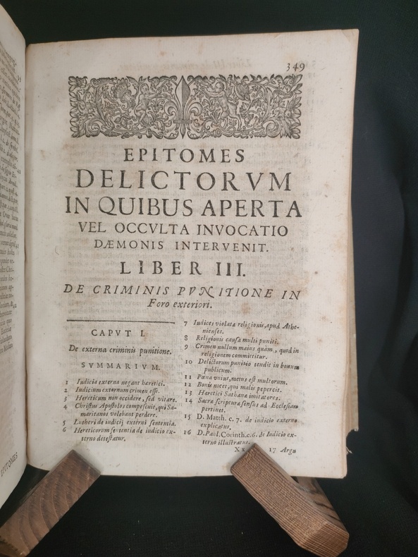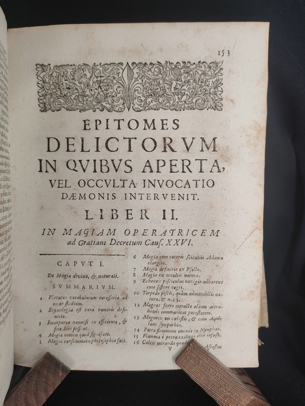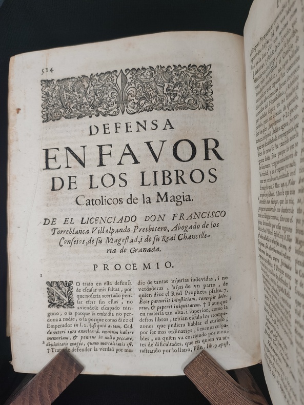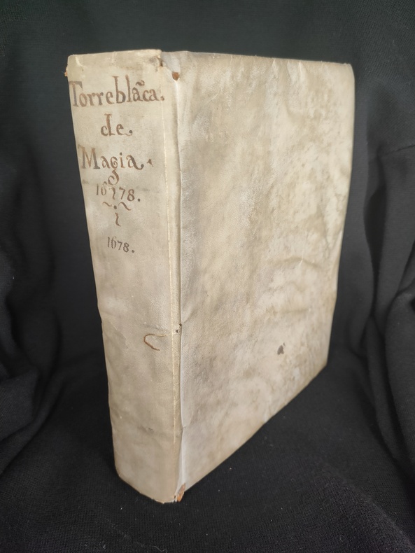 Lugduni (Lyon), sumpt. J. A. Huguetan, 1678. Book in Latin. In-4. Collation: [8], 576, [104]. Original full vellum, ink title on the spine. Title in red & black. Armorial bookplate of the Prince of Lichtenstein on the front pastedown. First and last blank endpapers intact. Some wear and soiling to vellum. Foxing. Overall Very good. Complete. 3rd edition of Summary of Crimes, or On Magic: In which open or hidden invocation of the demon intervenes, is a comprehensive legal guide on defining, identifying, and prosecuting acts of magic, witchcraft, and sorcery, heavily influenced by the Spanish Inquisition and demonological theory. The work categorizes different types of magic—distinguishing between "open" (explicit pacts) and "hidden" (implicit/superstitious) invocation of demons. It was a standard reference for canon law and criminal issues related to magic in the 17th century, including its use in Spanish and Portuguese colonial contexts. Book is devided into 4 parts + "Defensa". Pages 514-76 contain the author's "Defensa de los Libros Católicos de la Magia". Bibliography: Caillet 10764; Cornell Witchcraft Collection 53; Graesse (Magica) 53; Palau 334.827; Thorndike VII, 326-30; USTC No. 6080367; Coumont T.33.3; Goldsmith T-444; Crowe 551; OCLC: 11407716; Robbins 1026. "The work is divided into four books devoted to divining magic, operative magic, and its punishment in the forum exterior and juridical, and in the interior tribunal of the soul and confessional. Magic is defined after Proclus and Psellus as an exacter knowledge of secret things in which, by observing the course and influence of the stars and the sympathies and antipathies of particular things, they are applied to one another at the proper time and place and in the proper manner, so that marvels are worked. Torreblanca turns to diabolical magic and the extent of the powers of the devil to make it possible. Torreblanca has jumbled together natural and diabolical magic almost inextricably, but his remaining chapters are on witchcraft, with the two last on natural and divine remedies against it." (Thorndike VII, A History of Magic and Experimental Science). Provenance: Old Ex libris - (library ?) Lichtensteinianis (Armorial bookplate of the Prince of Lichtenstein?).