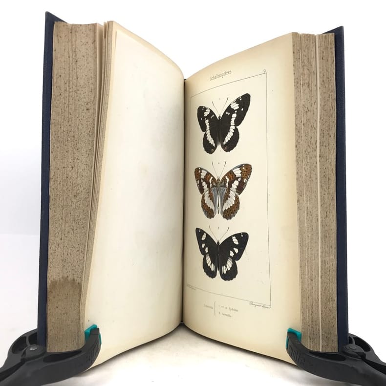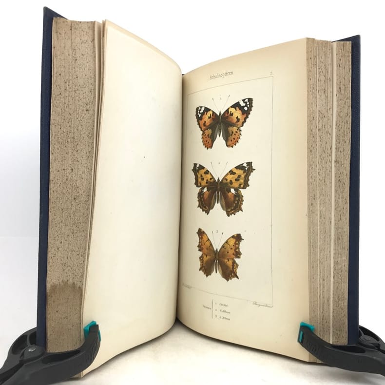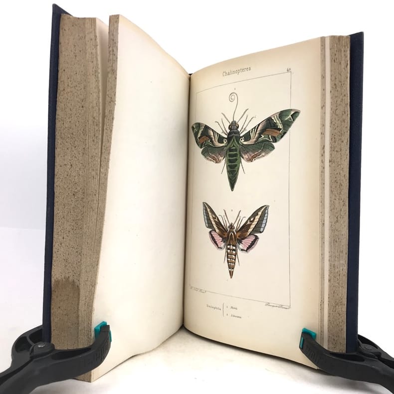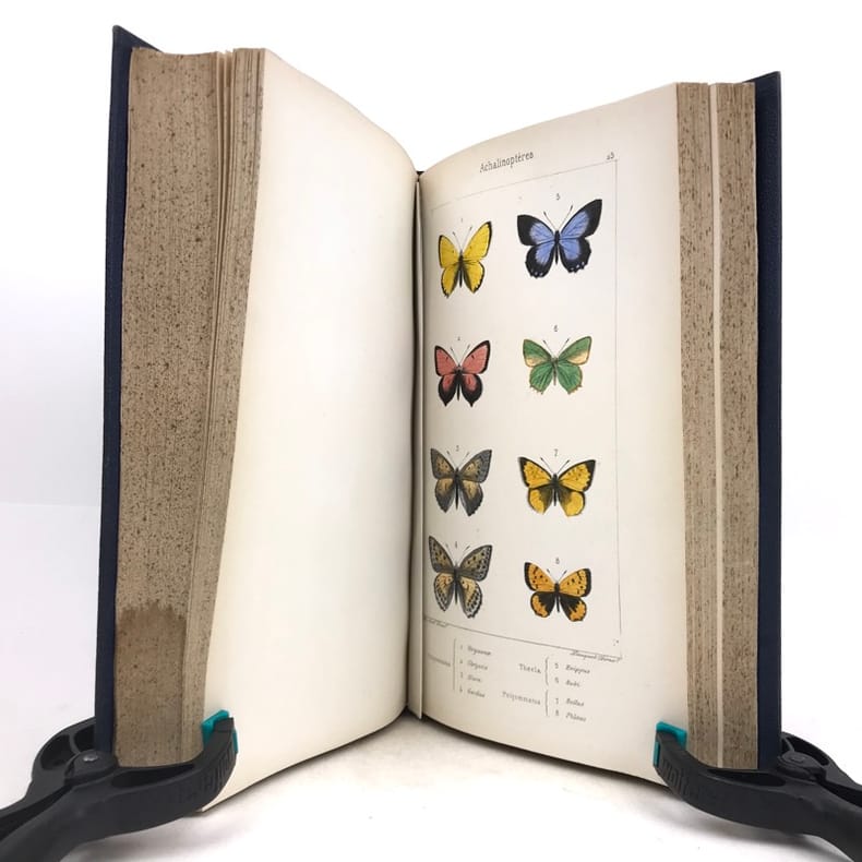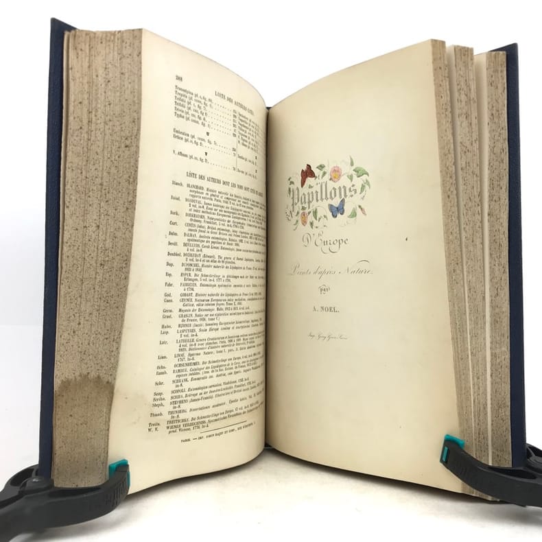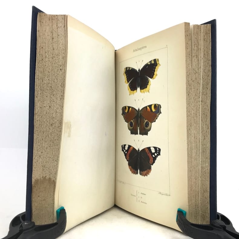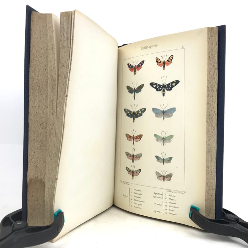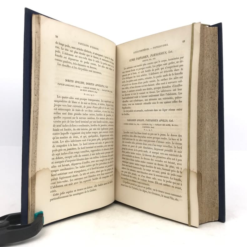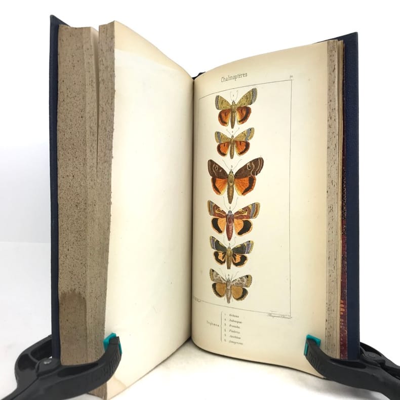 Deuxième édition. Illustré de 80 planches hors texte gravées sur acier par Pauquet et rassemblant près de 400 papillons coloriés à la main par A. Noël. Illustré également d'une page de titre en couleurs et de 2 planches en noir (instruments). Rousseurs sur les pages de texte mais n'affectant pas les planches, mors de la reliure partiellement fendus, néanmoins bon exemplaire.