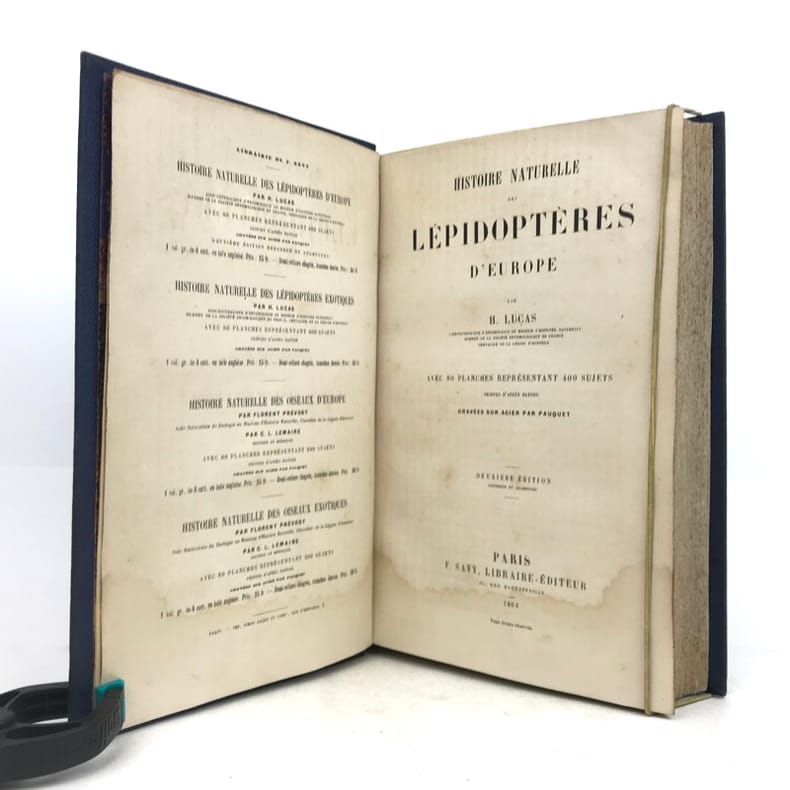 1 volume in-8 (22 x 14,5 cm), chagrin bleu (reliure de l’époque), dos lisse orné, tranches mouchetées, [4]-288-[1] pages (complet). Mouillures en queue des feuillets de texte, ayant épargné les planches. État très correct tout de même. Nouvelle édition augmentée, et illustrée de 82 planches situées in-fine, en couleurs. Pierre Hippolyte Lucas (1814-1899) est un entomologiste français, frère de Prosper Lucas. Il travailla au Jardin des plantes de Paris et s'attacha particulièrement à l'étude des lépidoptères, qu’il présente ici suivant la classification Cuvier en trois divisions : diurnes, crépusculaires et nocturnes. Agréable exemplaire.