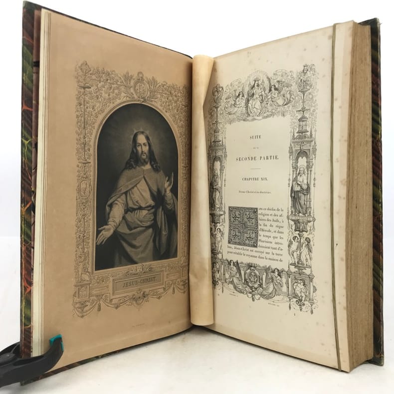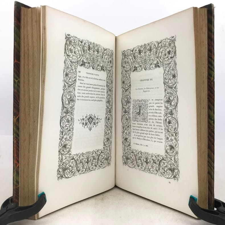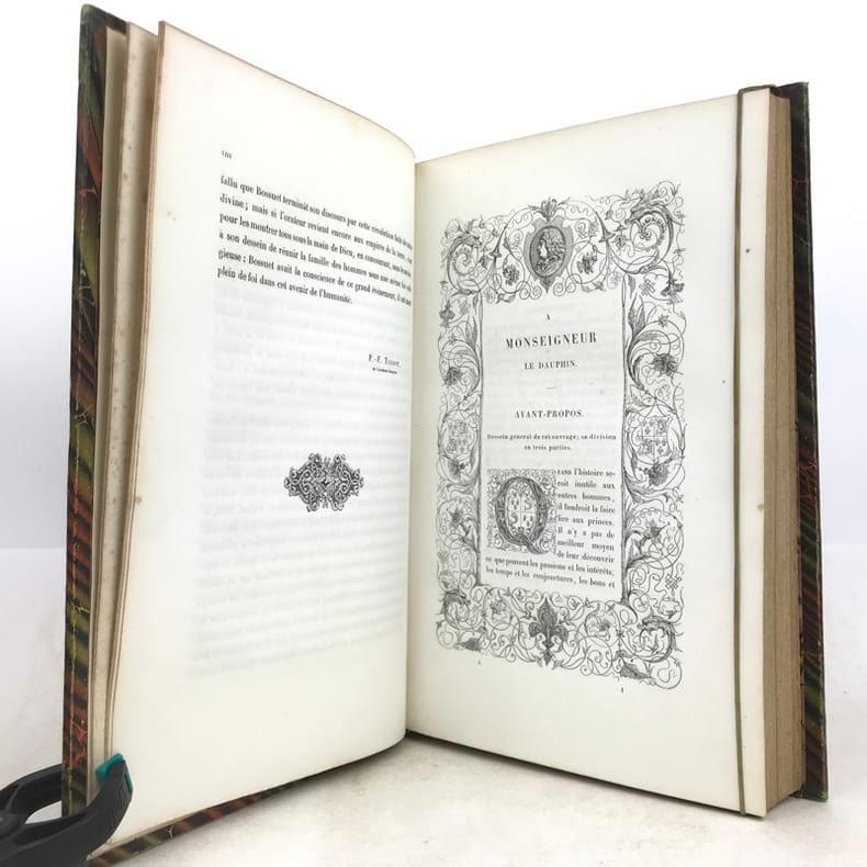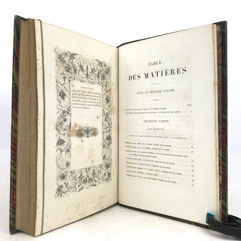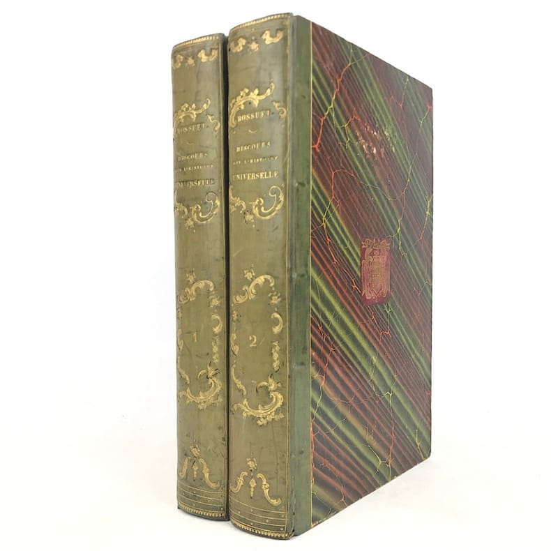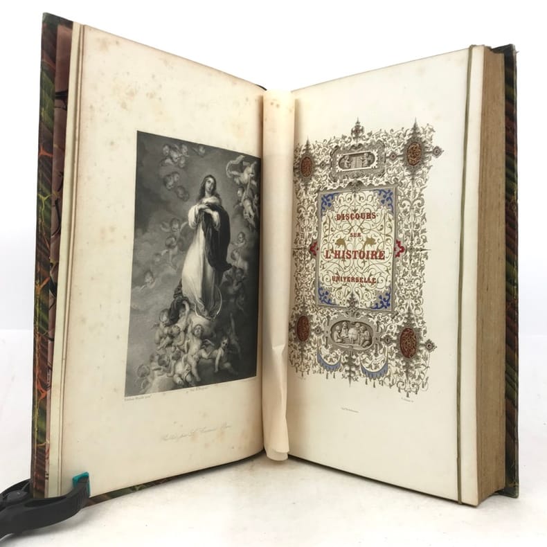 2 volumes in-4 (28,5 cm x 17,5 cm), demi-veau vert (reliure de l'époque), dos lisse à motifs dorés, pièce de cuir au centre des plats doré au blason d’Avignon. [4]-viii-475-1 bl. ; [4]-523-[1] pages (complet). Légers frottements à la reliure, ex-libris cancelé sur le contreplat, rousseurs éparses, quelques feuillets et planches brunis. État très correct. Nouvelle édition illustrée de 2 frontispices, de 2 titres gravés ainsi que de 10 planches hors-texte, d’après Rigaud, de Champaigne, Decaisne, Meissonier, Murillo, Herrera le vieux et Tony Johannot, chacune présentée dans un bel encadrement gravé. Elle comprend également plusieurs vignettes gravées sur bois essentiellement d’après Meissonier et chaque page est en outre ornée d’un encadrement gravé sur bois, différent selon les parties. Le Discours sur l'histoire universelle se divise en trois parties : « Les Époques », « La Suite de la religion » et « Les Empires ». La première partie relate les principaux événements qui se sont déroulés depuis la création du monde ; la deuxième partie décrit l'avènement du christianisme, préfiguré par Moïse, et la victoire de l'Église catholique ; la troisième partie s'attache à dépeindre la grandeur et la décadence des empires de l'Antiquité, finalement unifiés par l'Empire romain, lui-même diffuseur de l'Évangile. Le propos de Bossuet y est apologétique en ce sens que l'histoire du genre humain depuis les origines jusqu'au règne de Charlemagne est envisagée comme une manifestation de la providence divine : pour l'auteur, l'histoire répond à un dessein de Dieu, qui y est intervenu afin de voir triompher le christianisme. Bon exemplaire.