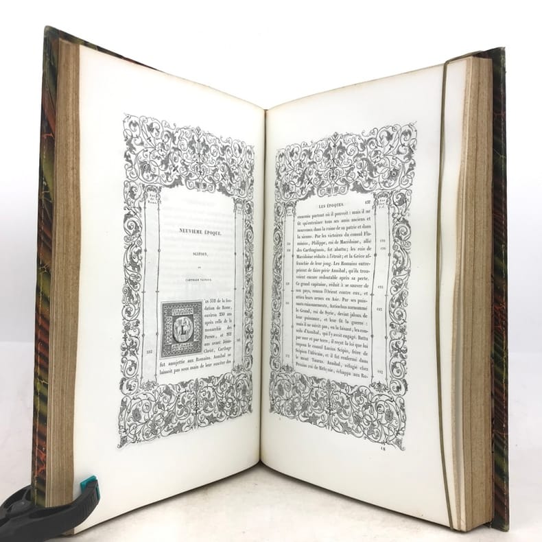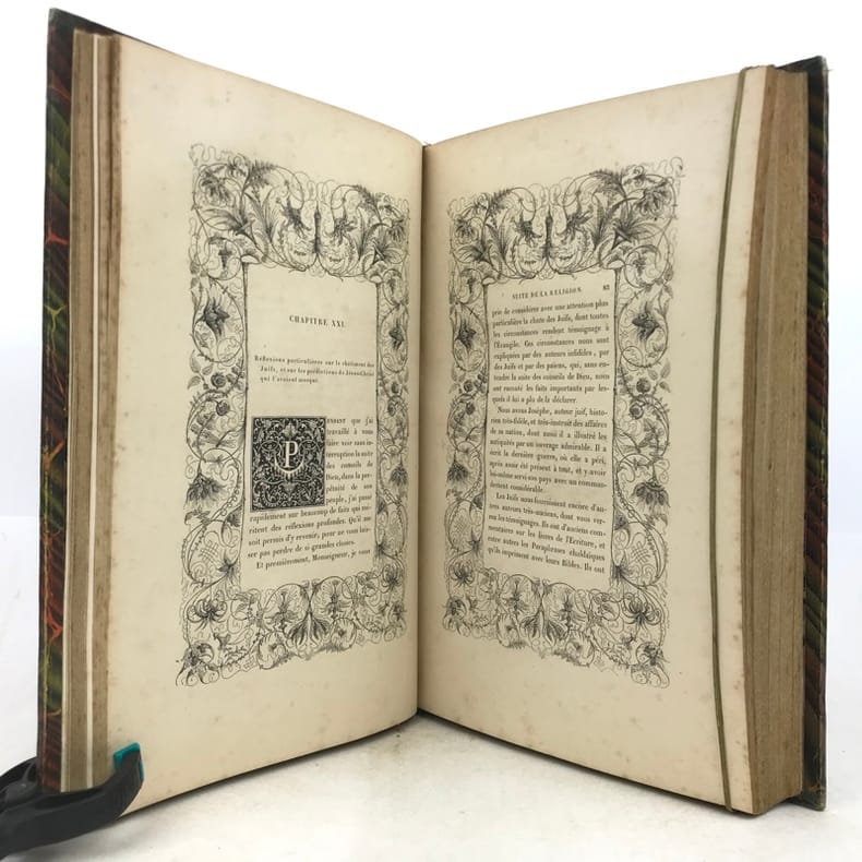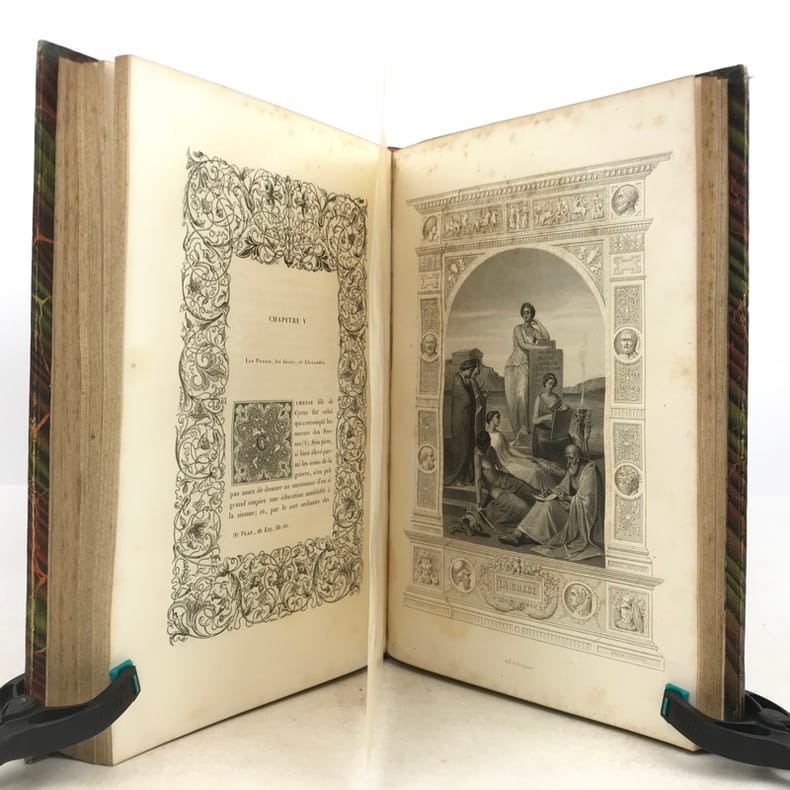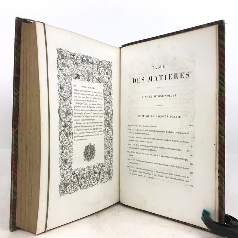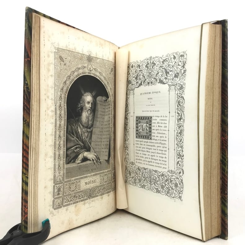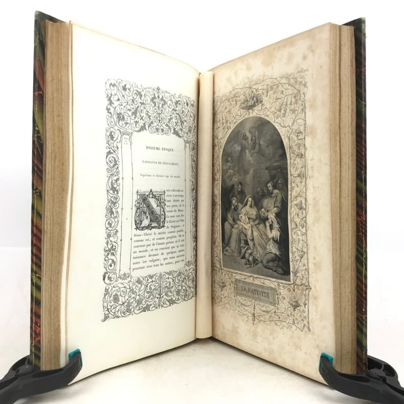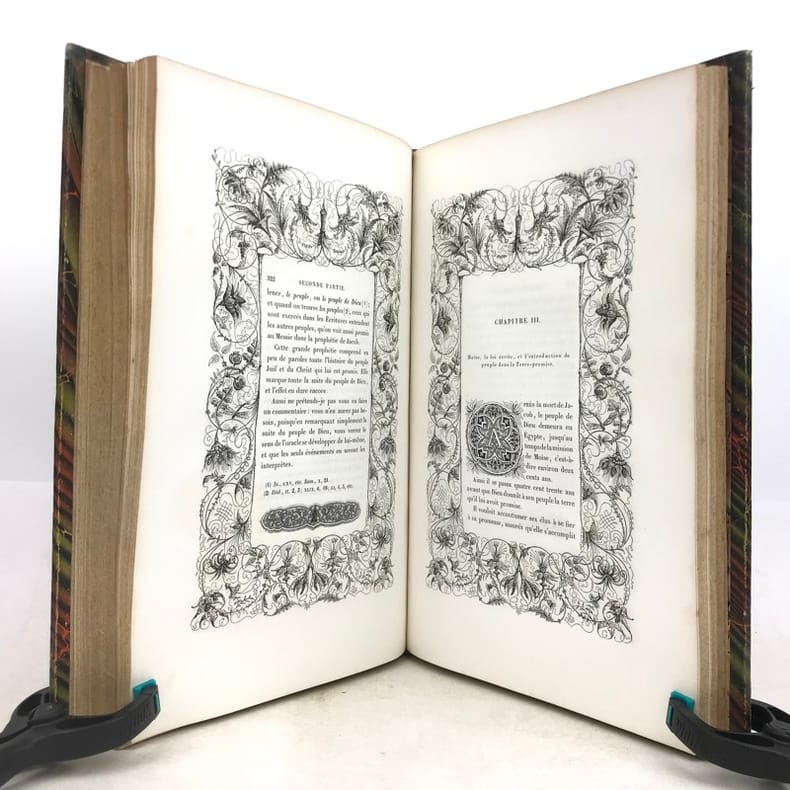 2 volumes in-4 (28,5 cm x 17,5 cm), demi-veau vert (reliure de l'époque), dos lisse à motifs dorés, pièce de cuir au centre des plats doré au blason d’Avignon. [4]-viii-475-1 bl. ; [4]-523-[1] pages (complet). Légers frottements à la reliure, ex-libris cancelé sur le contreplat, rousseurs éparses, quelques feuillets et planches brunis. État très correct. Nouvelle édition illustrée de 2 frontispices, de 2 titres gravés ainsi que de 10 planches hors-texte, d’après Rigaud, de Champaigne, Decaisne, Meissonier, Murillo, Herrera le vieux et Tony Johannot, chacune présentée dans un bel encadrement gravé. Elle comprend également plusieurs vignettes gravées sur bois essentiellement d’après Meissonier et chaque page est en outre ornée d’un encadrement gravé sur bois, différent selon les parties. Le Discours sur l'histoire universelle se divise en trois parties : « Les Époques », « La Suite de la religion » et « Les Empires ». La première partie relate les principaux événements qui se sont déroulés depuis la création du monde ; la deuxième partie décrit l'avènement du christianisme, préfiguré par Moïse, et la victoire de l'Église catholique ; la troisième partie s'attache à dépeindre la grandeur et la décadence des empires de l'Antiquité, finalement unifiés par l'Empire romain, lui-même diffuseur de l'Évangile. Le propos de Bossuet y est apologétique en ce sens que l'histoire du genre humain depuis les origines jusqu'au règne de Charlemagne est envisagée comme une manifestation de la providence divine : pour l'auteur, l'histoire répond à un dessein de Dieu, qui y est intervenu afin de voir triompher le christianisme. Bon exemplaire.