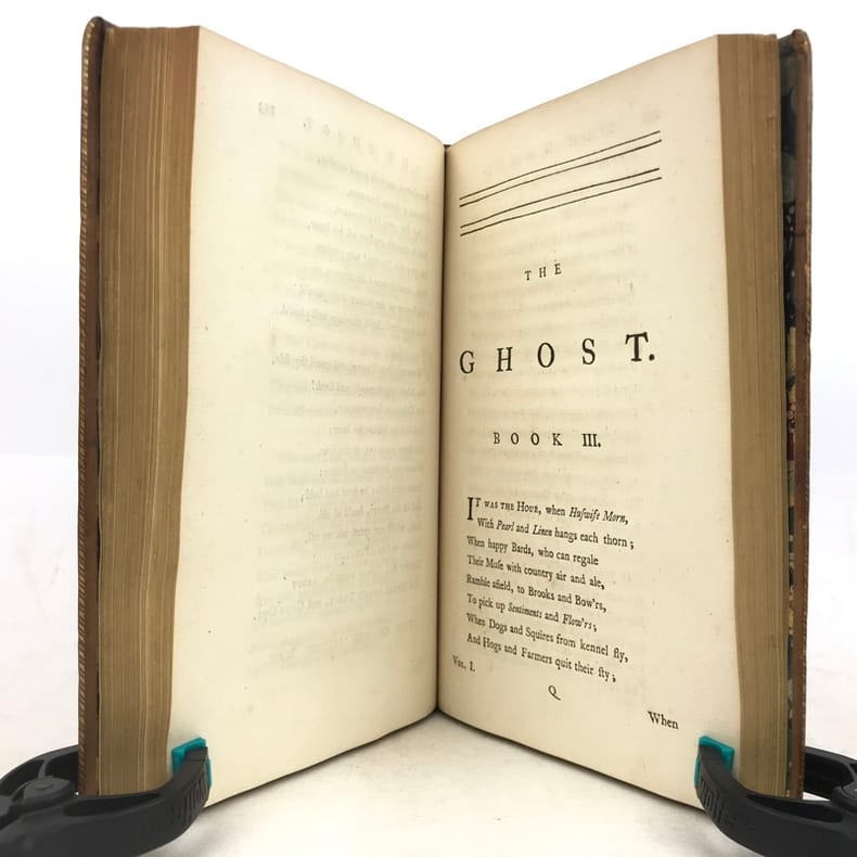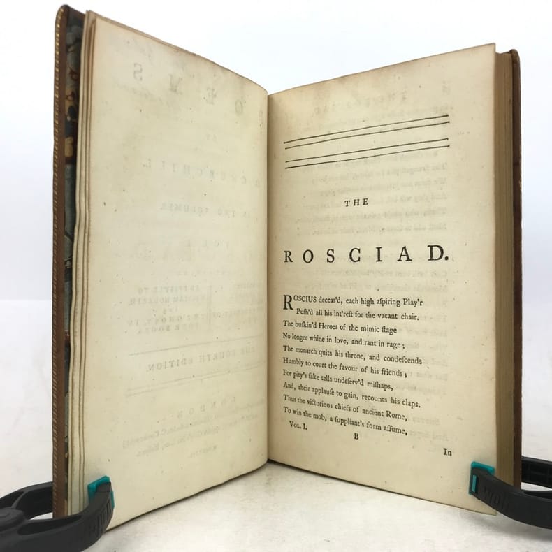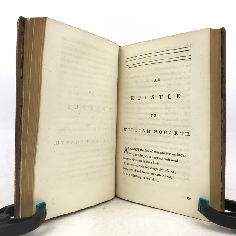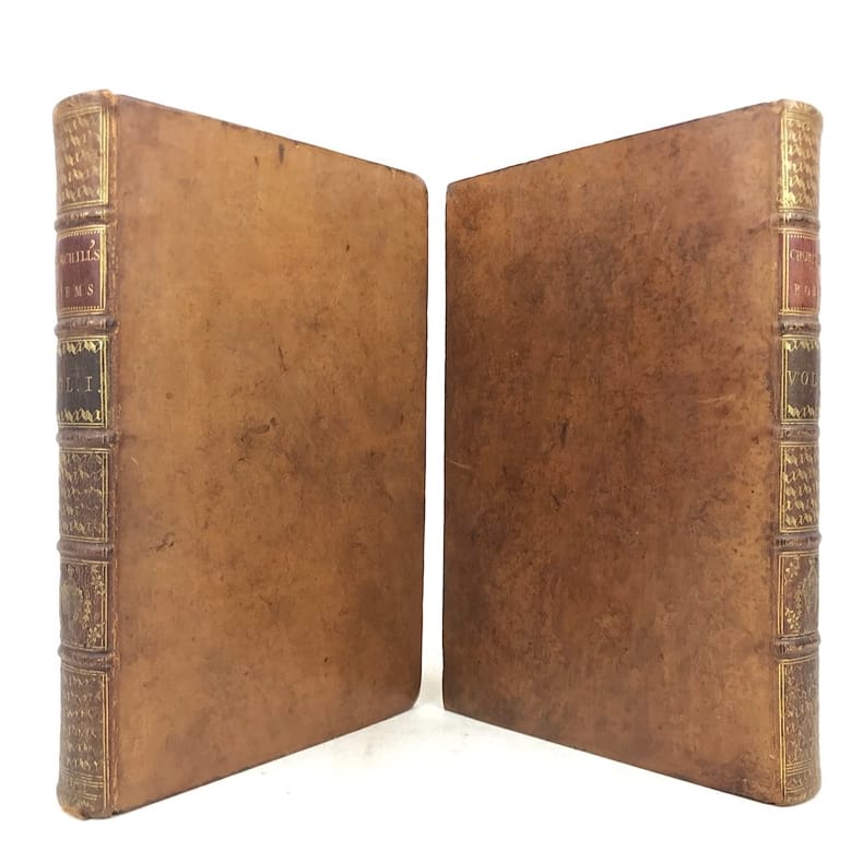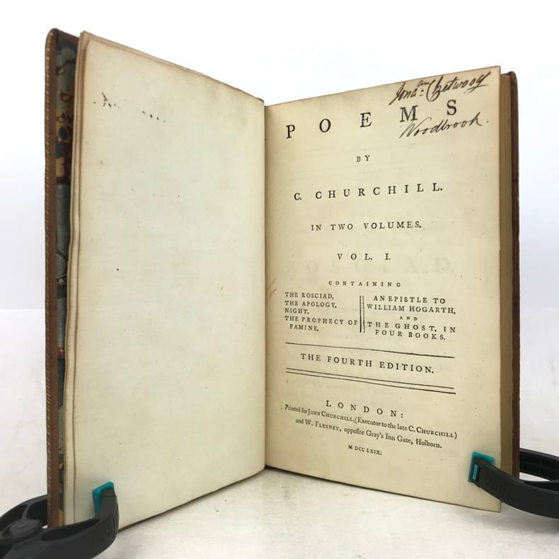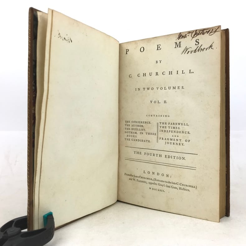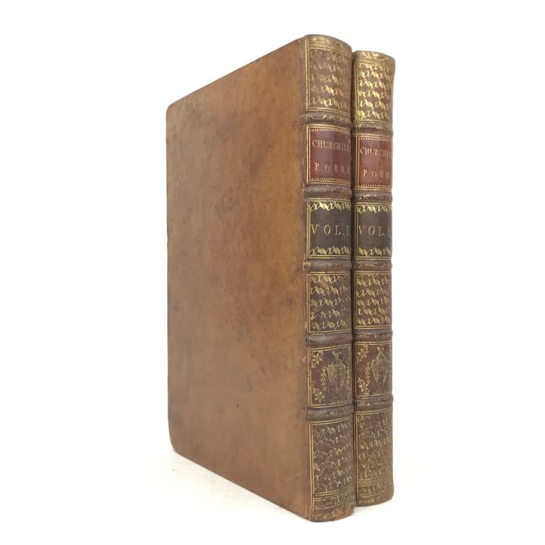 2 volumes in-8 (20,8 x 13,5 cm), veau blond (reliure de l’époque), dos à nerfs et caissons ornés, roulette dorée sur les coupes, pièce de titre de maroquin rouge et de tomaison brune, ex-libris sur le contreplat et le titre. [2]-369-1 bl. ; [2]-330 pages (complet). Infimes frottements, un petit accroc en queue, rares rousseurs. Bon état. Quatrième édition contenant The Rosciad, The Apology, Night, The Prophecy of famine, An Epistle to William Hogarth, The Ghost, The Conference, The Author, Gotham, The Candidate, The Farewell, The Times, Independence et Fragment of journey. Charles Churchill (1732–1764) était un poète et critique acerbe anglais. Il suit son père comme pasteur, vit un mariage malheureux et mène une vie de débauche. Il publie des critiques dans la revue de Smolett. Admirateur de Dryden, il devint avec Wilkes un fervent défenseur de la liberté de la presse et en explora les frontières. Provenance : de la bibliothèque de Jonathan Chetwood, Esq., parlementaire, avec son ex-libris gravé et un autre manuscrit sur le titre, et de celle de Remy G. Saisselin, avec son ex-libris. Bon exemplaire.