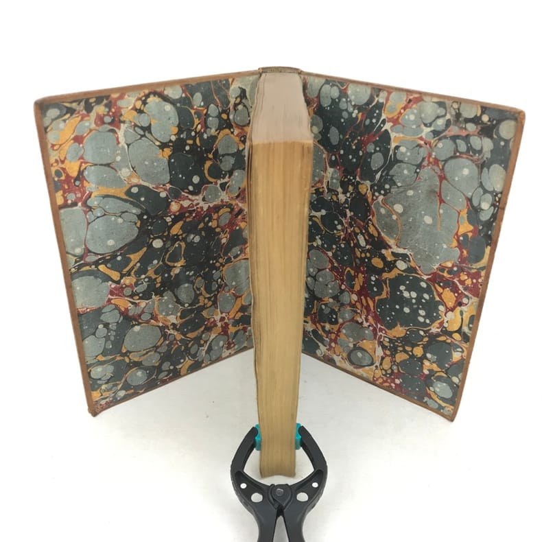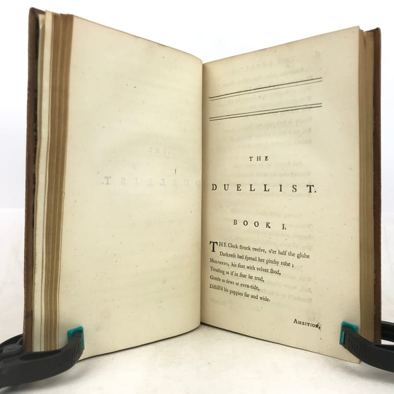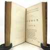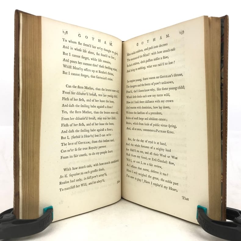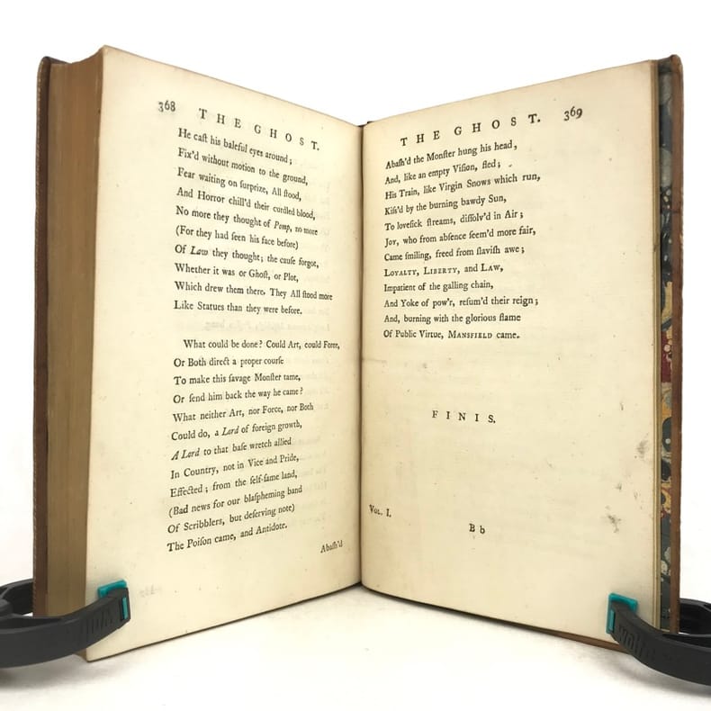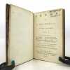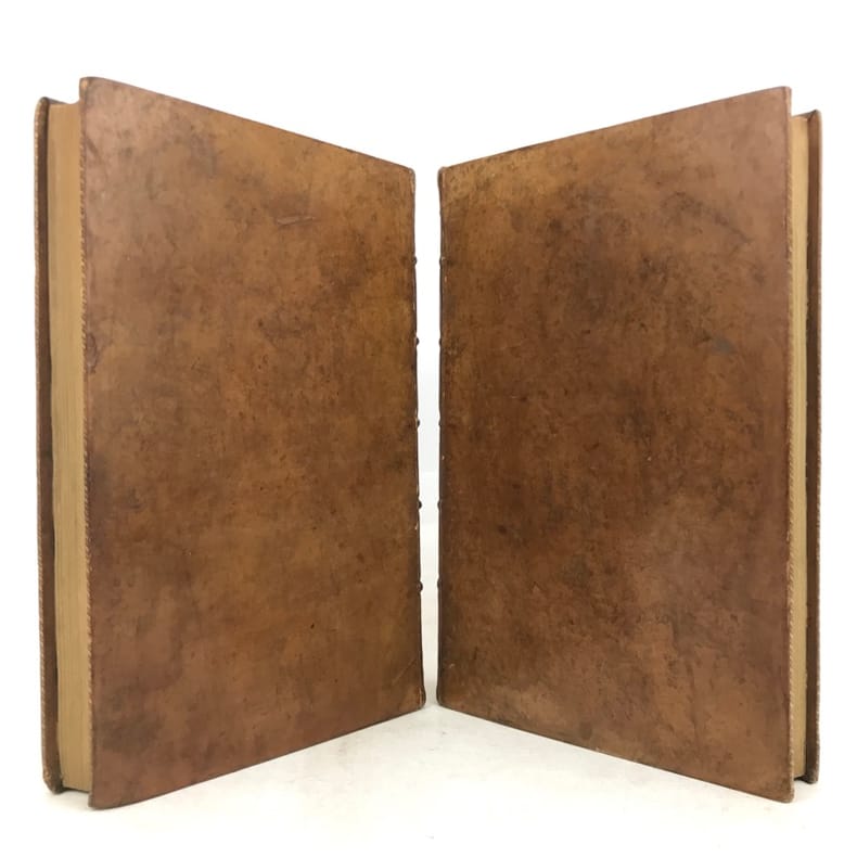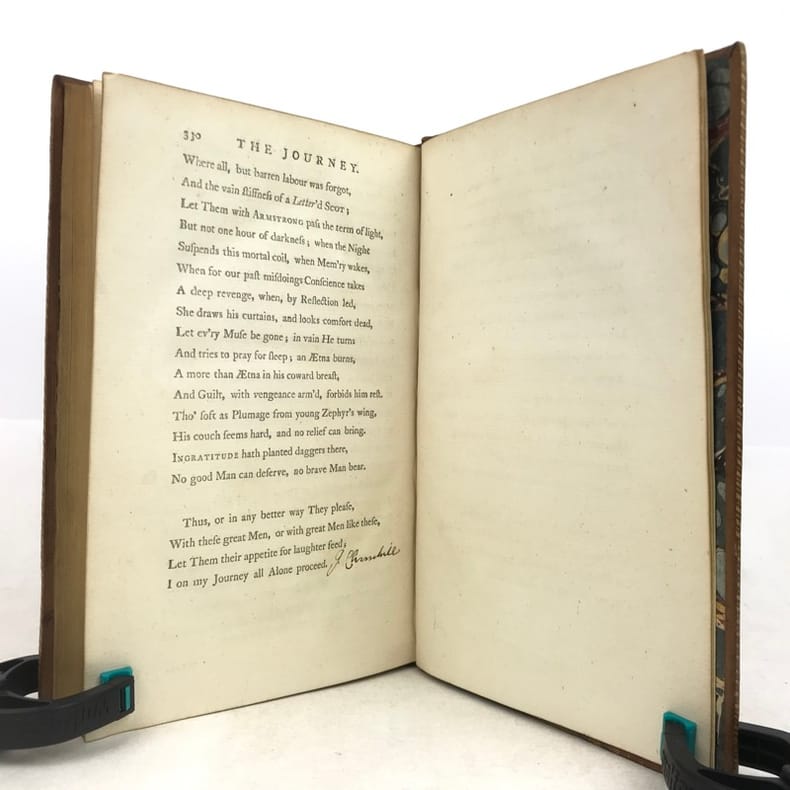 2 volumes in-8 (20,8 x 13,5 cm), veau blond (reliure de l’époque), dos à nerfs et caissons ornés, roulette dorée sur les coupes, pièce de titre de maroquin rouge et de tomaison brune, ex-libris sur le contreplat et le titre. [2]-369-1 bl. ; [2]-330 pages (complet). Infimes frottements, un petit accroc en queue, rares rousseurs. Bon état. Quatrième édition contenant The Rosciad, The Apology, Night, The Prophecy of famine, An Epistle to William Hogarth, The Ghost, The Conference, The Author, Gotham, The Candidate, The Farewell, The Times, Independence et Fragment of journey. Charles Churchill (1732–1764) était un poète et critique acerbe anglais. Il suit son père comme pasteur, vit un mariage malheureux et mène une vie de débauche. Il publie des critiques dans la revue de Smolett. Admirateur de Dryden, il devint avec Wilkes un fervent défenseur de la liberté de la presse et en explora les frontières. Provenance : de la bibliothèque de Jonathan Chetwood, Esq., parlementaire, avec son ex-libris gravé et un autre manuscrit sur le titre, et de celle de Remy G. Saisselin, avec son ex-libris. Bon exemplaire.