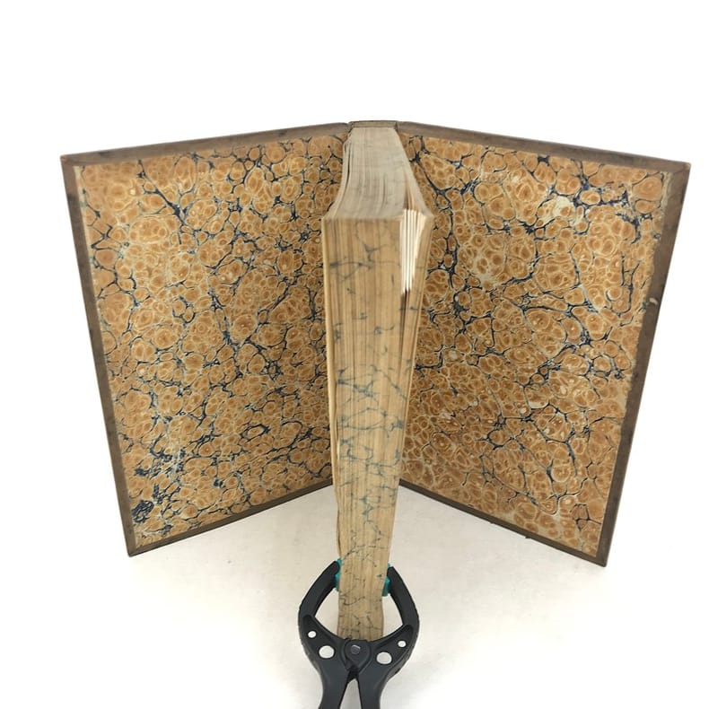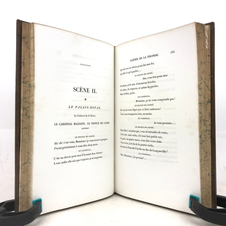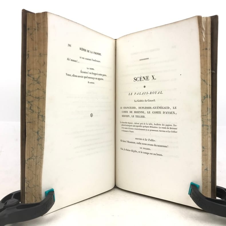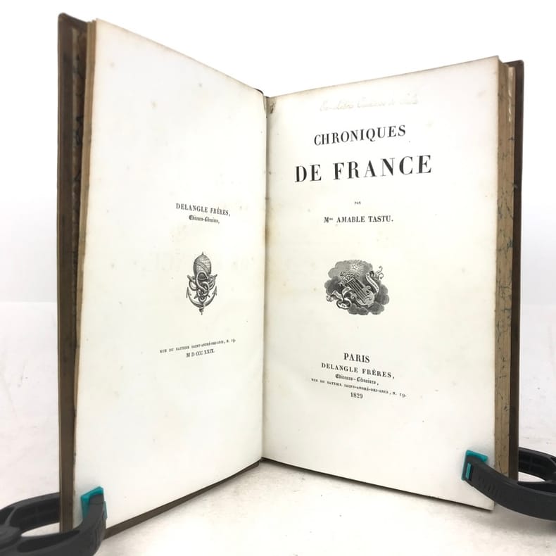 Techener 14,3 x 19,3 Paris 1836 Six volumes petits in-8, 1836-1838, reliure demi-chagrin marron de l'époque (signée Fechoz), dos à cinq nerfs orné de filets dorés, titres et tomaisons dorés, dates dorées en pied des dos, papier marbrés pour les plats et les gardes, tranches supérieures dorées, XXXV-384, XVII-410, 418, 431, 497, 504 pp., gravure en frontispice du premier volume. Première édition complète des Grandes Chroniques de France, dites "Chroniques de Saint-Denis", "roman des rois" et compilation historiographique, rédigées sur l'ordre de Saint-Louis, initiées à l'abbaye de Saint-Denis et poursuivies par ses successeurs (XIIIe - XVe siècles. Bonne reliure, coins en très bon état, rousseurs éparses. (EvB57) PHOTOS NUMERIQUES DISPONIBLES PAR EMAIL SUR SIMPLE DEMANDE-DIGITAL PHOTOGRAPS MAY BE AVAILABLE ON REQUEST Livre