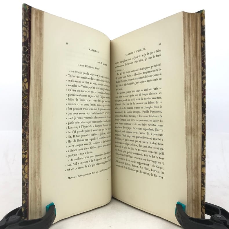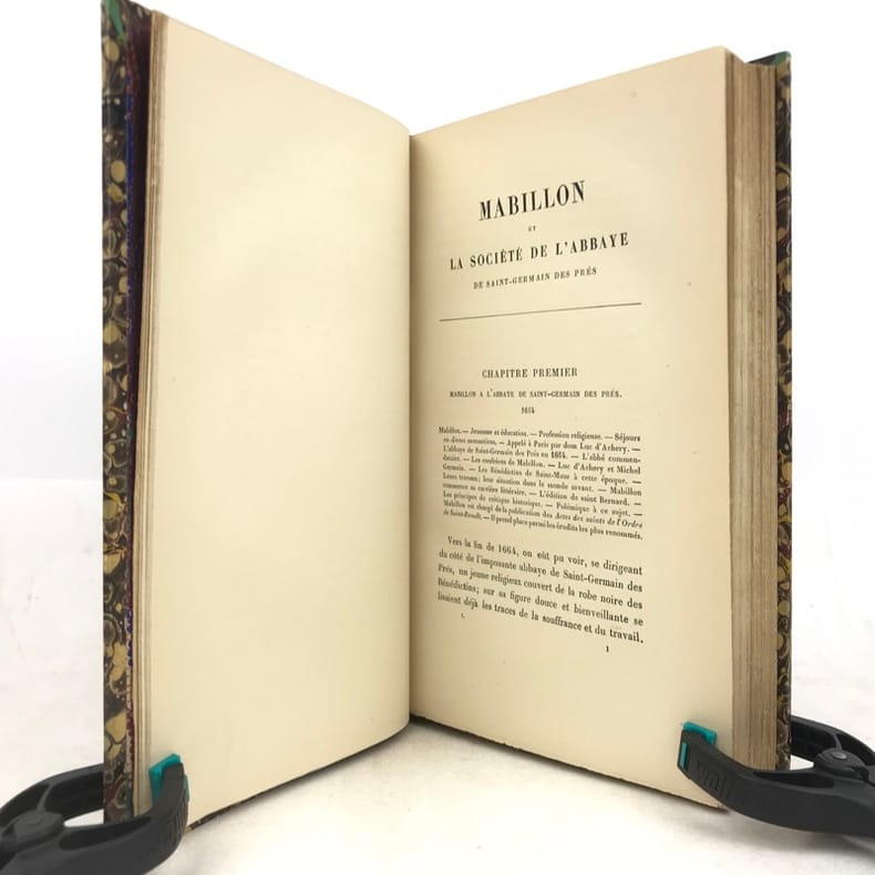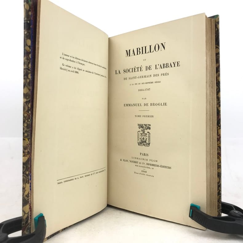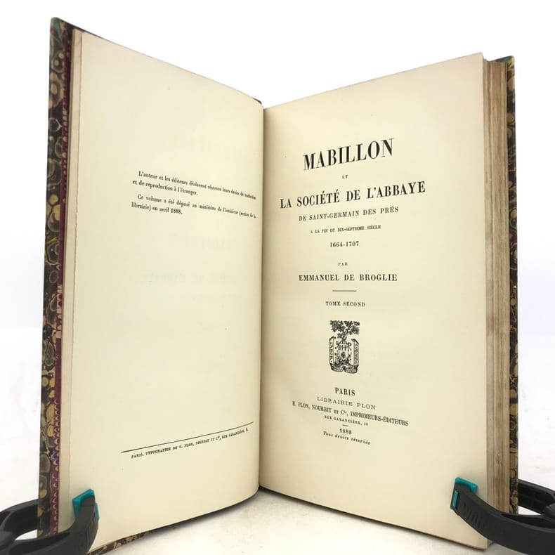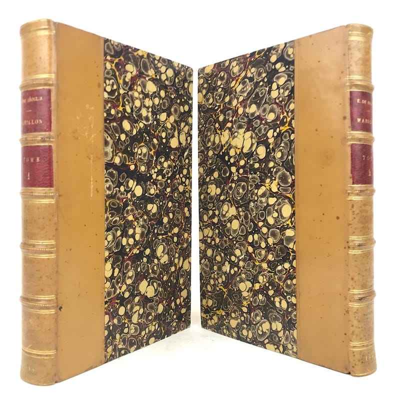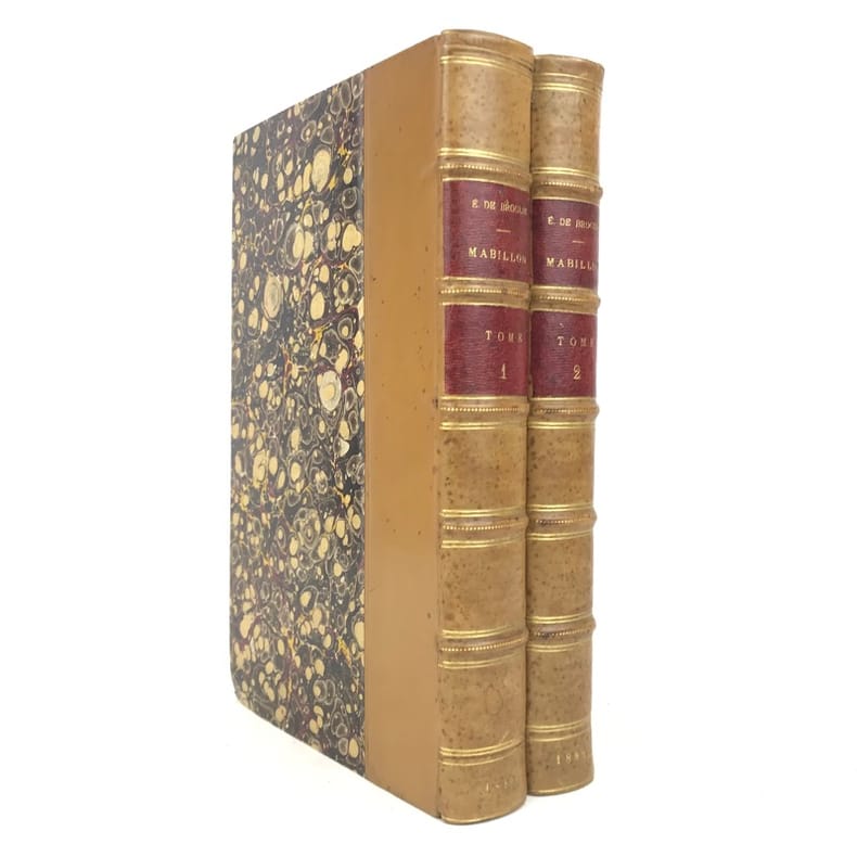 2 volumes in-8 (22 x 14 cm), demi-veau fauve (reliure de l’époque), couverture conservée, dos à nerfs orné, pièces de titre et de tomaison en maroquin rouge, filet à froid en bordure, tranche de tête marbrée, [4]-xi-[1]-429-[1] ; [4]-390 pages (complet). Taches aux dos, quelques frottement sur le plat supérieur du tome I, pages 157-158 du tome I déchirées sans manque, rousseurs éparses. État correct. ÉDITION ORIGINALE. Emmanuel de Broglie (1854-1926) est un historien français, qui relate ici la vie de Dom Mabillon (1632-1707), moine bénédictin de la congrégation réformée de Saint-Maur, vivant à l’abbaye de Saint-Germain des Prés à partir de 1664. Bon exemplaire.