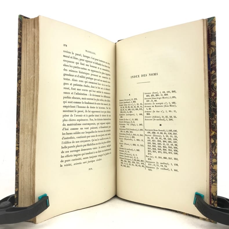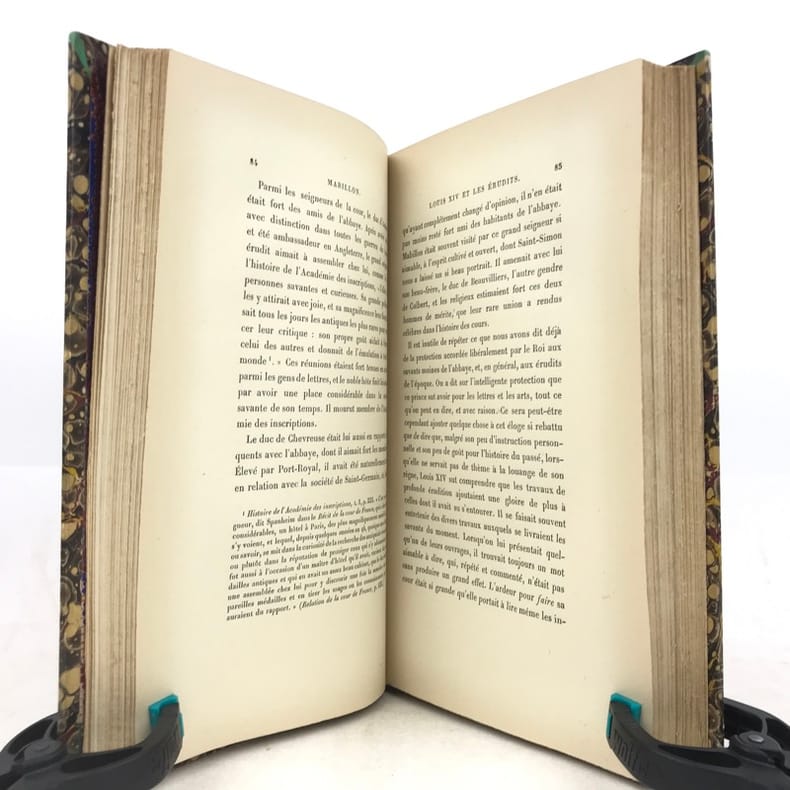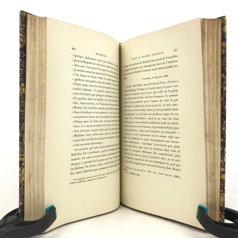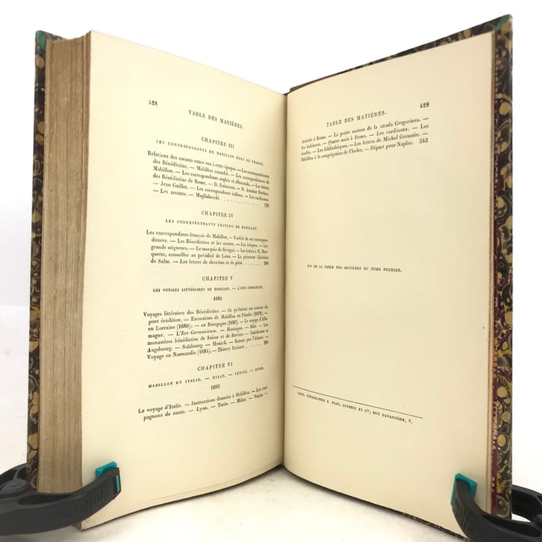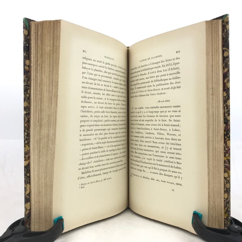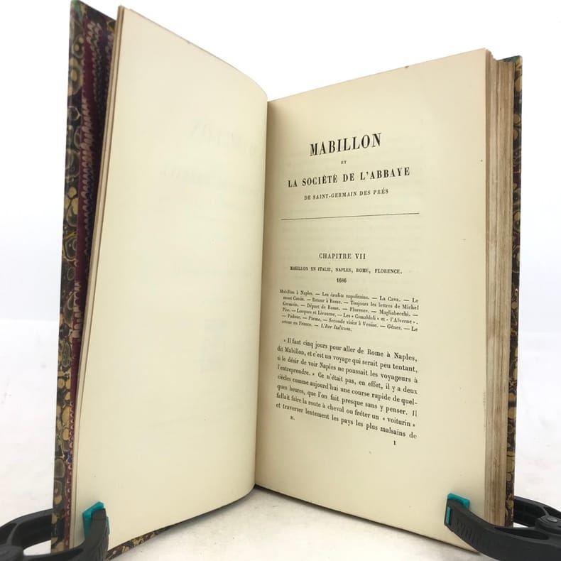 2 volumes in-8 (22 x 14 cm), demi-veau fauve (reliure de l’époque), couverture conservée, dos à nerfs orné, pièces de titre et de tomaison en maroquin rouge, filet à froid en bordure, tranche de tête marbrée, [4]-xi-[1]-429-[1] ; [4]-390 pages (complet). Taches aux dos, quelques frottement sur le plat supérieur du tome I, pages 157-158 du tome I déchirées sans manque, rousseurs éparses. État correct. ÉDITION ORIGINALE. Emmanuel de Broglie (1854-1926) est un historien français, qui relate ici la vie de Dom Mabillon (1632-1707), moine bénédictin de la congrégation réformée de Saint-Maur, vivant à l’abbaye de Saint-Germain des Prés à partir de 1664. Bon exemplaire.