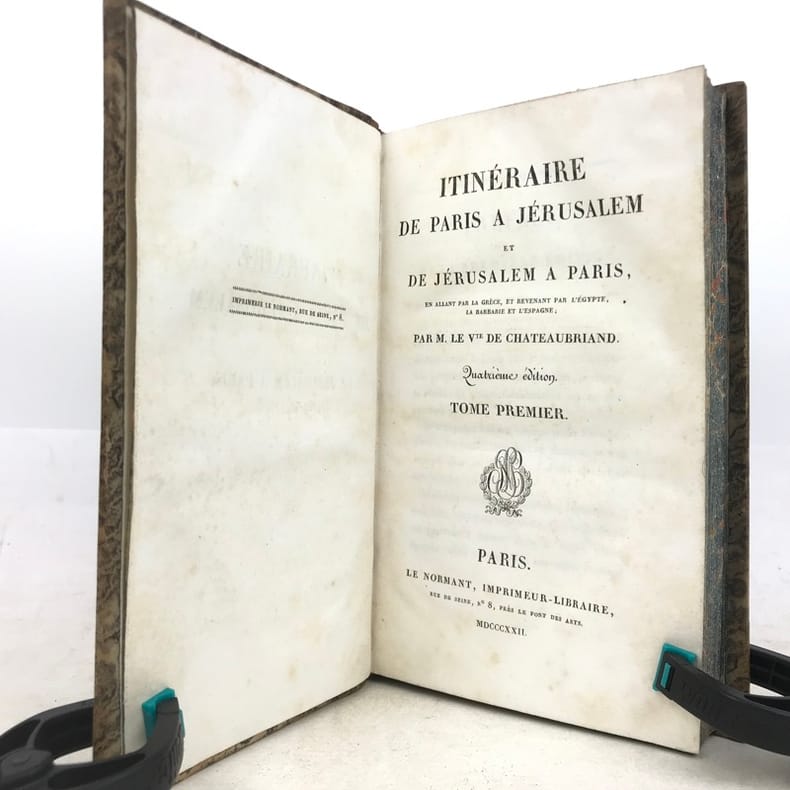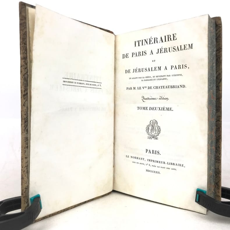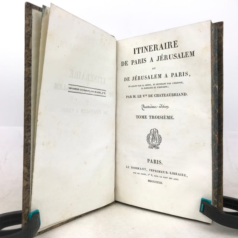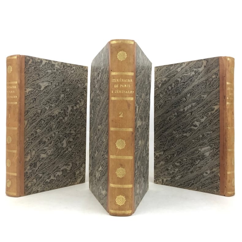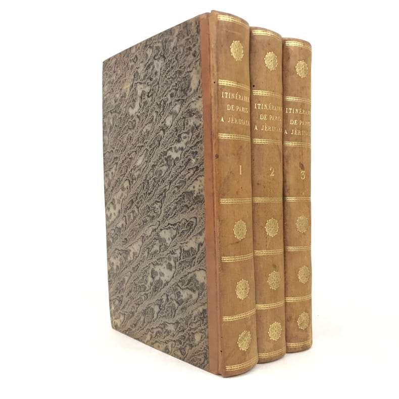3 volumes in-8 (20 x 12,5 cm), demi-veau blond (reliure de l’époque), dos lisses ornés, tranches marbrées. cxx-270 ; [4]-401-1bl. ; [4]-354-[2] pages (complet). Dos insolés, petits frottements aux coiffes, aux charnières, aux chants et aux coins, petites galeries aux charnières, pâles rousseurs éparses sans gêne de lecture, quelques mouillures marginales au tome 2. État très correct. Quatrième édition ornée d’une grande carte dépliante du bassin méditerranéen, dressée par le géographe Lapie, et d’un fac-similé dépliant d'un traité en arabe. Elle reprend les trois précédentes préfaces. La première fut publiée chez le même éditeur, en 1811. La parution de l'Itinéraire de Paris à Jérusalem marque une étape capitale dans l'histoire des Voyages. Ce périple méditerranéen est entrepris dans le but d'aller "chercher des images" pour composer Les Martyrs. C'est donc en professionnel de l'écriture que Chateaubriand (1768-1848), parcourt l'Orient. Son journal de route deviendra une œuvre, dont les qualités littéraires seront unanimement appréciées. Agréable exemplaire.
