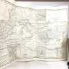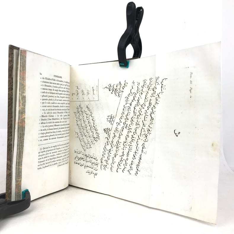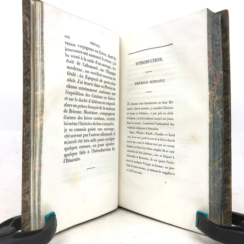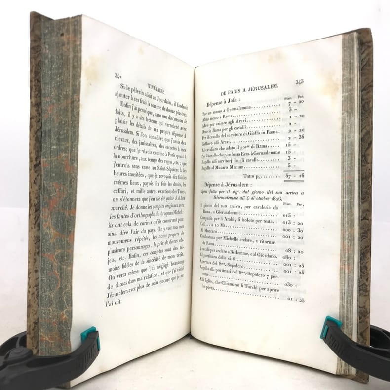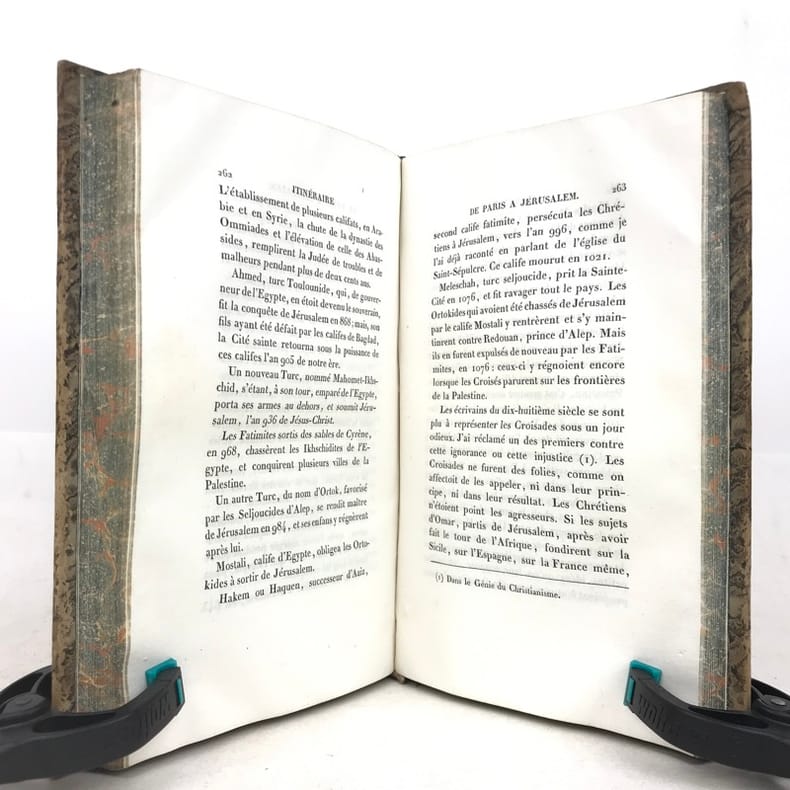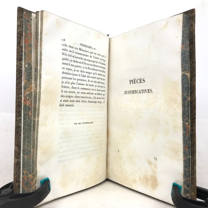 3 volumes in-8 (20 x 12,5 cm), demi-veau blond (reliure de l’époque), dos lisses ornés, tranches marbrées. cxx-270 ; [4]-401-1bl. ; [4]-354-[2] pages (complet). Dos insolés, petits frottements aux coiffes, aux charnières, aux chants et aux coins, petites galeries aux charnières, pâles rousseurs éparses sans gêne de lecture, quelques mouillures marginales au tome 2. État très correct. Quatrième édition ornée d’une grande carte dépliante du bassin méditerranéen, dressée par le géographe Lapie, et d’un fac-similé dépliant d'un traité en arabe. Elle reprend les trois précédentes préfaces. La première fut publiée chez le même éditeur, en 1811. La parution de l'Itinéraire de Paris à Jérusalem marque une étape capitale dans l'histoire des Voyages. Ce périple méditerranéen est entrepris dans le but d'aller "chercher des images" pour composer Les Martyrs. C'est donc en professionnel de l'écriture que Chateaubriand (1768-1848), parcourt l'Orient. Son journal de route deviendra une œuvre, dont les qualités littéraires seront unanimement appréciées. Agréable exemplaire.