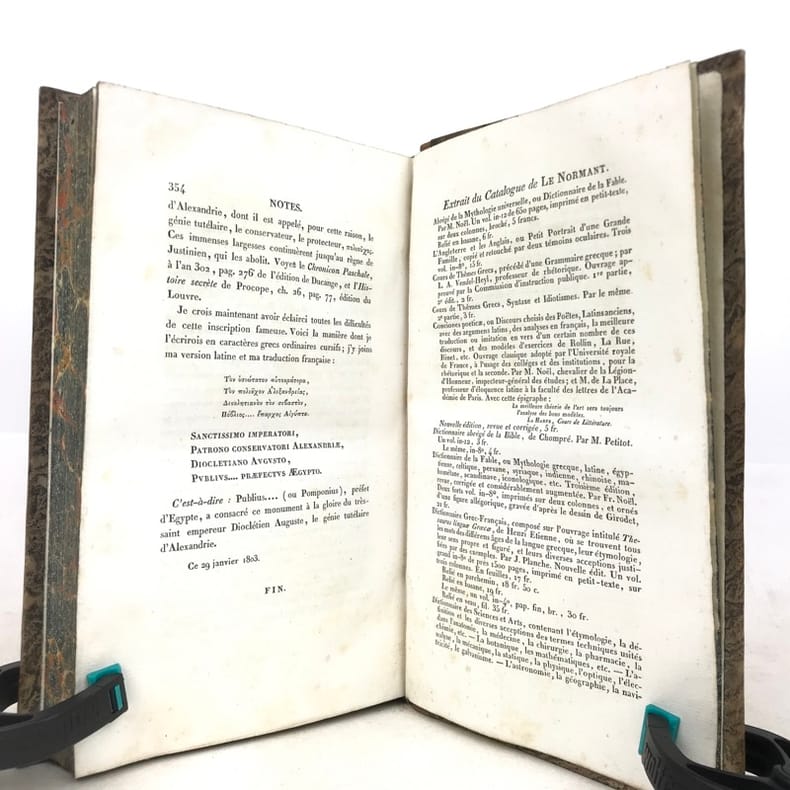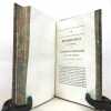 Ensemble complet des trois volumes le constituant ; sous agréables reliures du temps. ''La parution de l’Itinéraire de Paris à Jérusalem marqua une étape capitale dans l’histoire des voyages. Ce périple méditerranéen fut entrepris dans le but d’aller "chercher des images" pour composer Les Martyrs. C’est donc en professionnel de l’écriture que Chateaubriand parcourt l’Orient. Son journal de route deviendra une œuvre, dont les qualités littéraires seront unanimement appréciées. Pour autant, ce texte aux multiples facettes ne saurait se lire en fonction seulement d’une visée esthétique que les voyageurs récusaient volontiers en dénonçant les mensonges du style. L’auteur ne renonce pas totalement à la composante encyclopédique qui définit pour partie le genre en ce début de siècle, il se fait porteur d’un message consistant à accorder christianisme et liberté politique, il ouvre enfin la voie à cette veine du voyage personnel qui connaîtra une belle fortune dans la première moitié du siècle. Dans ce livre se superposent des temporalités multiples. On y peut découvrir l’histoire du sujet et celle des civilisations, en visitant concomitamment un musée et une bibliothèque constitués des plus belles productions du génie humain''. (Philippe Antoine). "De cette randonnée méditerranéenne qui ne fut ni sans charmes ni sans périls, l’Itinéraire offre une relation où les notations pittoresques le disputent aux réflexions historiques et aux méditations philosophiques. Derrière les tableaux somptueux de l’Acropole rayonnante, de la tristesse de Jérusalem et d’Alexandrie, des débris de Sparte ou de Carthage, s’impose encore une fois le sentiment d’une sensibilité exceptionnelle aux grands mouvements de l’histoire". Gay, Bibliograhie des ouvrages relatifs à l'Afrique et à l'Arabie, 336 - Vicaire II, Manuel de l'amateur de livres du XIXème siècle, 286 - Carteret I, Le Trésor du bibliophile romantique et moderne, p. 162 - Escoffier, Le Mouvement romantique, n°208 - Clouzot, Guide du bibliophile français, p. 37 - Quérard II, La France littéraire, p. 152 (chacun pour l'originale de 1811). Angles élimés ou émoussés. Légers frottements pouvant affecter les plats. Quelques frottements aux dos. Inégales mais claires rousseurs dans le texte. Petit manque en marge d'un feuillet. Nonobstant, bonne condition.