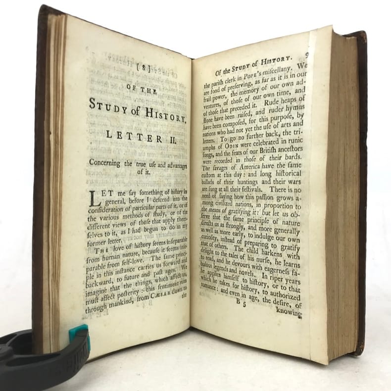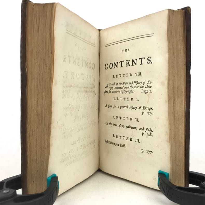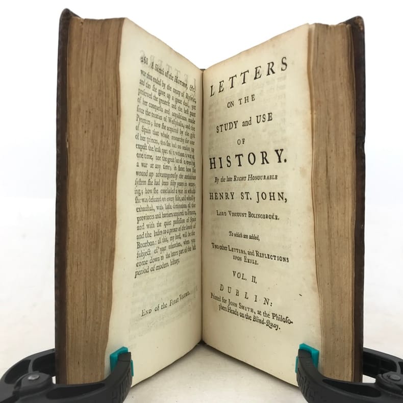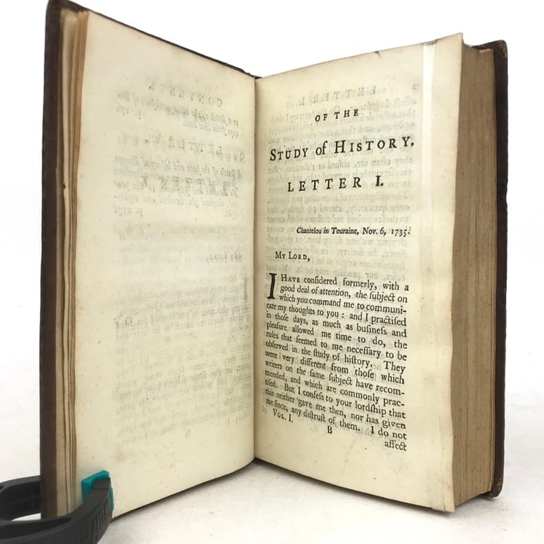 C'est dans le château d'Argeville, près de Fontainebleau, où il s'était retiré de 1735 à 1738 que Henry Saint-James, premier vicomte Bolingbroke (1678-1751) rédigea ces Lettres sur l'histoire qui, en-dehors d'une impression privée, ne furent livrées au public qu'après sa mort, en 1752. Plus qu'une méthodologie à proprement parler, il s'agit de la promotion d'une vision tacitéenne de l'histoire, centrée sur l'Etat, ses instruments, ses gouvernants, avec une pointe très nette d'anti-christianisme, qui inspira tant en Angleterre que sur le continent. - - VENTE PAR CORRESPONDANCE UNIQUEMENT