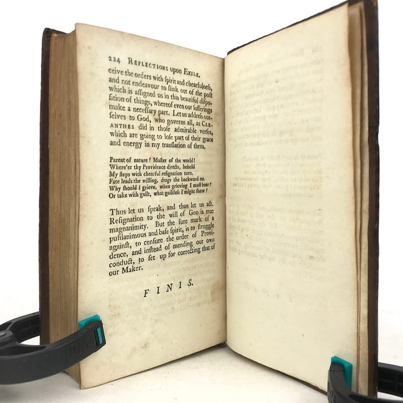 2 tomes en 1 volume in-12 (16,5 x 9,5 cm), veau fauve (reliure de l’époque), dos à nerfs, pièce de titre fauve, texte en anglais. [6]-268-[4]-224 pages (complet). Coiffe accidentée, un mors fendu, petits frottements, rousseurs. État correct. Édition irlandaise parue la même année que l’originale anglaise. Elle fut traduite la même année en français. Henry St John, vicomte Bolingbroke (1678-1751) est un homme politique et philosophe britannique. Après une jeunesse dissipée, il entra aux affaires, et y montra une supériorité insoupçonnée. Il attira l'attention du roi Guillaume III d'Angleterre puis fut nommé secrétaire d'État en 1704. Bien que fait pair avec le titre de vicomte Bolingbroke, il perdit tout son crédit à la mort de la reine Anne (1714) et fut même proscrit par le Parlement et dépouillé de tous ses biens. Il se réfugia en France puis fut par ses écrits dans le périodique le Craftsman qu'il a lui-même lancé, le plus redoutable antagoniste du Premier ministre Robert Walpole. Il avait épousé en deuxièmes noces la marquise de Villette, nièce de Madame de Maintenon. Bolingbroke fut lié avec certains des plus grands écrivains de son temps : Matthew Prior, Jonathan Swift et Alexander Pope. Provenance : De la bibliothèque de la famille Browne, marquisat de Sligo à Wesport House, avec l’ex-libris armorié sur le contreplat et un ex-libris manuscrit d’Eliza Browne (fille de Home Peter Browne) sur le titre, et de la bibliothèque de Remy G. Saisselin, avec son ex-libris. Bon exemplaire.