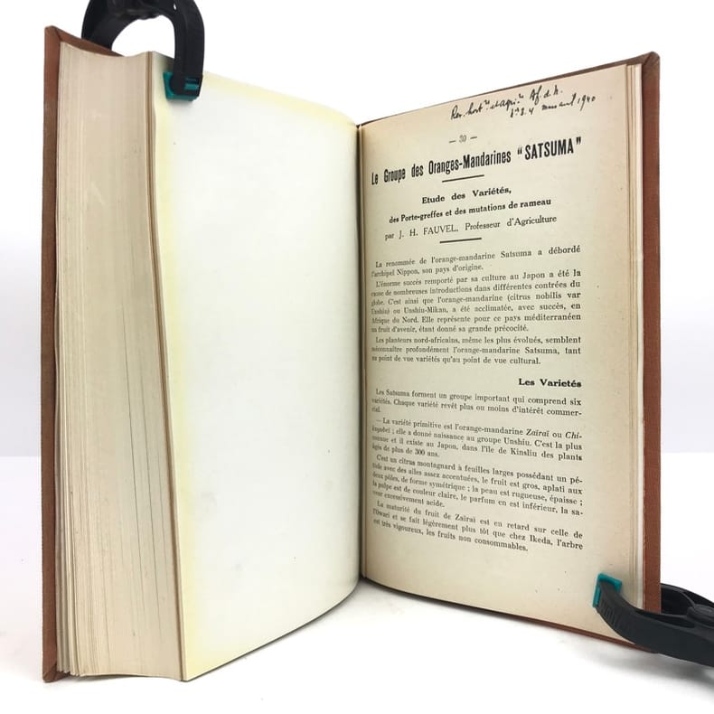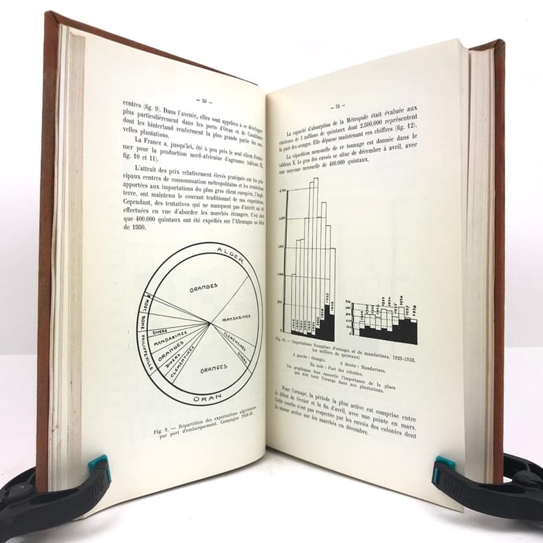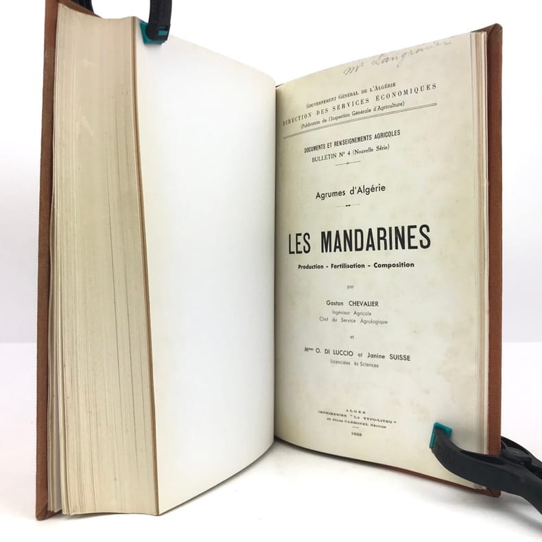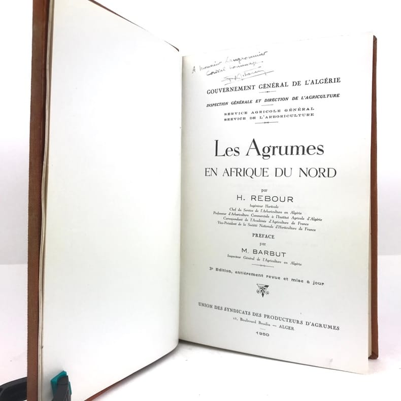 1 volume in-8 (24 cm x 15 cm), toile orange, pièce de titre noire, envoi sur la page de titre, couverture conservée. 502-[1]-3 bl.-7-[1]-[2]-12-2 bl.-[2]-16-39 à 46-55 à 58 pages. Toile frottée avec rousseurs. Bon état. Nouvelle édition. Exemplaire contenant deux tableaux dépliants dans le premier texte, 2 photographies hors-texte dans le dernier, ainsi que de nombreuses illustrations et schémas in-texte. Henri Rebour (1893-1977) est un ingénieur horticole français qui fit carrière en Tunisie et Algérie. Il est l'auteur de nombreux livres et articles qui traitent de la production de fruits en climat méditerranéen, notamment les agrumes. Bon exemplaire contenant l’envoi de l’auteur : « À Monsieur Langrommier, Cordial hommage, H. Rebour ».