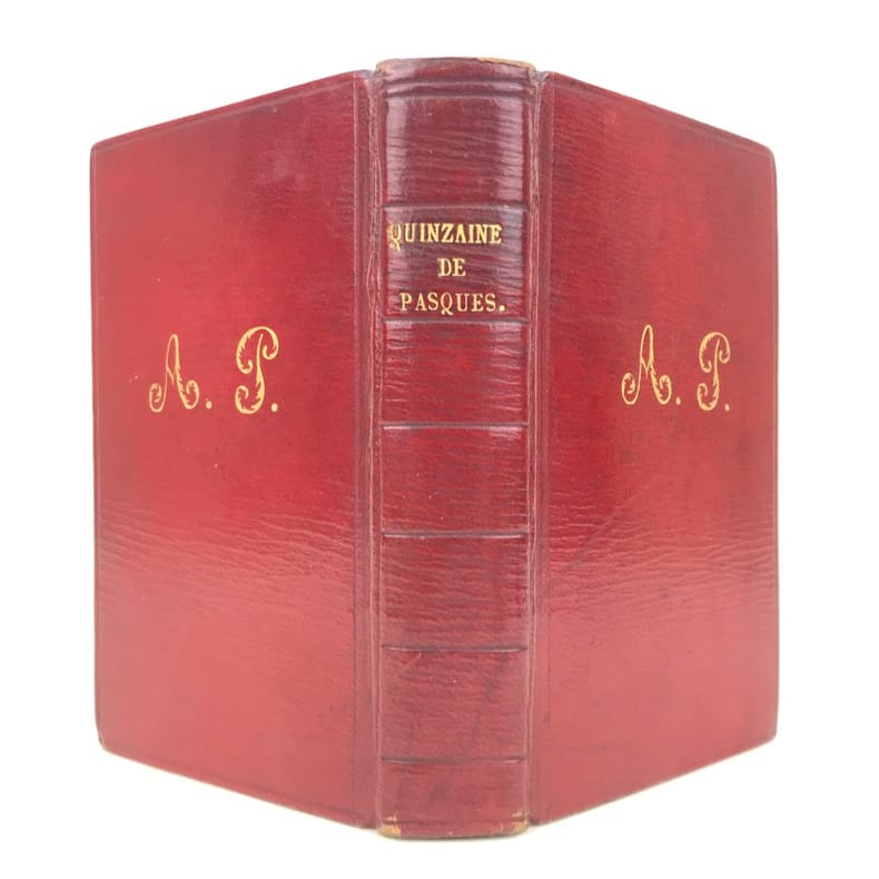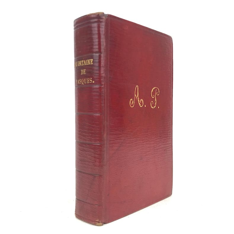 Avec l'explication des Cérémonies propres de ce saint Temps; des Méditations sur les Évangiles de chaque jour ; des Réflexions sur les Mystères ; Exercices & Prières pour la Confession & la Communion.A Paris, chez De Hansy - 1775 - 611 pages. Imprimé sur 2 colonnes, texte français en regard du texte latin. Joli frontispice.Superbe reliure plein maroquin grenat de l'époque. Dos à nerfs orné et doré avec pièce de titre verte. Large dentelle dorée encadrant les plats. Roulette intérieure et sur les coupes. Tranches dorées. Pas de rousseur. Très bon état pour cet exemplaire raffiné. Format in-16°(14x9).