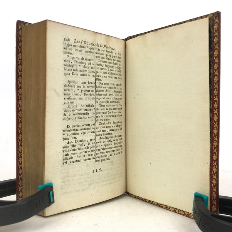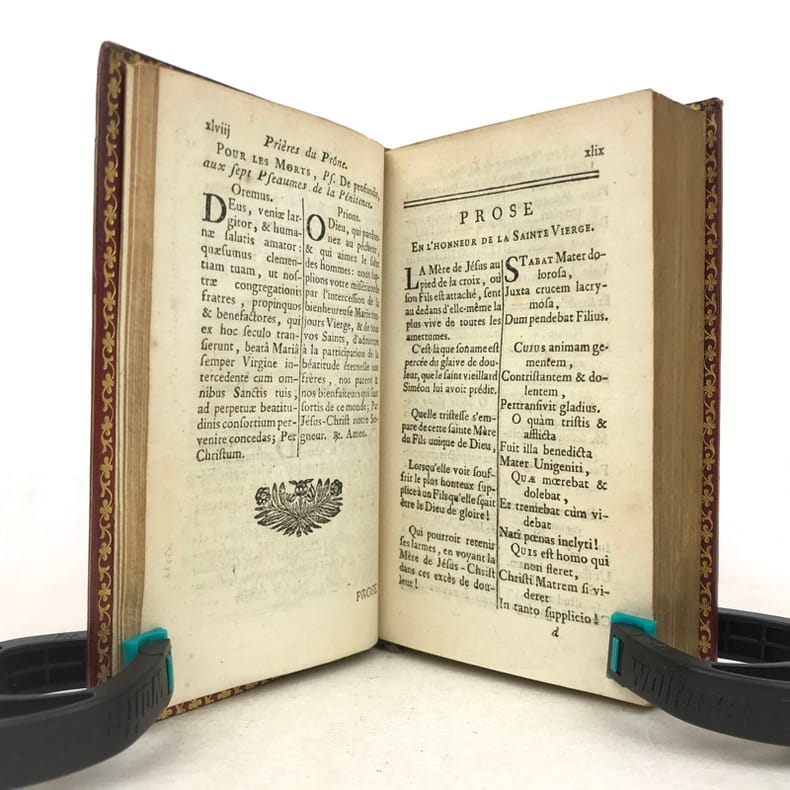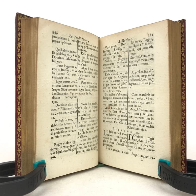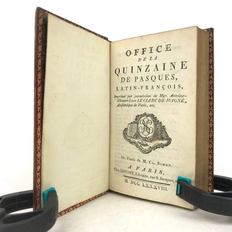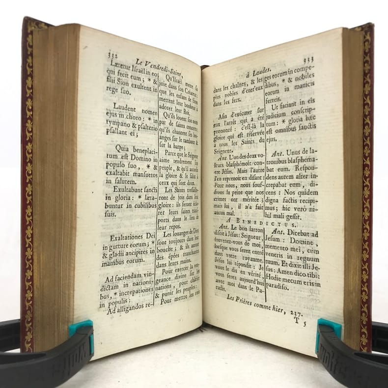 1 volume in-12 (13,5 cm x 8 cm), maroquin rouge à longs grains (reliure postérieure), dos lisse à filets à froid, supra-libris doré A. P. sur les plats, tranches dorées, roulette dorée intérieure, texte bilingue sur deux colonnes. [2]-lii-608 pages (complet). Minimes frottements à la reliure, feuillets ternis, claires rousseurs. État très correct. Nouvelle édition bilingue français-latin par Antoine Éléonor Léon Leclerc de Juigné de Neuchelles (1728-1811), évêque français qui exerça sa charge au xviiie siècle. Archevêque de Paris, il fut élu député du clergé aux États généraux de 1789. Bel exemplaire.