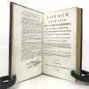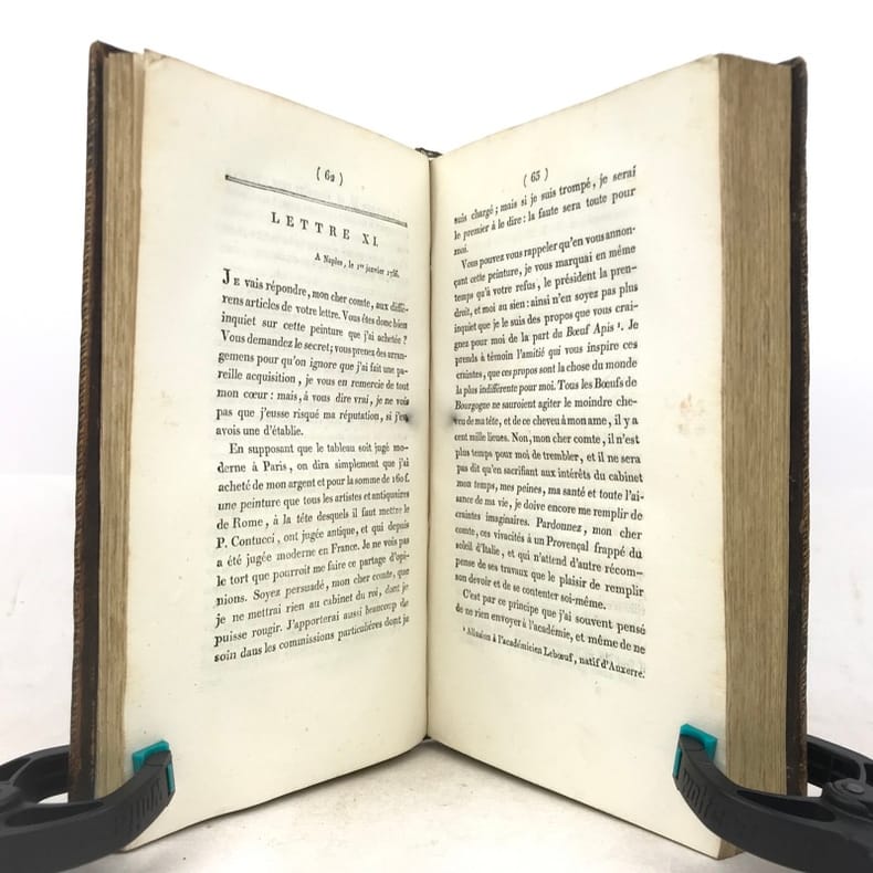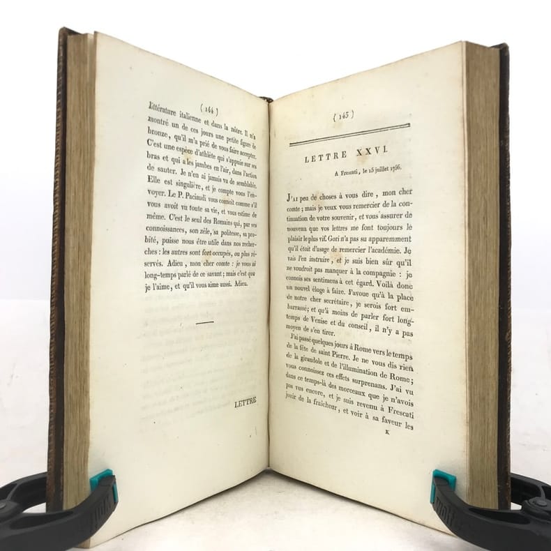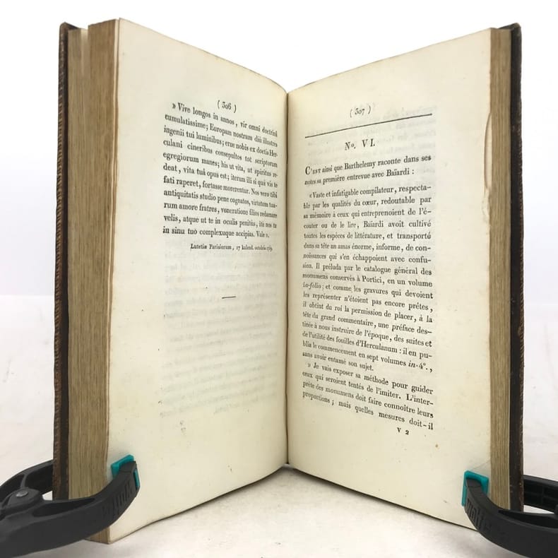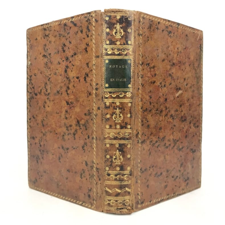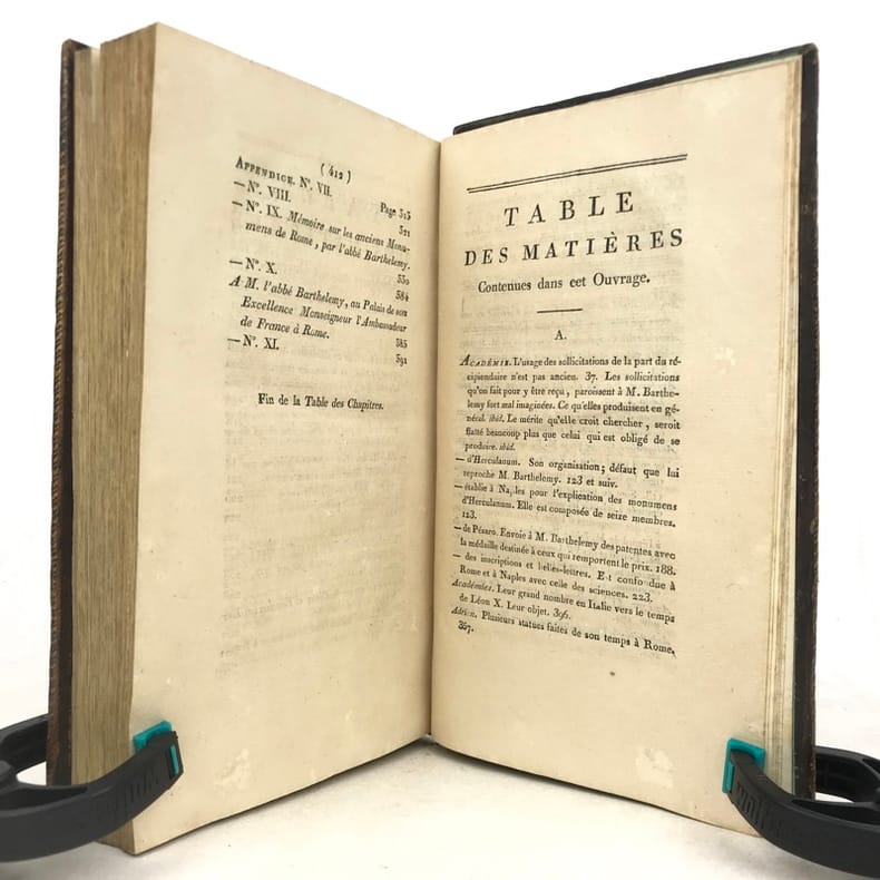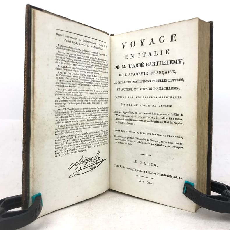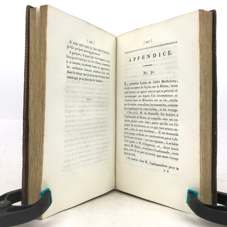 1 volume in-8 (20,5 x 12,5 cm), basane marbrée (reliure de l’époque), dos lisse joliment orné, pièce de titre verte, roulette dorée en encadrement sur les plats, ex-libris contrecollé sur le contreplat : J. Rhone. [4]-xxiv-432 pages (complet). Petits frottements à la reliure avec accidents aux coiffes, quelques pâles rousseurs sans gêne de lecture et quelques feuillets brunis. État très correct.ÉDITION ORIGINALE posthume ornée d'une planche hors texte représentant les dessins des haches sur deux monuments du Capitole.Ouvrage posthume, contenant 49 lettres écrites au comte de Caylus, revues par Cotte, qui l'accompagna dans son voyage, et par ses neveux, qui ont permis à l'éditeur de parcourir les manuscrits et d'en extraire quelques morceaux ; avec un Appendice, où se trouvent des morceaux inédits de Winckelmann, du P. Jacquier, de l'Abbé Zarillo, et d'autres savants, publié par A. Sérieys. Les lettres seules furent publiées pour la première fois par le baron de Sainte-Croix dans les Oeuvres diverses de Barthélemy, en 1798. Barthélemy effectua son voyage en Italie de 1755 à 1757, sur ordre et aux frais du gouvernement, pour enrichir le Cabinet des médailles dont il avait la garde, succédant à Gros de Boze. On lui doit le déchiffrement de l’alphabet palmyrénien, en 1754, et de l’alphabet phénicien, en 1758.Jean-Jacques Barthélemy, dit l'abbé Barthélemy (1716-1795), est un ecclésiastique, archéologue, numismate et homme de lettres français.Bon exemplaire.