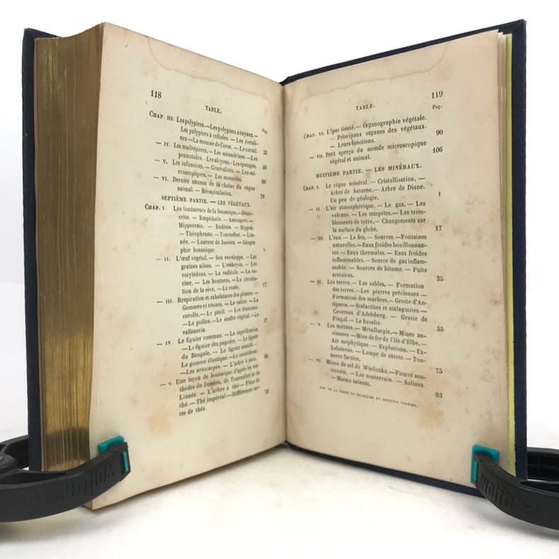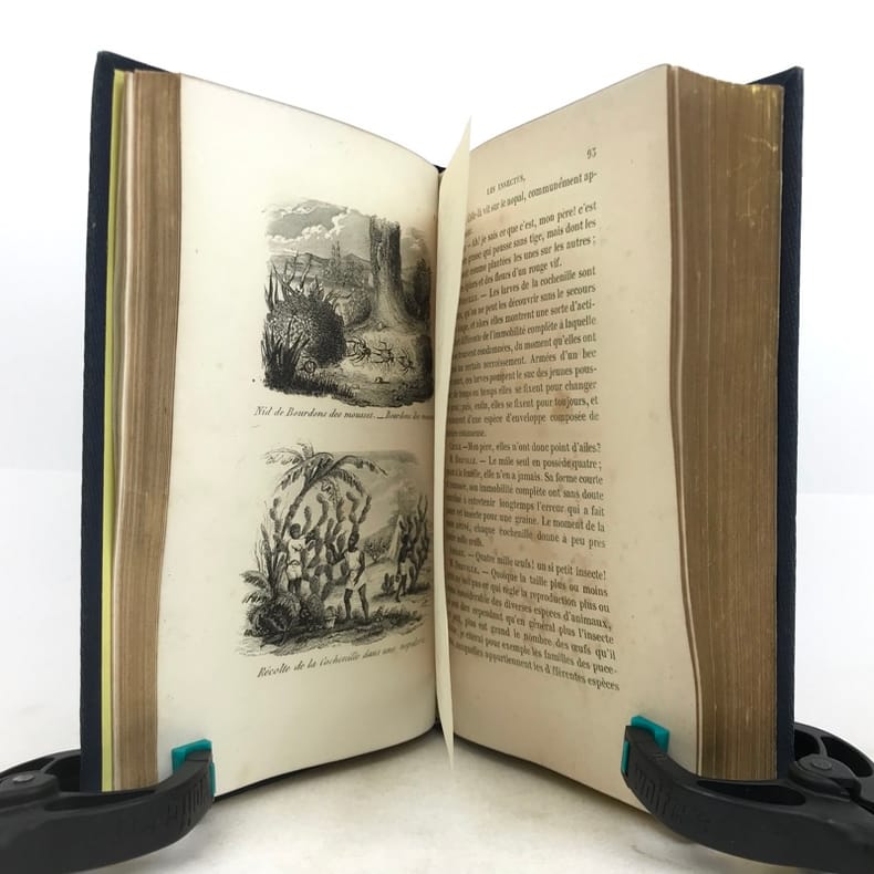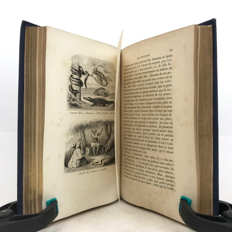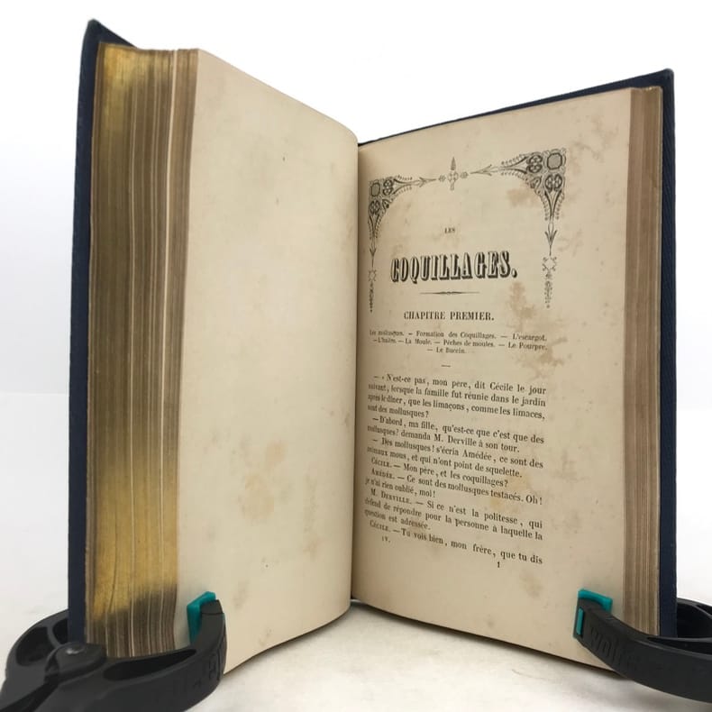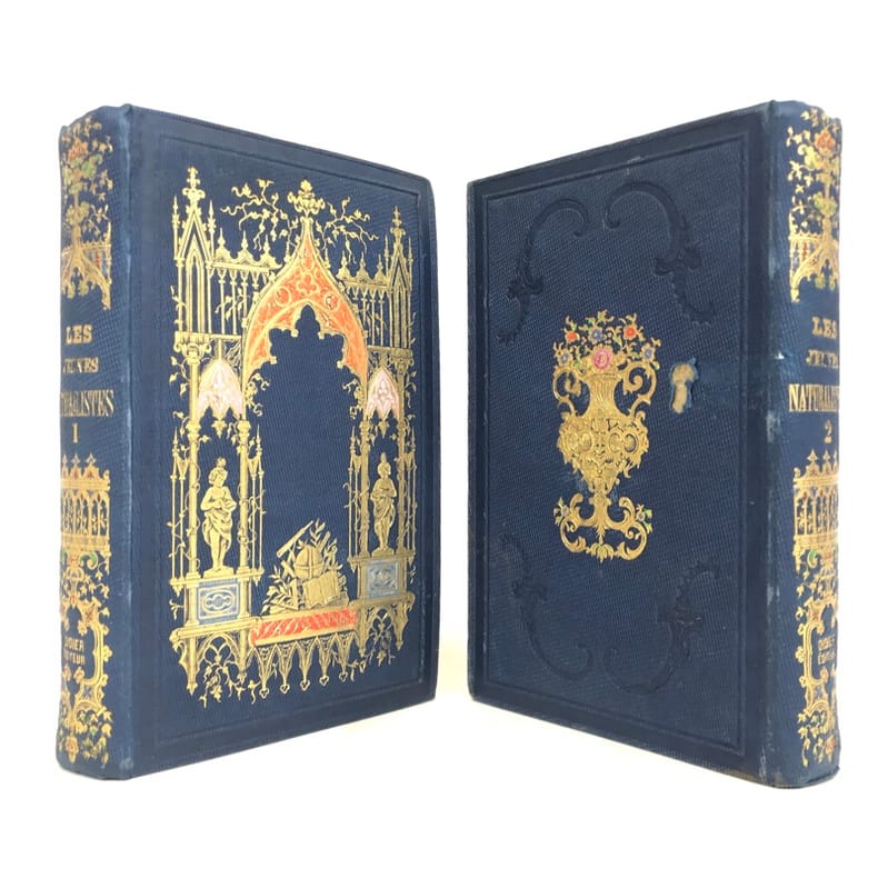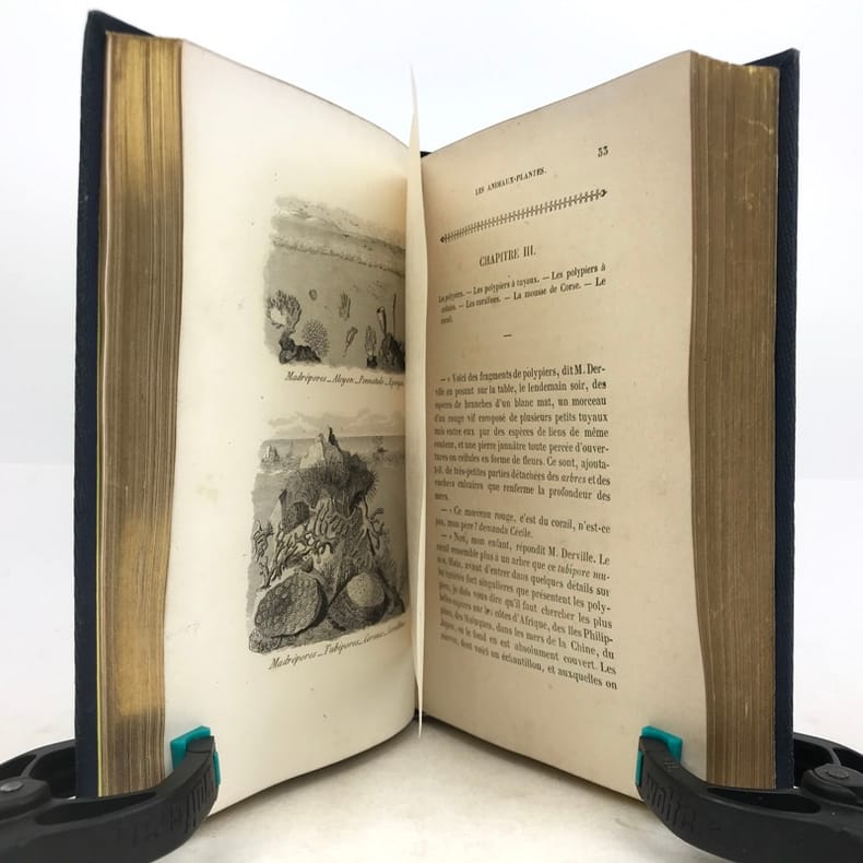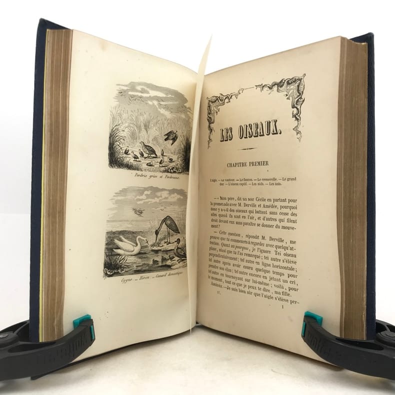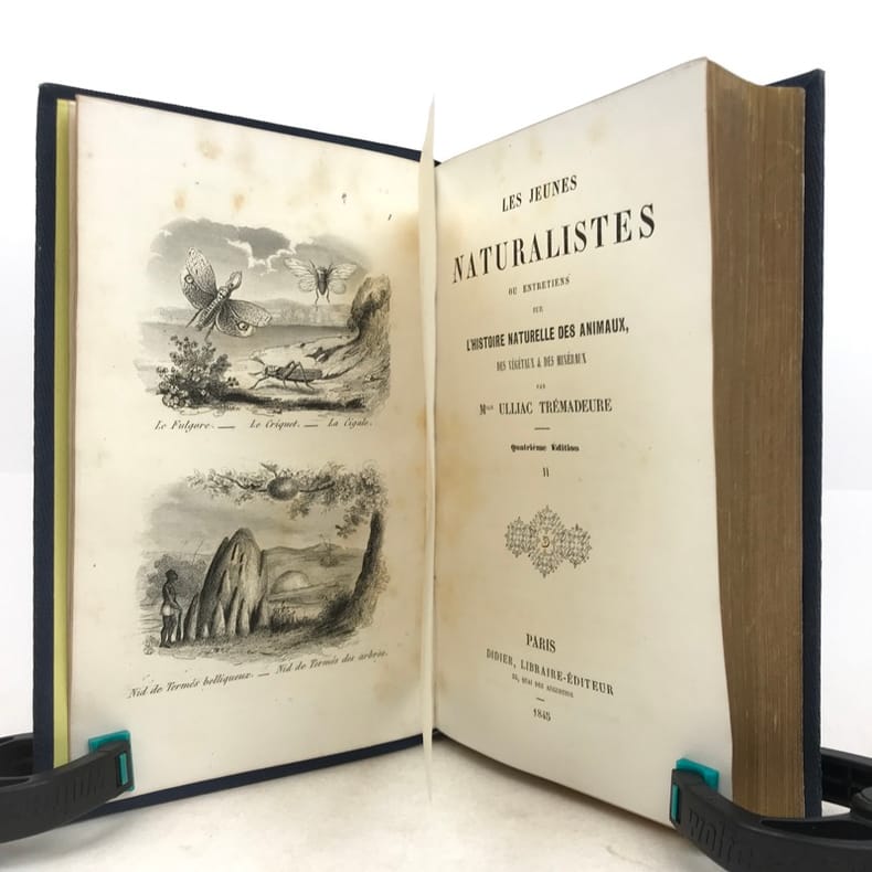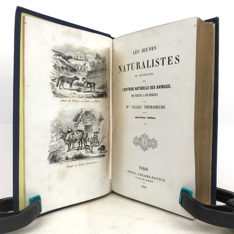 2 volumes in-16 (17 x 11 cm), cartonnage éditeur bleu avec décors dorés sur le dos et les plats, tranches dorées, [4]-vii-[1]-98-100-105-[1]-115-[1] ; [4]-109-[1]-92-[2]-119-[1]-119-[1] pages (complet). Épidermure sur le plat inférieur du tome II, quelques mouillures, importantes rousseurs. État correct tout de même. Nouvelle édition, la quatrième depuis l’originale de 1838, illustrée de deux frontispices et 14 gravures hors-texte. Sophie Ulliac-Trémadeure (1794-1862) est une femme de lettres, romancière, journaliste et éducatrice française. Elle rédige ici un traité naturaliste à l’intention des enfants, sous forme de dialogues d’apprentissage. Bon exemplaire, avec un charmant cartonnage. État correct tout de même.
