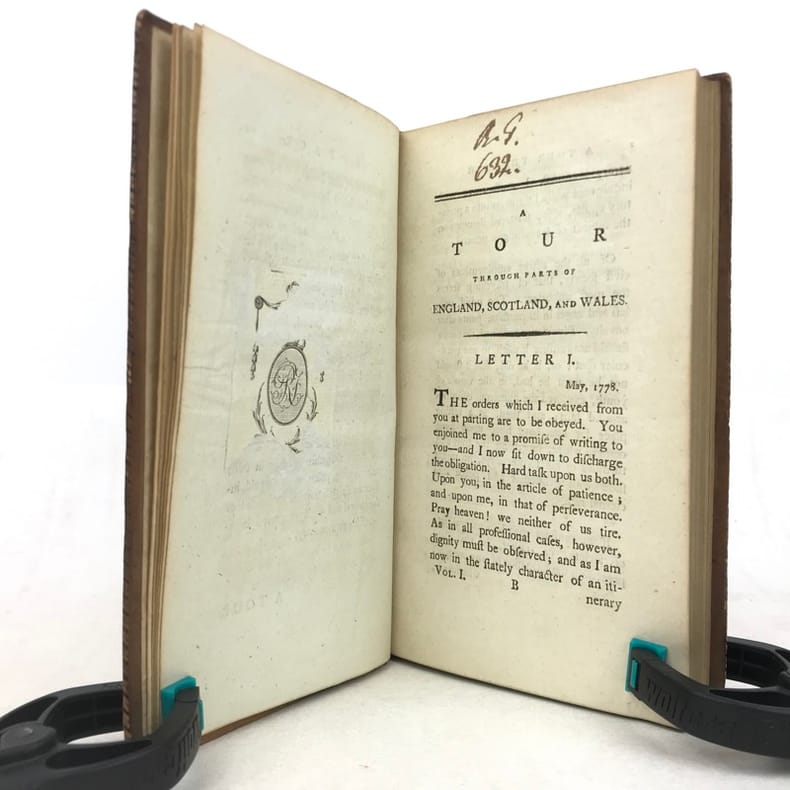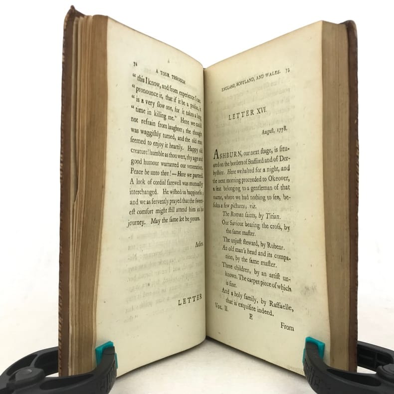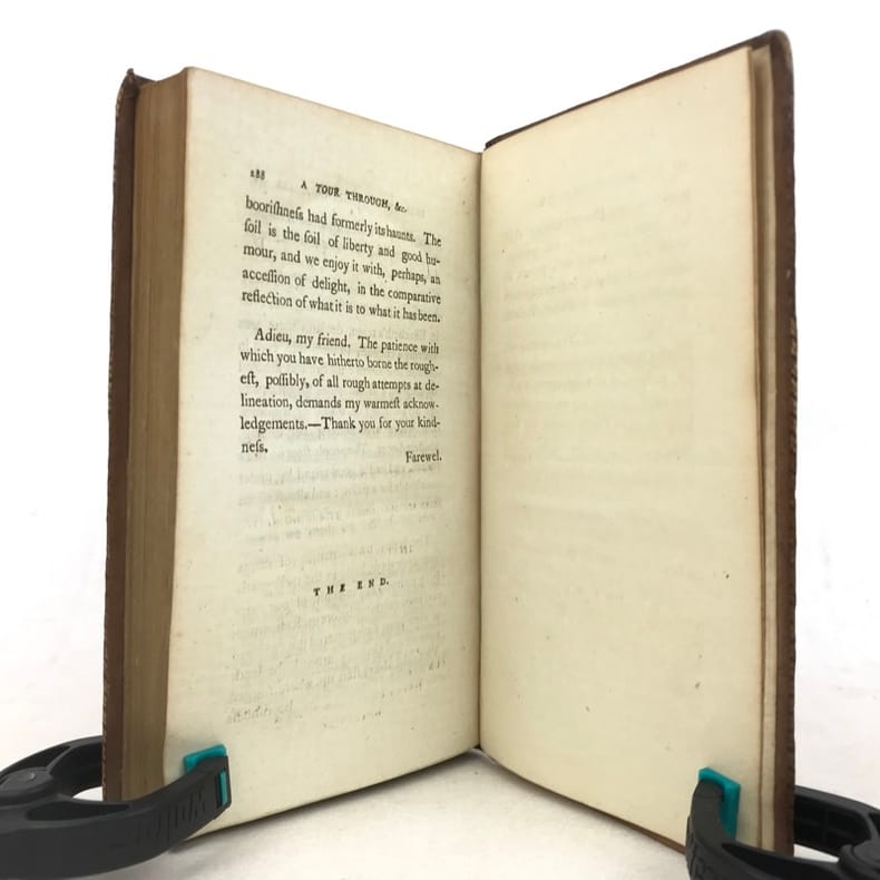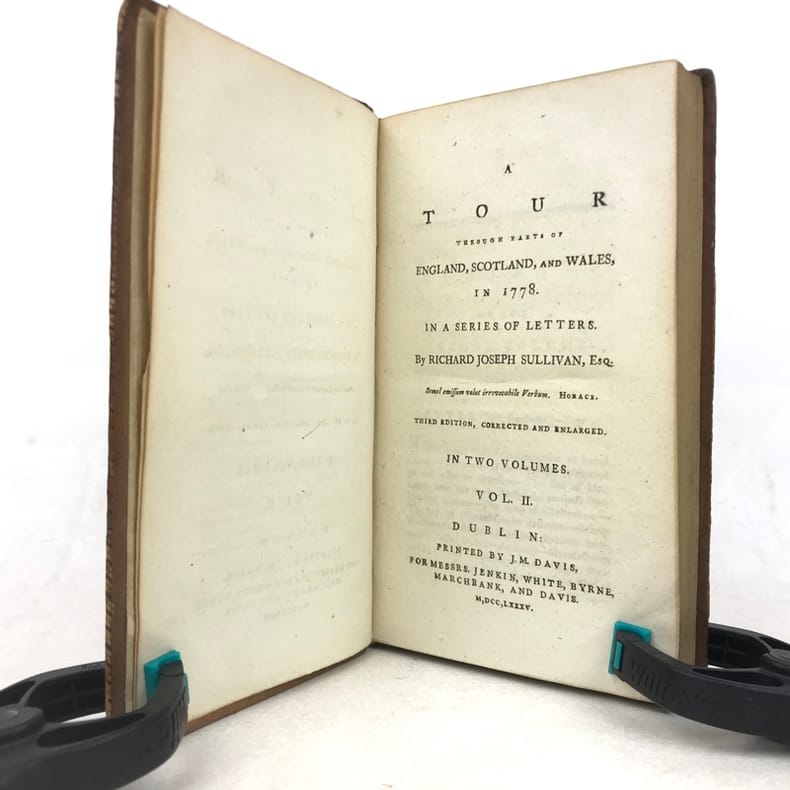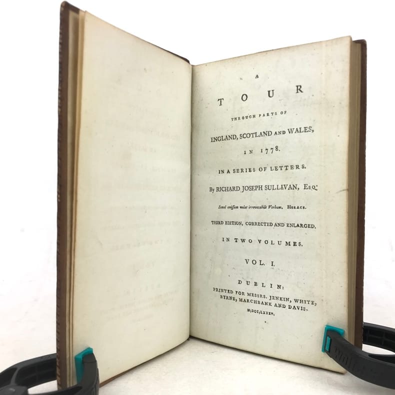 2 volumes in-12 (17,5 x 10,3 cm), veau blond (reliure de l’époque), dos lisse orné, pièce de titre de maroquin rouge et de tomaison de veau brun, roulette à froid sur les coupes, texte en anglais. vii-1 bl.-286 ; [12]-288 pages (complet). Coiffes accidentées, frottements angulaires et des plats, un mors fendu. État correct. Troisième édition, revue et corrigée, de ce “Home Tour” sous forme épistolaire. Sir Richard Joseph Sullivan, auteur de nombreux ouvrages, est né en Irlande vers le milieu du XVIIIe siècle. Il a passé une partie de sa jeunesse en Inde au service de la Compagnie des Indes orientales, puis, à son retour, il a fait un tour de Grande-Bretagne. Il a écrit A View of Nature, in Letters to a traveller among the Alps (Une vision de la nature, dans des lettres à un voyageur dans les Alpes) en 1794. Il est entré au Parlement en 1802 et a été fait baronnet en 1804. Bon exemplaire.