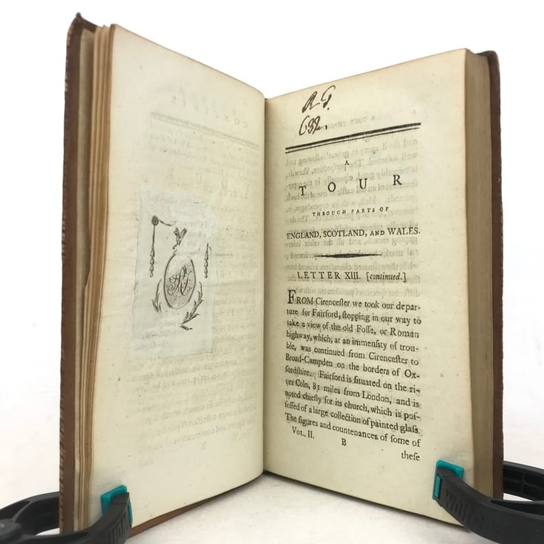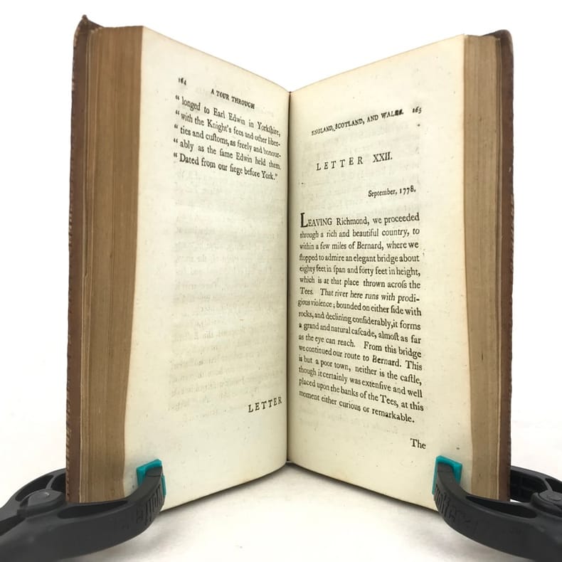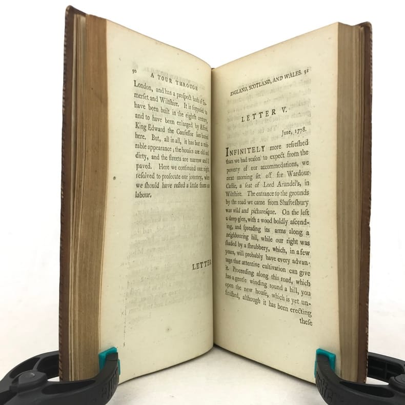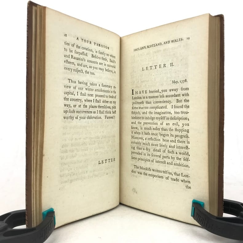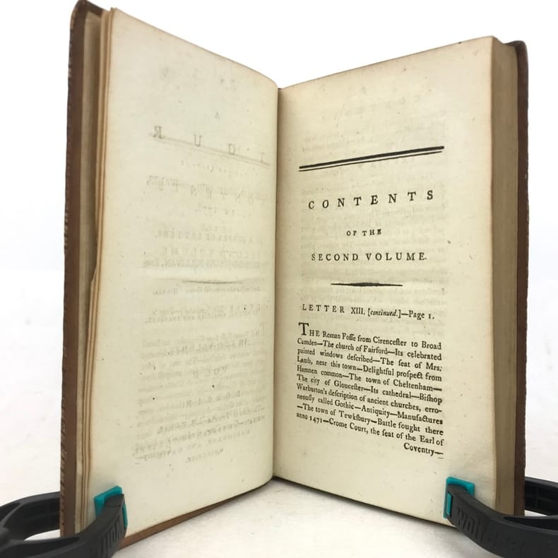 2 volumes in-12 (17,5 x 10,3 cm), veau blond (reliure de l’époque), dos lisse orné, pièce de titre de maroquin rouge et de tomaison de veau brun, roulette à froid sur les coupes, texte en anglais. vii-1 bl.-286 ; [12]-288 pages (complet). Coiffes accidentées, frottements angulaires et des plats, un mors fendu. État correct. Troisième édition, revue et corrigée, de ce “Home Tour” sous forme épistolaire. Sir Richard Joseph Sullivan, auteur de nombreux ouvrages, est né en Irlande vers le milieu du XVIIIe siècle. Il a passé une partie de sa jeunesse en Inde au service de la Compagnie des Indes orientales, puis, à son retour, il a fait un tour de Grande-Bretagne. Il a écrit A View of Nature, in Letters to a traveller among the Alps (Une vision de la nature, dans des lettres à un voyageur dans les Alpes) en 1794. Il est entré au Parlement en 1802 et a été fait baronnet en 1804. Bon exemplaire.