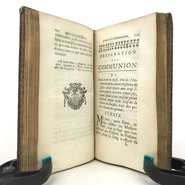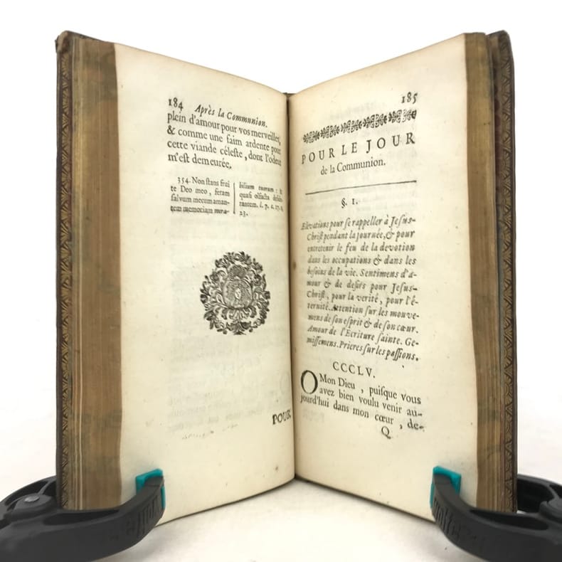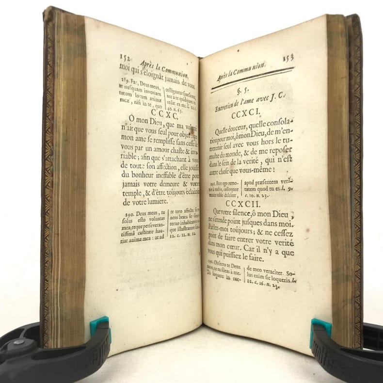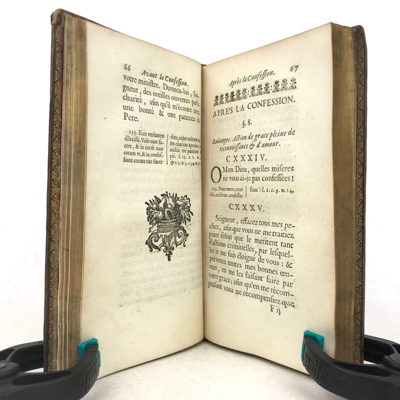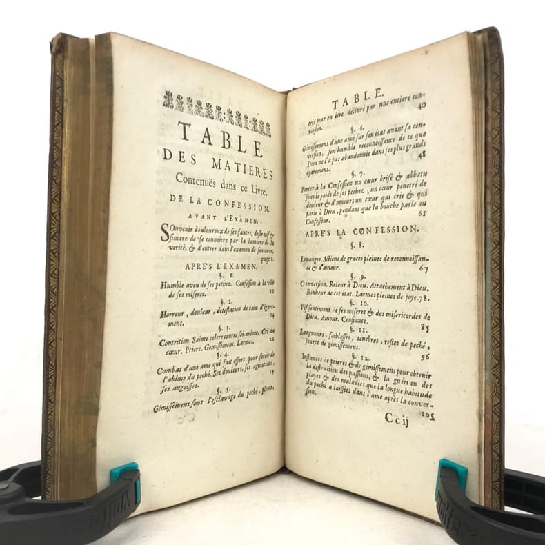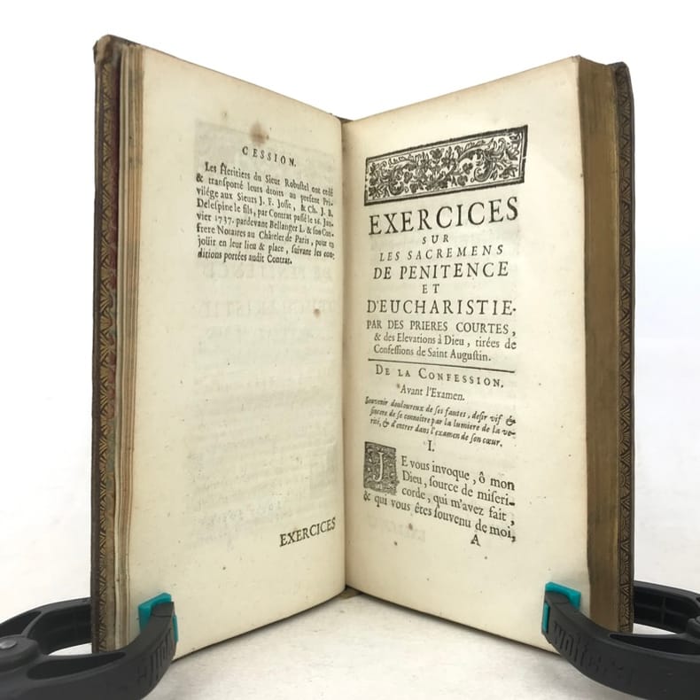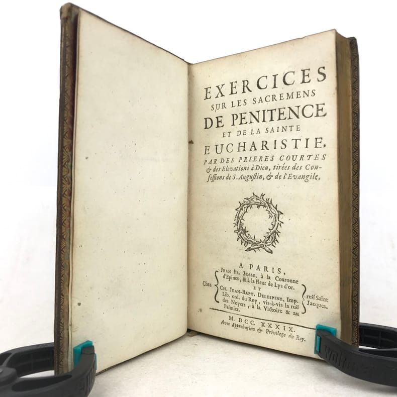1 volume in-12 (16,5 x 9,5 cm), maroquin brun (reliure de l’époque), dos à nerfs avec titre doré, étiquette bibliothéconomique en pied du dos, filet doré sur les coupes, roulette dorée sur les chasses, tranches dorées sur marbrures, [12]-305-[7] pages (complet). Deux coins usés, quelques taches sur le cuir, rousseurs éparses. État correct tout de même. Nouvelle édition. Marc-Antoine Hersan (1649-1724) est un prêtre français, professeur de l’Université de Paris et fondateur d’une école pour les enfants pauvres de sa ville natale, Compiègne. Il publie pour la première fois cet ouvrage en 1707, tirant son propos des Confessions de Saint-Augustin et de l’Évangile. Bon exemplaire.