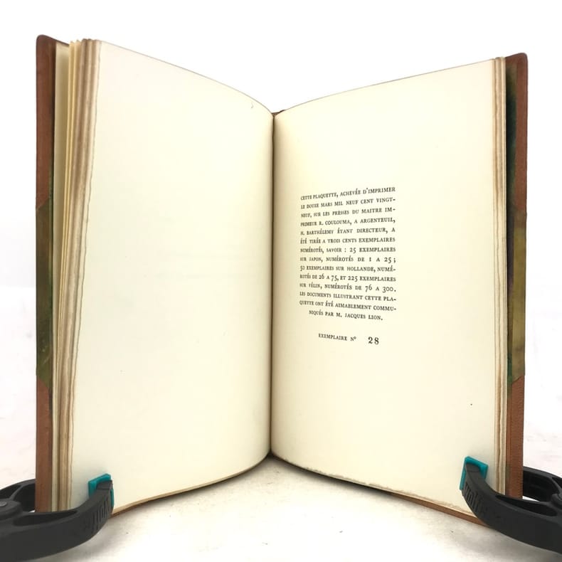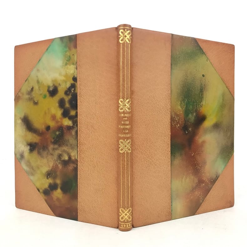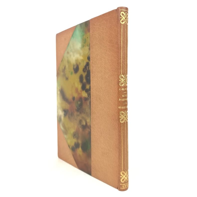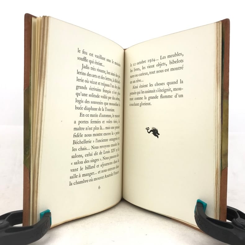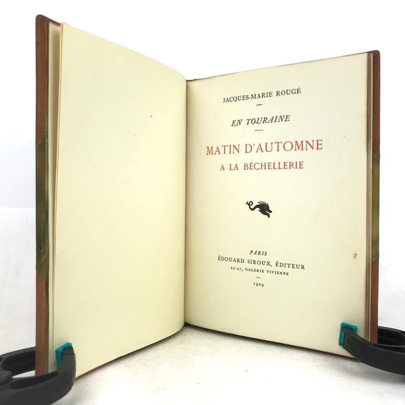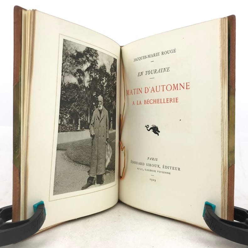 1 volume in-12 (19 x 14 cm), demi-maroquin sable à coins (Reliure de l’époque, signée du relieur belge Van West), dos lisse joliment orné en long, tête dorée, couverture et dos conservés, [12]-6-[10] pages (complet). Reliure inégalement brunie, quelques rousseurs sur les premiers feuillets blancs. Bon état. Édition illustrée de 3 reproductions photographiques, dont une en frontispice représentant Anatole France dans le parc de la Béchellerie, une planche hors-texte avec une vue de la Béchellerie et un bandeau ornemental in texte qui présente une partie d'un retable du xive siècle, et une vignette de titre gravée sur bois, répétée sur la couverture et en cul-de-lampe, qui désigne une girouette, celle qui orne le toit de la bibliothèque de la Béchellerie. Tirage à 300 exemplaires, celui-ci 1/50 sur Hollande, second papier après 25 sur Japon, (n°28). Jacques-Marie François Rougé (1873-1956), écrivain tourangeau, conservateur du musée du Folklore de Loches et du musée préhistorique du Grand-Pressigny. Premier véritable folkloriste, on dit alors "traditionniste", de la Touraine. Il n'a cessé de militer pour ses convictions régionalistes pendant l'entre-deux-guerres. Bon exemplaire.