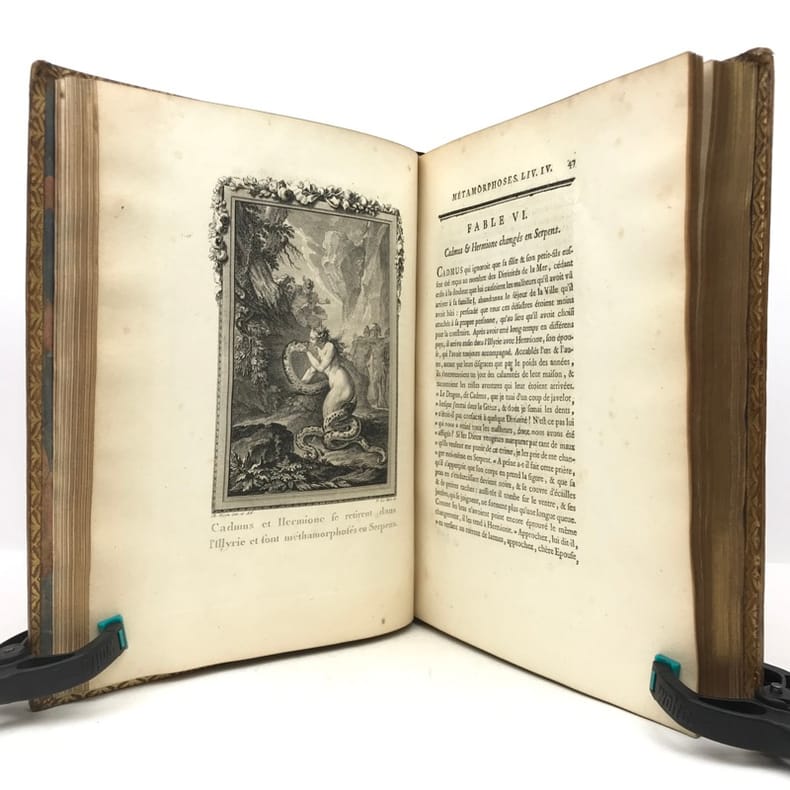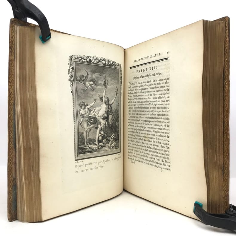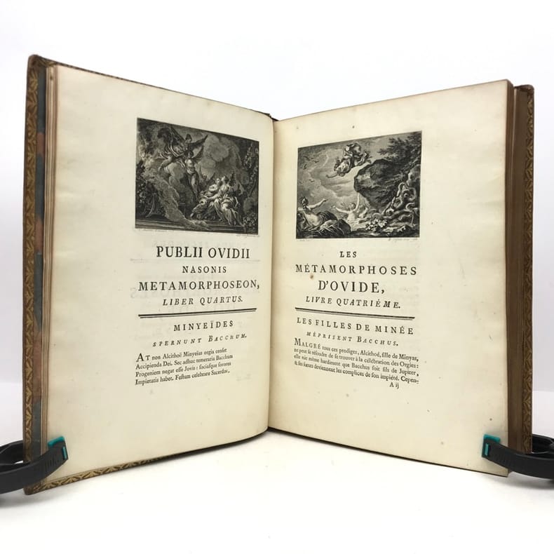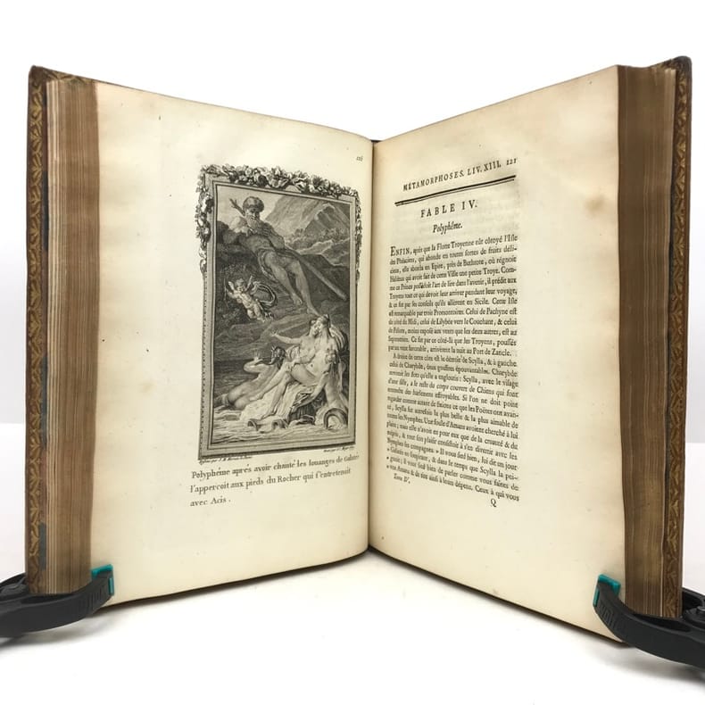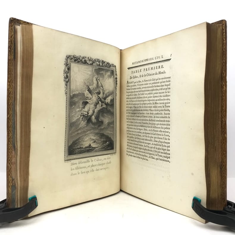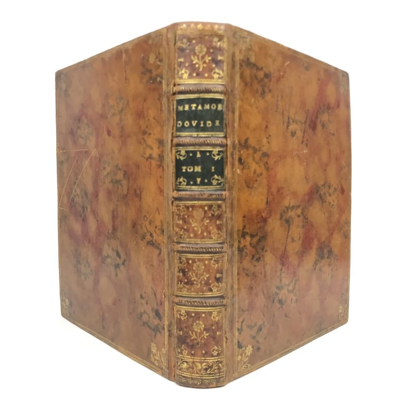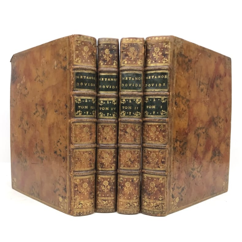 4 volumes in-4 (24,5 x 18,5 cm), veau marbré (reliure de l’époque), dos à nerfs orné, pièces de titre et de tomaison en maroquin vert, triple filet doré encadrant les plats avec fleurons en écoinçons, double filet doré sur les coupes, roulette dorée sur les chasses, tranches dorées sur marbrures, titre en rouge et noir, [4]-8-xc-[2]-264 ; viii-355-[1] ; viii-360 ; viii-367-[1] pages (complet). Frottements aux mors, quelques rousseurs éparses. État très correct.Édition richement illustrée d’un titre gravé et de 140 gravures hors-texte. Elle comprend notamment deux planches de dédicace gravées, en tête du tome I, ainsi que la traduction français en regard du texte en latin.“C'est un des [ouvrages les] plus galamment illustrés de tout le XVIIIe siècle”. (Cohen, 769)Nouvelle traduction des Métamorphoses d’Ovide, dont la composition débute probablement en l'an 1. Elle est ici réalisée par Antoine Banier (1673-1741), homme d’Église et de Lettres.Plaisant exemplaire. État très correct