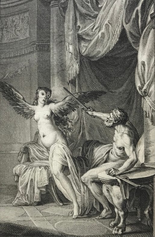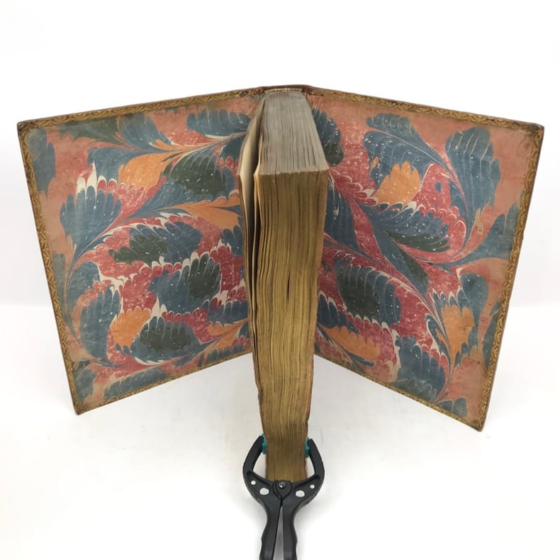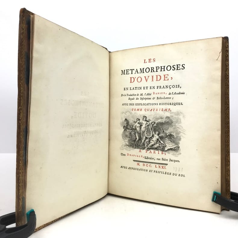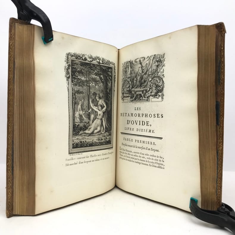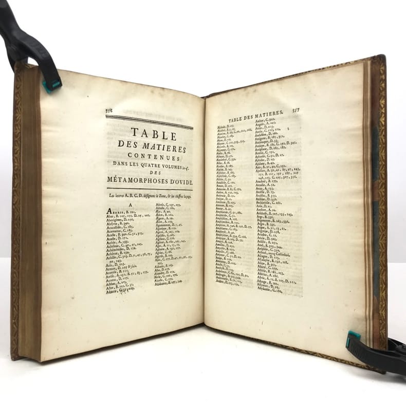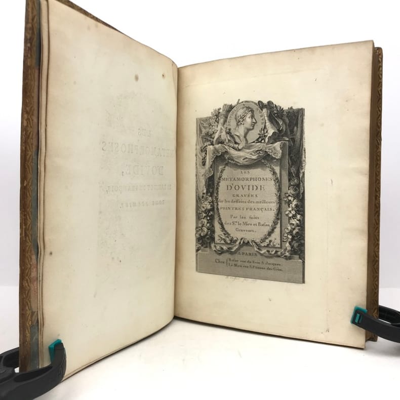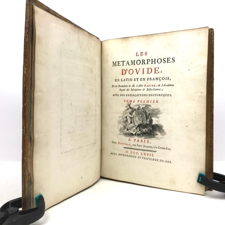 4 volumes in-4 (24,5 x 18,5 cm), veau marbré (reliure de l’époque), dos à nerfs orné, pièces de titre et de tomaison en maroquin vert, triple filet doré encadrant les plats avec fleurons en écoinçons, double filet doré sur les coupes, roulette dorée sur les chasses, tranches dorées sur marbrures, titre en rouge et noir, [4]-8-xc-[2]-264 ; viii-355-[1] ; viii-360 ; viii-367-[1] pages (complet). Frottements aux mors, quelques rousseurs éparses. État très correct.Édition richement illustrée d’un titre gravé et de 140 gravures hors-texte. Elle comprend notamment deux planches de dédicace gravées, en tête du tome I, ainsi que la traduction français en regard du texte en latin.“C'est un des [ouvrages les] plus galamment illustrés de tout le XVIIIe siècle”. (Cohen, 769)Nouvelle traduction des Métamorphoses d’Ovide, dont la composition débute probablement en l'an 1. Elle est ici réalisée par Antoine Banier (1673-1741), homme d’Église et de Lettres.Plaisant exemplaire. État très correct