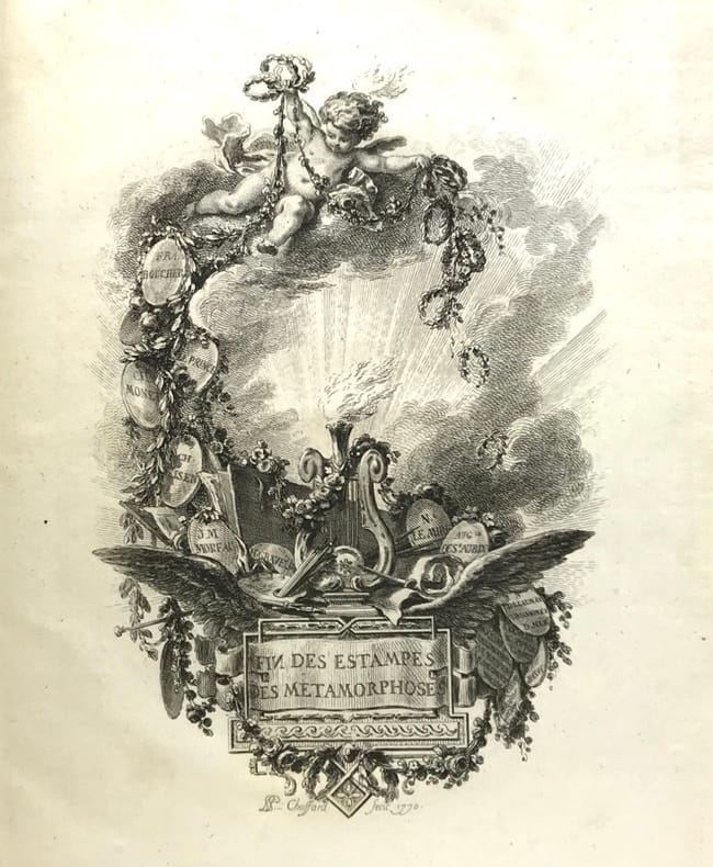 bailly 1767 4 in-4 A Paris, chez Bailly, rue Saint-Honoré, barriere des Sergens, 1767-1770, 4 volumes in-4 de 260x190 mm environ, Tome 1. 1f.blanc, faux-titre, 3ff. de dédicace gravées, titre en rouge et noir avec vignette, cx-1f. (approbation et privilège)-264 pages, avec les planches numérotése de 1 à 48, 1f.blanc, - Tome 2. 1f.blanc, viij-355 pages, 1f.blanc, Avec les planches numérotées de 49 à 81, - Tome 3. 1f.blanc, viij-360 pages, Avec les planches numérotées de 82 à 118, - Tome 4. 1f.blanc, faux-titre, titre en rouge et noir, 6 (pages d'Explication des vignettes et fleurons de Métamorphoses)-367 pages, 1f.blanc, Avec les planches numérotées de 119 à 140, et une planche : Fin des estampes des Métamorphoses, avec les noms des artistes dans une guirlande de médaillons tenue par un angelot, édition enrichie de 30 vignettes placées à chacun des livres et de 4 fleurons aux titres des 4 volumes, reliures plein granité fauve, dos à nerfs ornés, portant titres et tomaisons dorés sur pièces en maroquin bordeaux, ornés de caissons à fleurons et motifs dorés, plats encadrés d'un triple filet doré, coupes et chasses dorées, gardes de couleurs, tranches dorées. Une coiffe ébréchée, des coins dénudés, début de fente sur un mors, des rousseurs cernes et pages brunies, petits défauts sur le cuir. Texte bilingue Latin avec la traduction en regard.