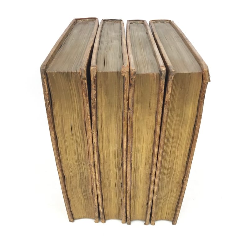 1767 Paris, Le Clerc, 1767-70, 4 volumes in 4° reliés plein veau du temps, dos lisse orné, filets dorés encadrant les plats, tranches dorées ; rousseurs ; six coiffes usées ou manquantes, usures sur les coupes, 4 coins émoussés, mors fendus, ors fanés ; reliures aisément restaurables.