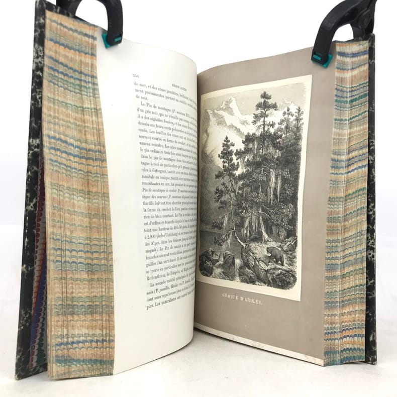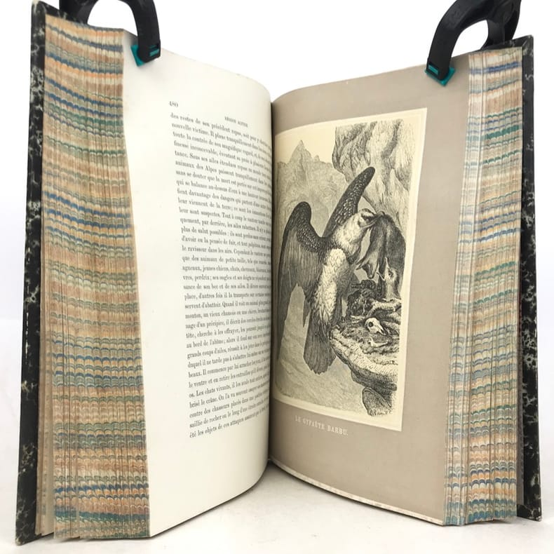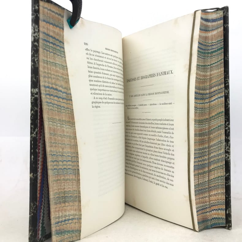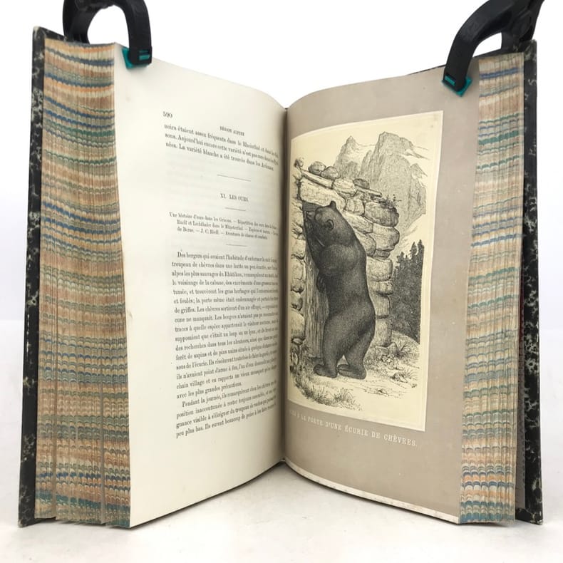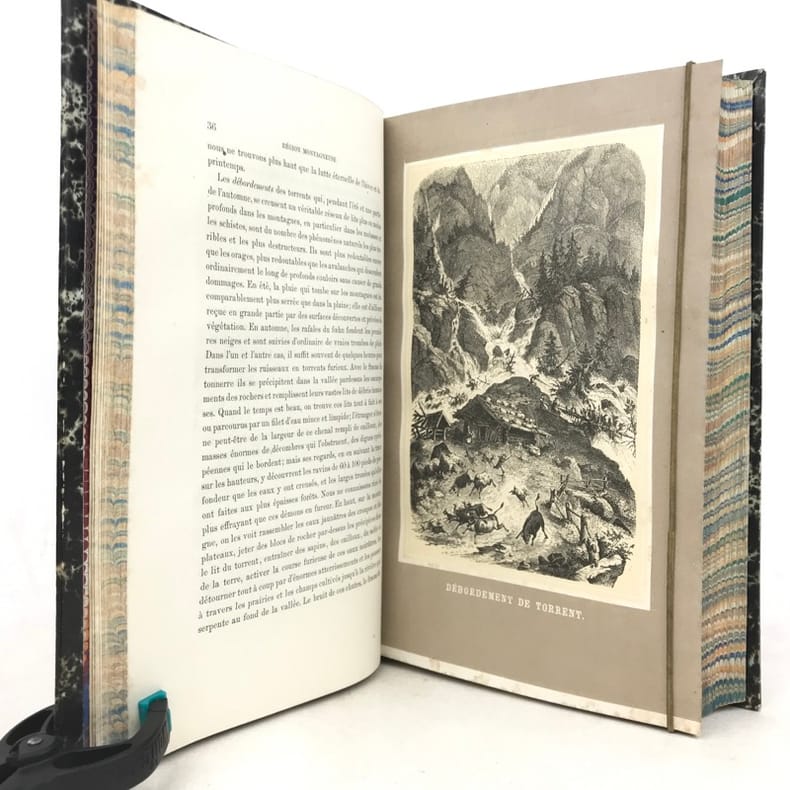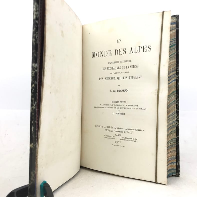 “Bel ouvrage classique sur la description des richesses naturelles des Alpes” remarque Perret, qui donne d'abord la 2e traduction de «Das Tierleben der Alpenwelt» (1853), celle de Vouga et Schimper, qui fut publiée en 1859 à Berne et Strasbourg.La 1re édition de la 1re traduction, celle “par O. Bourrit, avait été publiée en 1858 à Genève, en 3 vol. in-12 ...: cette traduction n'avait pas été autorisée par l'auteur”. Comme c'est indiqué sur la page de titre de notre 2e édition, illustrée par W. Georgy et E. Rittmeyer, ainsi que d'après la préface du traducteur datée 1869, il s'agit ici d'une nouvelle traduction (ou revue et corrigée) par Octave Bourrit (1811-1877) autorisée de la 8e édition originale. Bourrit dans sa préface de 1869 ne fait aucune mention de sa traduction illégale (sur la 3e éd. all.) publiée en 1858.L'ouvrage est reparti dans les sections suivantes: Le monde sauvage (La région montagneuse. La region alpine. La région des neiges). / Le monde domestique.Les xylogravures montrent: débordement de torrent, groupe d'érables, une avalanche, lac alpin, groupe d'aroles, et 19 planches de divers animaux sauvages et domestiques.“Hauptsächlich zoologisch, mit vorzüglichen Schilderungen des Landschaftscharakters der Alpen und Voralpen” (Wäber).