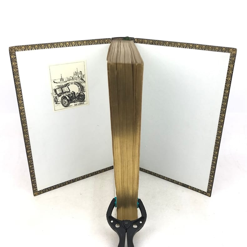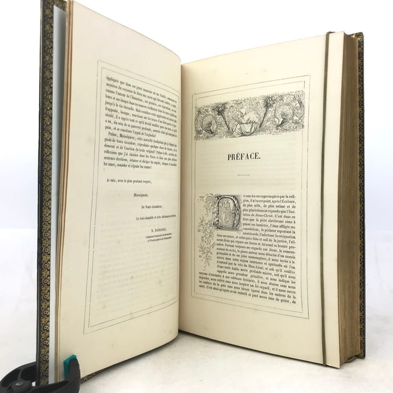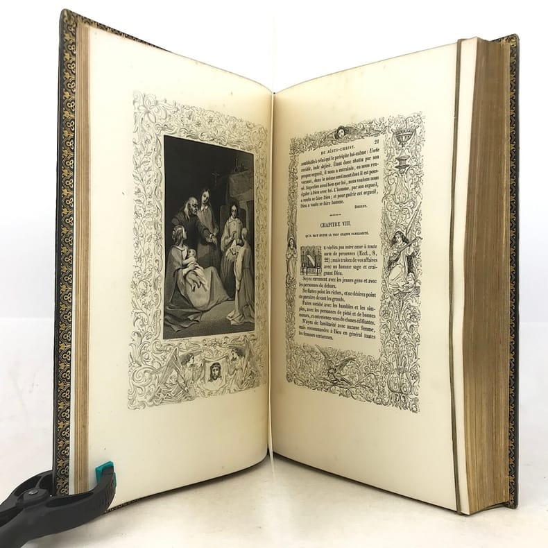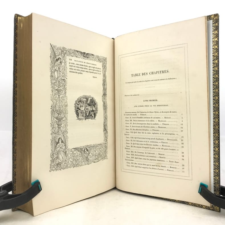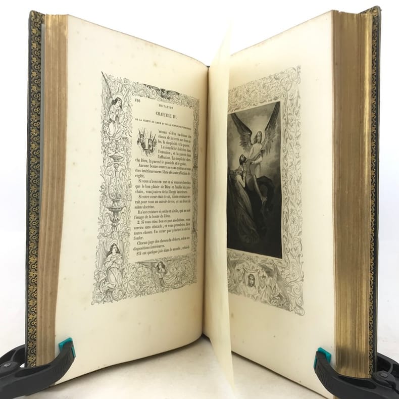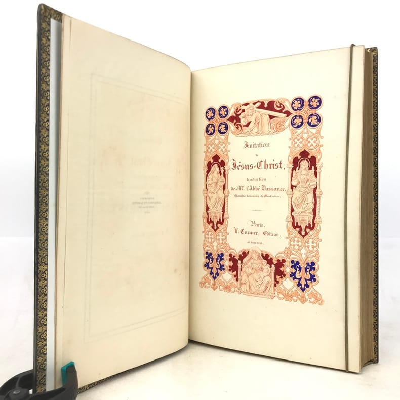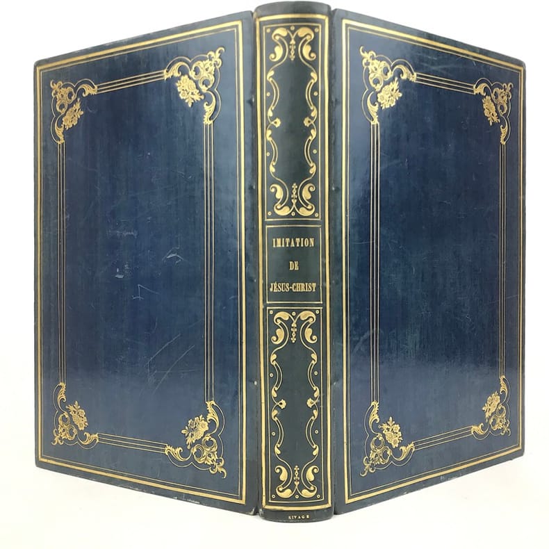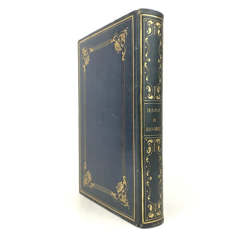1 volume in-4 (25 cm x 15,5 cm), veau bleu (reliure de l’époque signée Rivage), dos lisse à motifs dorés, filets dorés en encadrement des plats avec motifs dorés en coins, tranches dorées, roulette dorée intérieure, contreplat et gardes en moires, ex-libris contrecollé sur le contreplat de Claude Goumain, couverture conservée, texte encadré de motifs. [2]-viii-454 pages (complet). Légers frottements à la reliure, rousseurs éparses. État très correct. Nouvelle édition de l’Imitation de Jésus-Christ, traduite par l’abbé Dassance, illustrée d’un titre-gravé ainsi que de 10 gravures hors-texte d’après les dessins de Johannot et de Cavalier. L'abbé Nérée Dassance était prêtre et écrivain catholique (1801-1858). Ordonné prêtre le 25 juin 1825, vicaire à Cambo le 7 novembre suivant, il fut transféré au vicariat de Saint-André de Bayonne le 1 janvier 1826. Il a été chanoine honoraire de Paris et vicaire-général de Montpellier. Dassance publia successivement plusieurs traductions, la première fut cette traduction de l’Imitation de Jésus-Christ. Elle parut pour la première fois en 1836. On lui doit encore: la Nouvelle bibliothèque des Prédicateurs (1837-1838, 15 vol. in-8º), ou l'Abrégé des Vies des Saints (1839, 4 vol. in-18)... Bel exemplaire.
