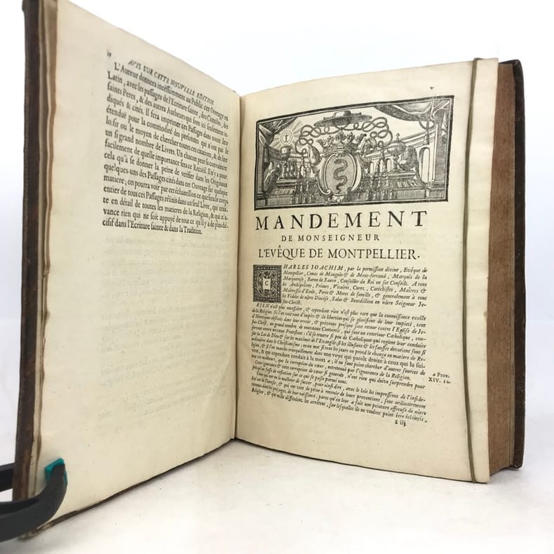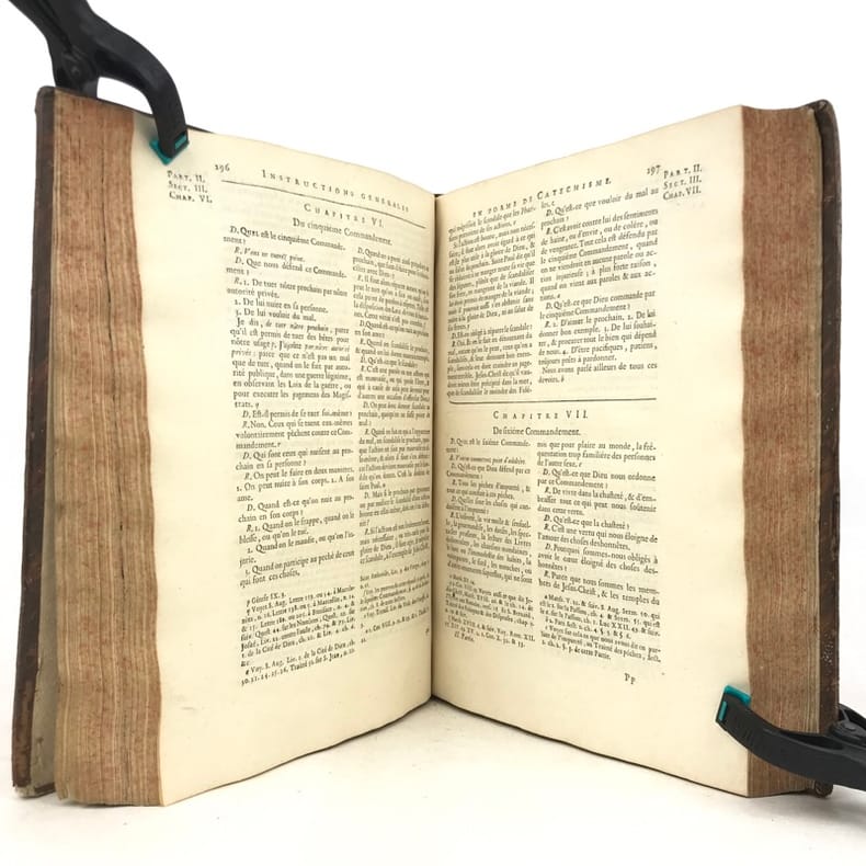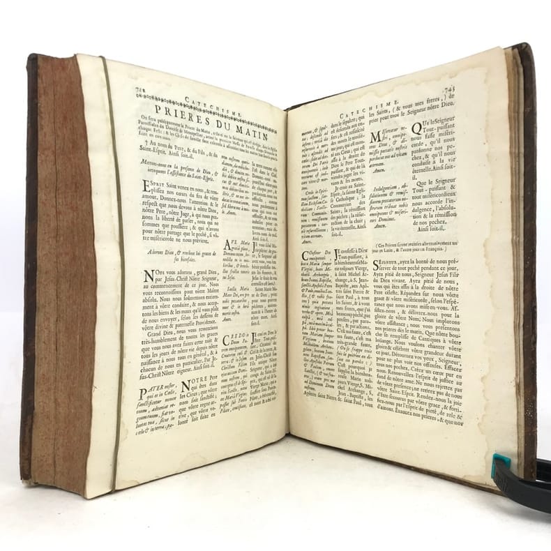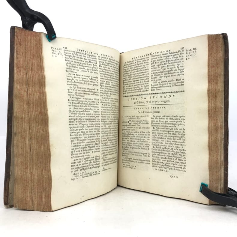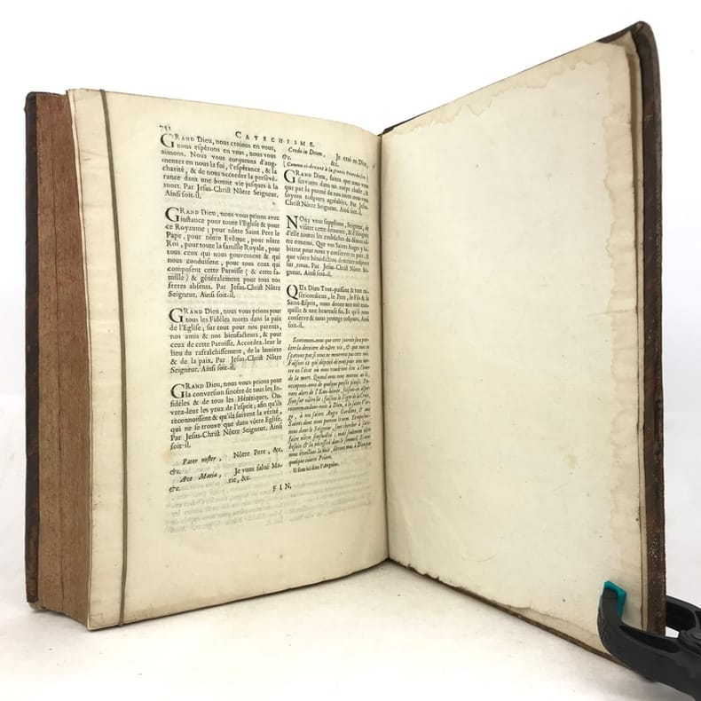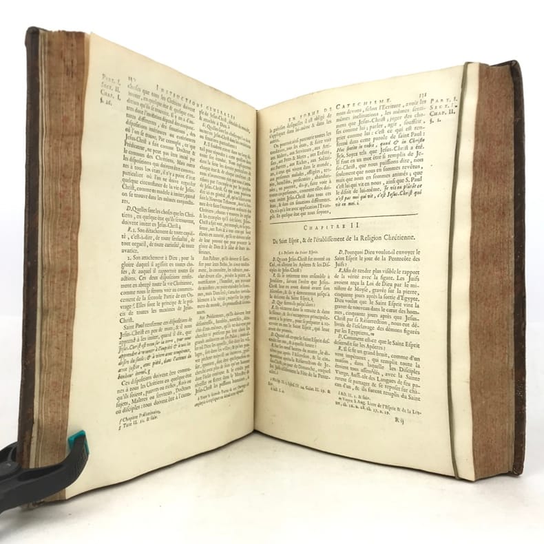 1 volume in-4 (25,5 x 19 cm), veau moucheté (reliure de l’époque), dos à nerfs orné, pièce de titre en maroquin grenat, roulette dorée sur les coupes, tranches mouchetées, texte sur double colonne, xviii-[2]-752 pages (complet). Un coin usé, légers frottements sur les plats, quelques rousseurs éparses. État très correct tout de même. Charles-Joachim Colbert de Croissy (1667-1738) est un évêque français, neveu du célèbre ministre et fervent janséniste. Il fait rédiger ce catéchisme dédié à sa paroisse par François-Aimé Pouget (1666-1723), également prêtre dans la même ville. Bon exemplaire.