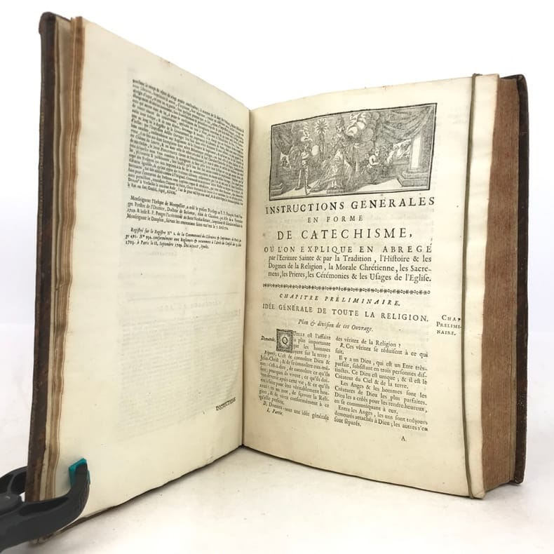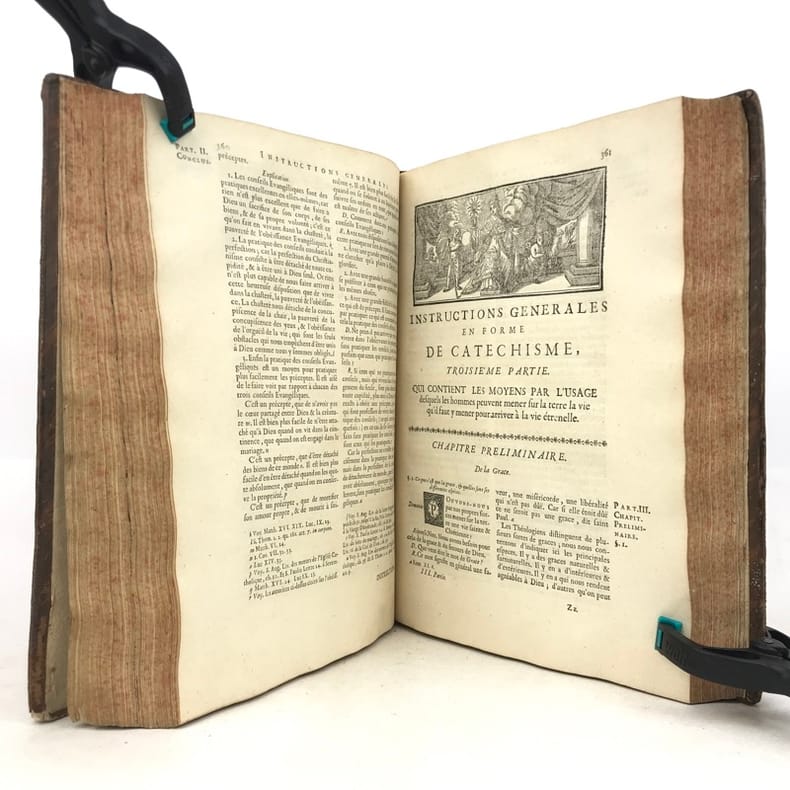 1748, Jean-François Crosat, in-4 plein cuir marron de 672 pages, titrage et décors dorés sur dos à 5 nerfs, Instructions générales en forme de catéchisme où l'on explique en abrégé par l'écriture sainte et par la Tradition, l'Histoire et les dogmes de la Religion, la Morale Chrétienne, les Sacrements, les Prières, les cérémonies et les usages de l'église, nouvelle édition, revue, corrigée et augmentée par ordre de Messire George-Lazare Berger De Charancy, évêque de Montpellier. | Etat : état moyen, épidermures, coiffes abîmées, coins émoussés, plusieurs pages trouées (vers de livre) (Ref.: G8661)