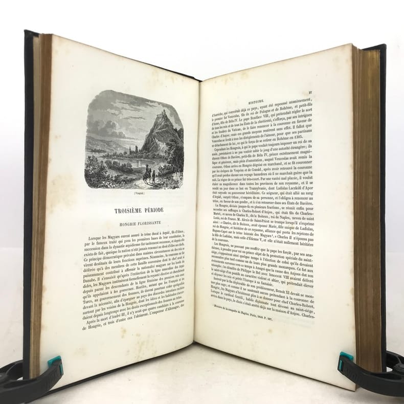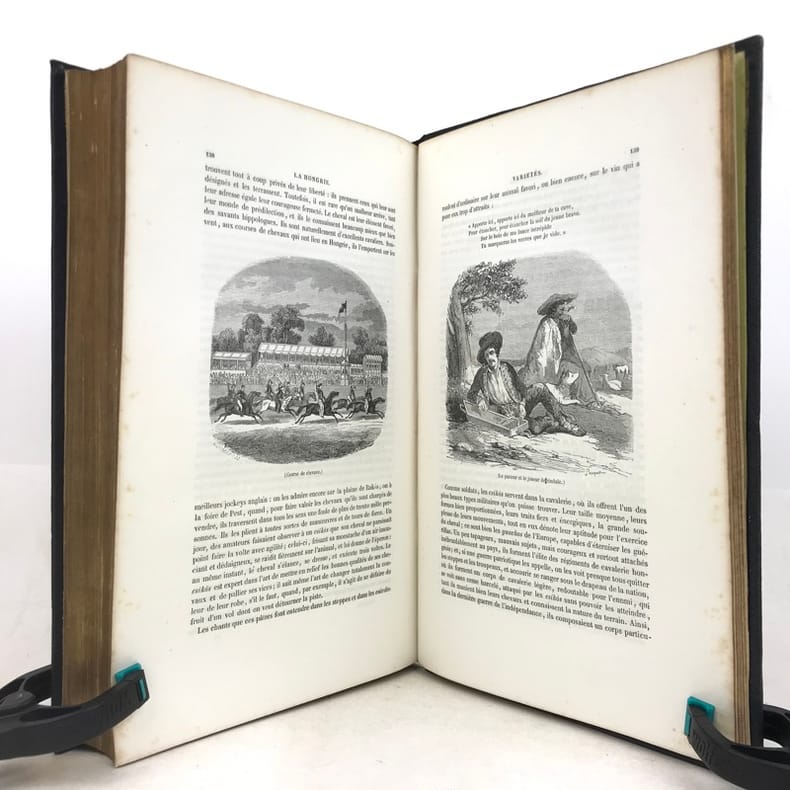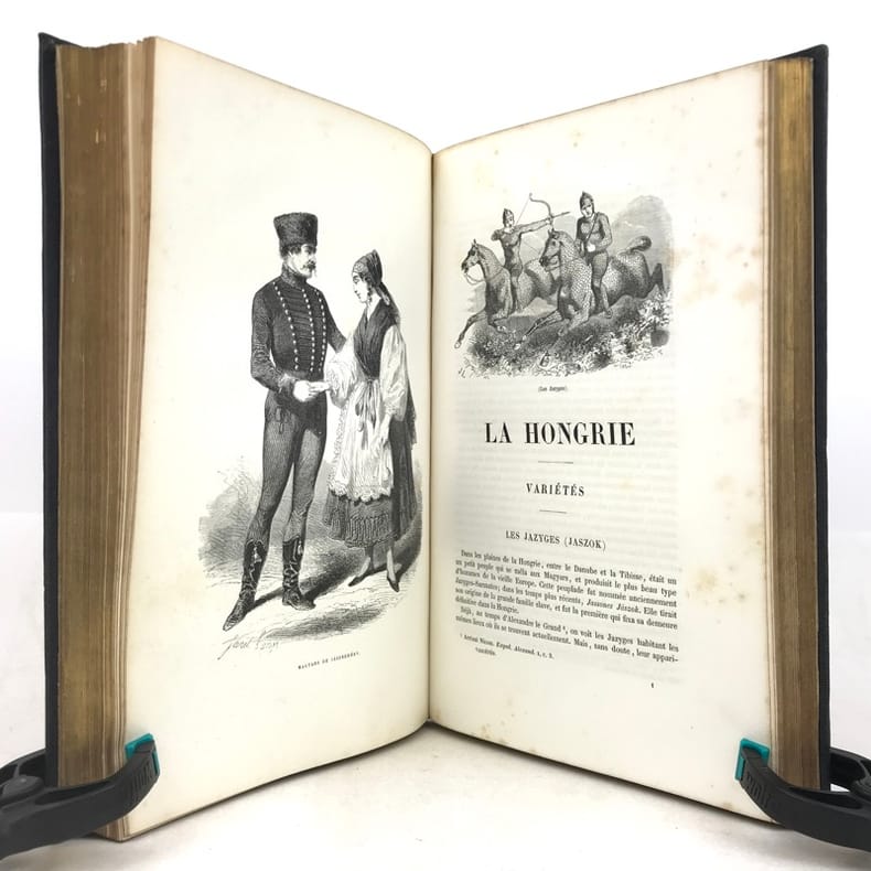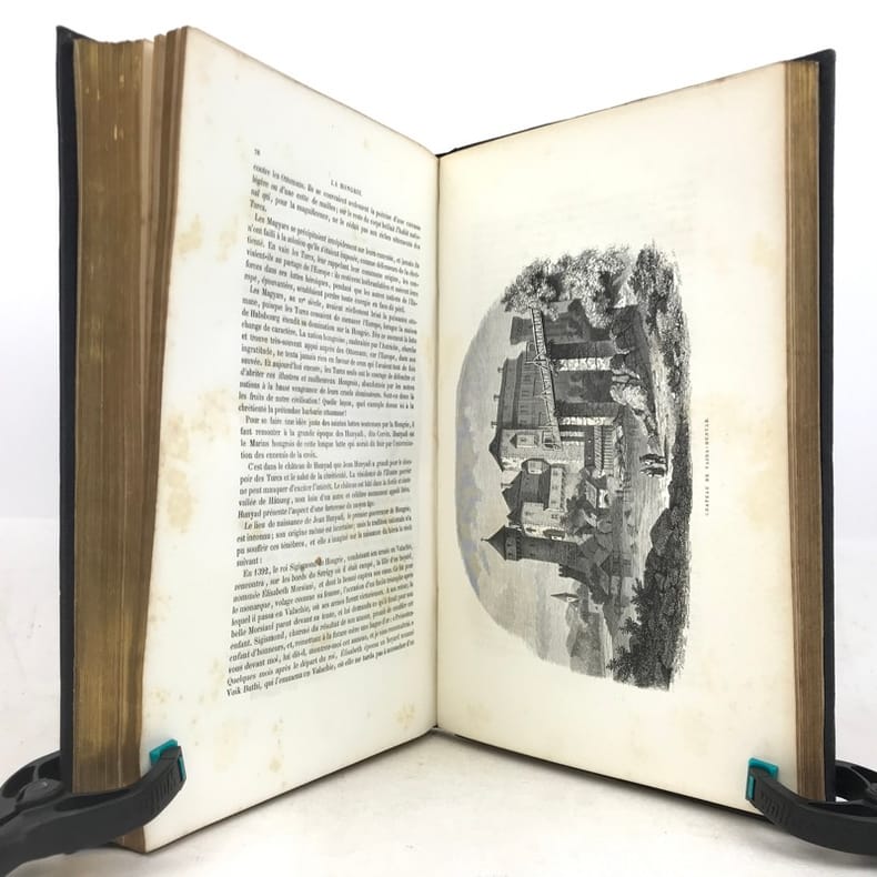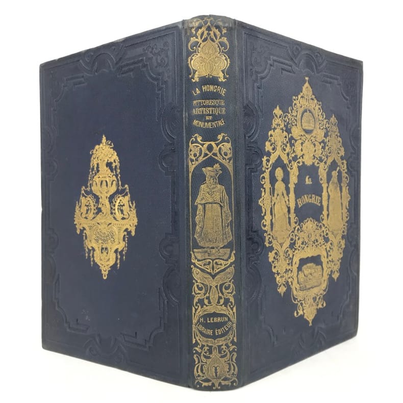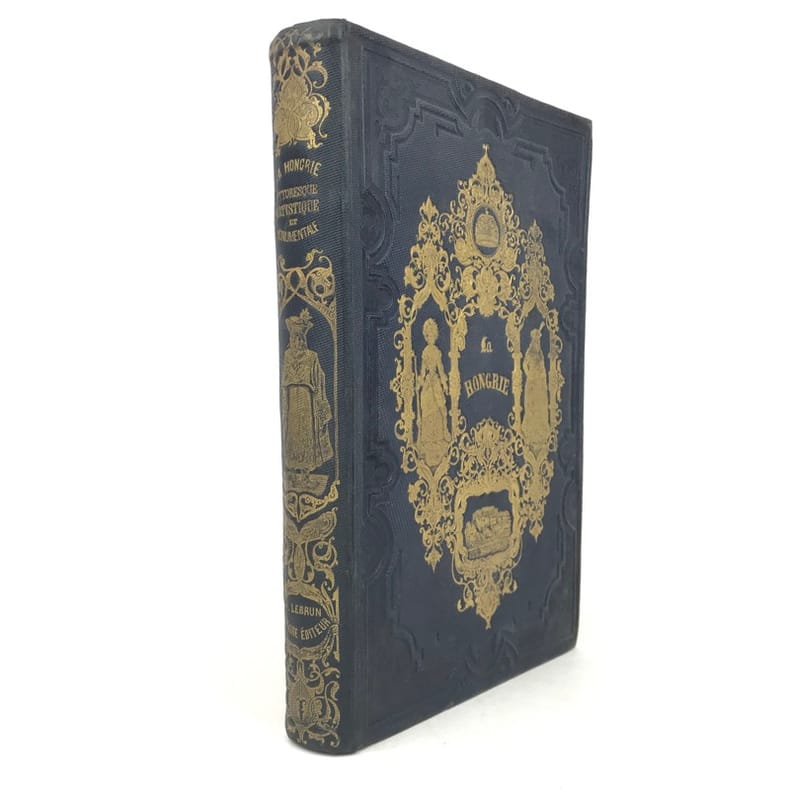 1 volume grand in-8 (26 x 17,5 cm), percaline bleu nuit (cartonnage de l’éditeur), dos lisse orné d’une composition en long dorée, plats ornés d’un encadrement à froid et de compositions dorées, tranches dorées, couverture et dos conservés. [4]-239-[1]-159-[1] pages (complet du texte). Manque le feuillet sur papier rose avec l’avis pour le classement des gravures. Rousseurs éparses dans le texte sans gêne de lecture et les planches, petite déchirure marginale à 2 feuillets, dont une restaurée. Bon état. Belle édition illustrée en premier tirage d’un titre gravé en frontispice avec un bel encadrement, répété sur la couverture, et de 29 planches hors texte gravés sur bois par Trichon, Brevière, Fanion, Etherington, Deschamps, Blaise, Hildibrand, Montigneul, Pothey et Rose, d’après les dessins de Janet-Lange, Beaucé, Breton, Catenacci, de Bar et Freeman; bien complète de la carte de Hongrie dressée par Boldonyi et d’un tableau indicatif de la carte de Hongrie; ainsi que de vignettes in texte (Carteret). Bon exemplaire dans un beau cartonnage romantique.