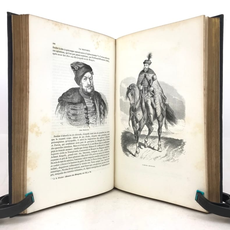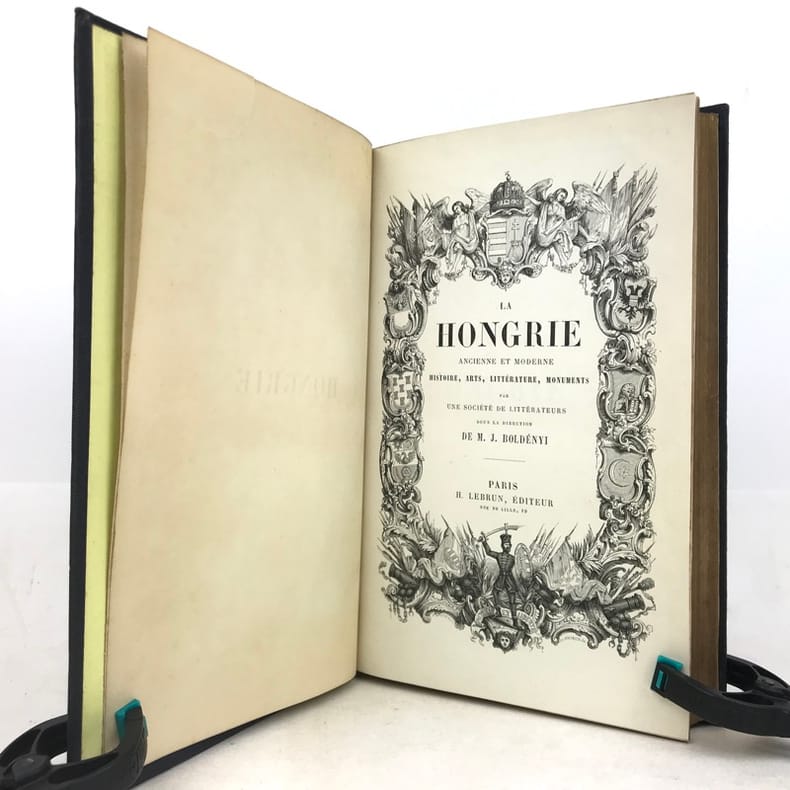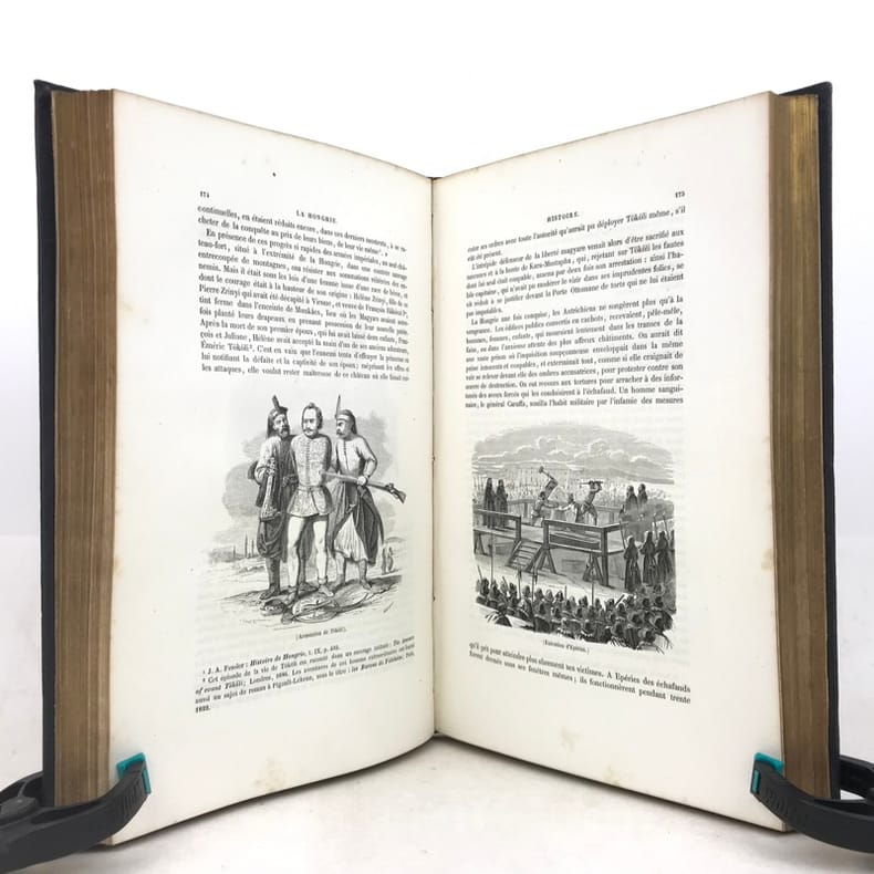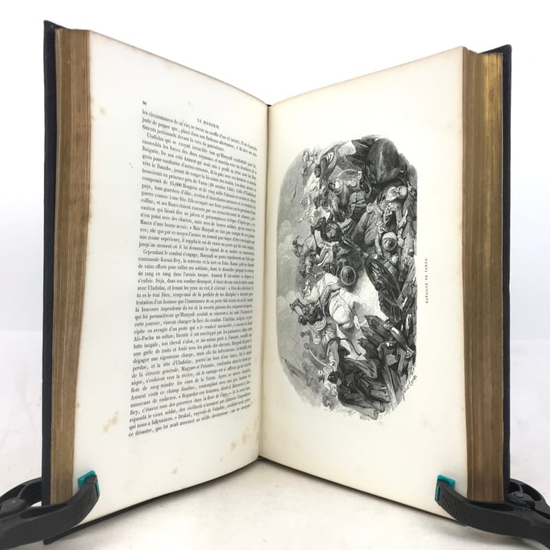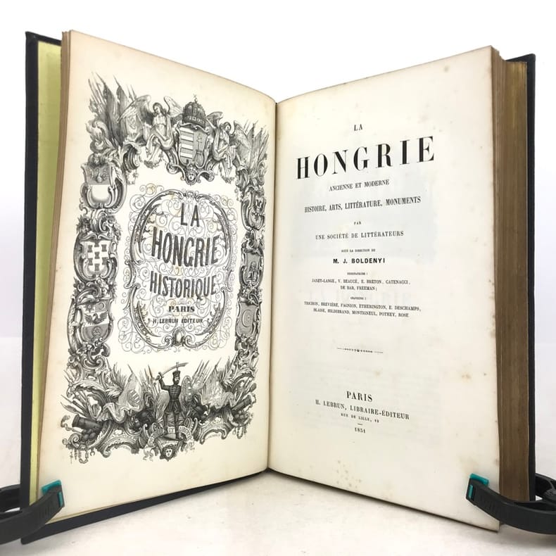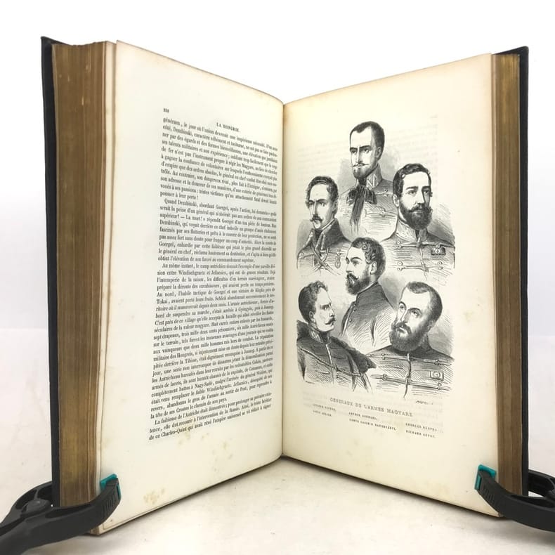 1 volume grand in-8 (26 x 17,5 cm), percaline bleu nuit (cartonnage de l’éditeur), dos lisse orné d’une composition en long dorée, plats ornés d’un encadrement à froid et de compositions dorées, tranches dorées, couverture et dos conservés. [4]-239-[1]-159-[1] pages (complet du texte). Manque le feuillet sur papier rose avec l’avis pour le classement des gravures. Rousseurs éparses dans le texte sans gêne de lecture et les planches, petite déchirure marginale à 2 feuillets, dont une restaurée. Bon état. Belle édition illustrée en premier tirage d’un titre gravé en frontispice avec un bel encadrement, répété sur la couverture, et de 29 planches hors texte gravés sur bois par Trichon, Brevière, Fanion, Etherington, Deschamps, Blaise, Hildibrand, Montigneul, Pothey et Rose, d’après les dessins de Janet-Lange, Beaucé, Breton, Catenacci, de Bar et Freeman; bien complète de la carte de Hongrie dressée par Boldonyi et d’un tableau indicatif de la carte de Hongrie; ainsi que de vignettes in texte (Carteret). Bon exemplaire dans un beau cartonnage romantique.