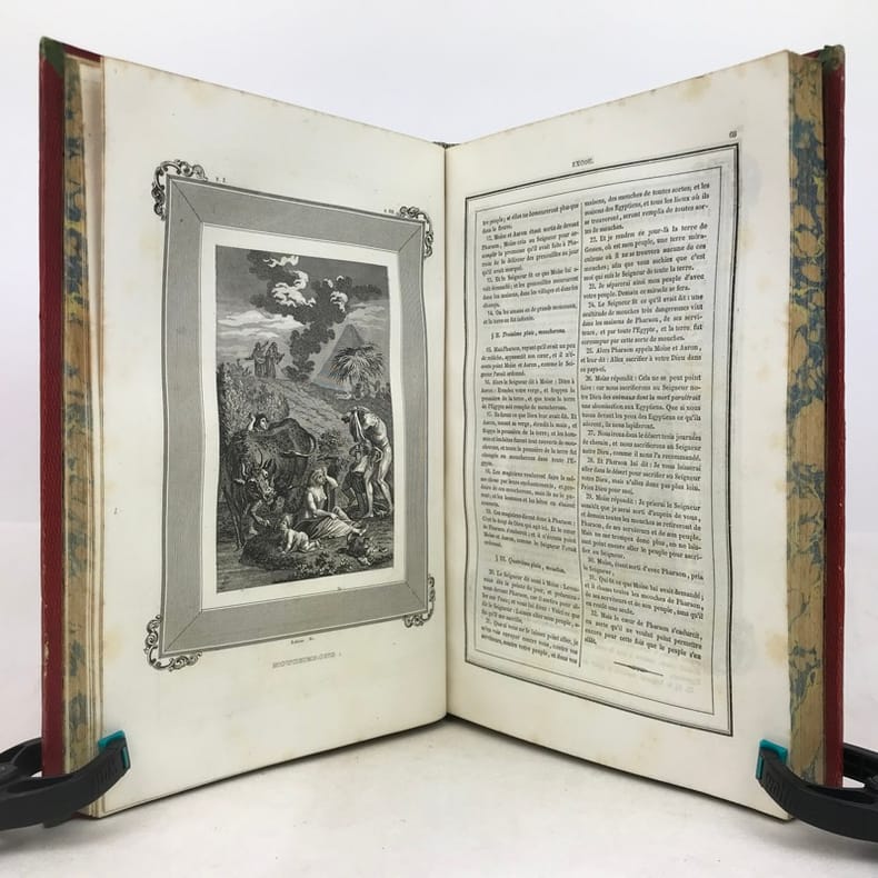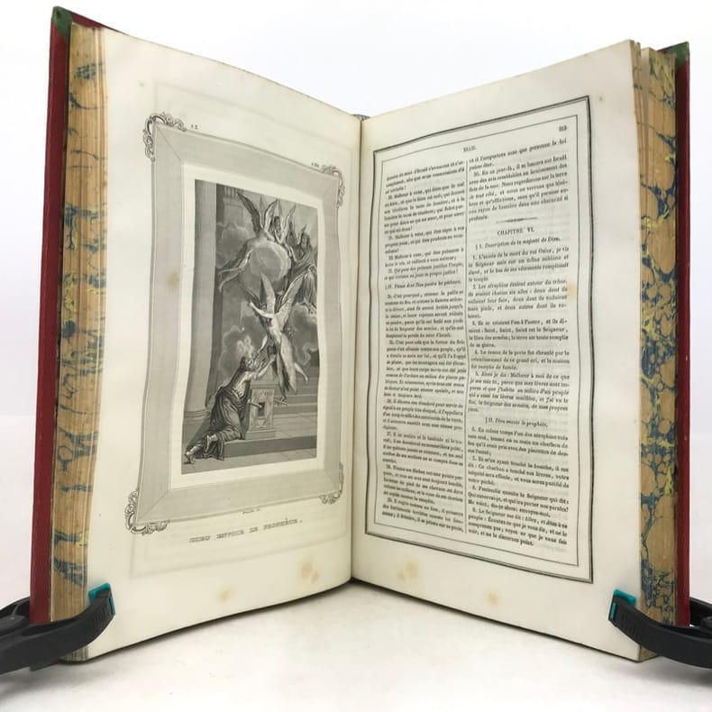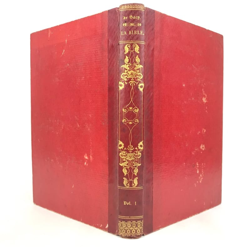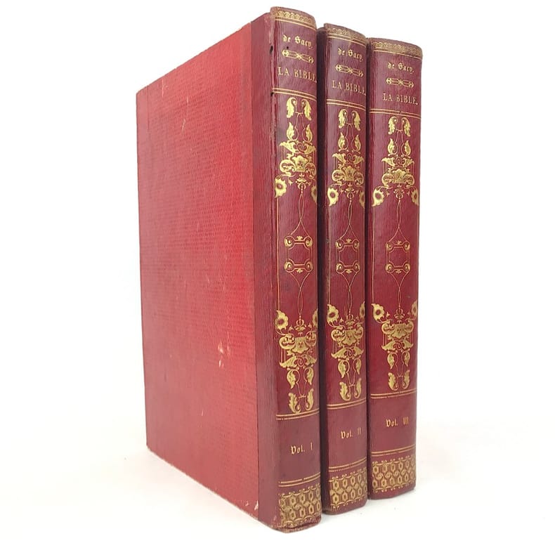 3 volumes in-4 (27 x 18,5 cm), demi-basane rouge (reliure de l’époque), dos lisse orné, tranches marbrées, texte encadré sur double colonne, [4]-304 ; [4]-305 à 647-[1] ; [4]-620 pages (complet). Frottements sur les plats, rousseurs. État correct. Nouvelle édition de la Sainte Bible traduite par Le Maistre de Sacy, illustrée de 160 gravures hors-texte. Agréable exemplaire.