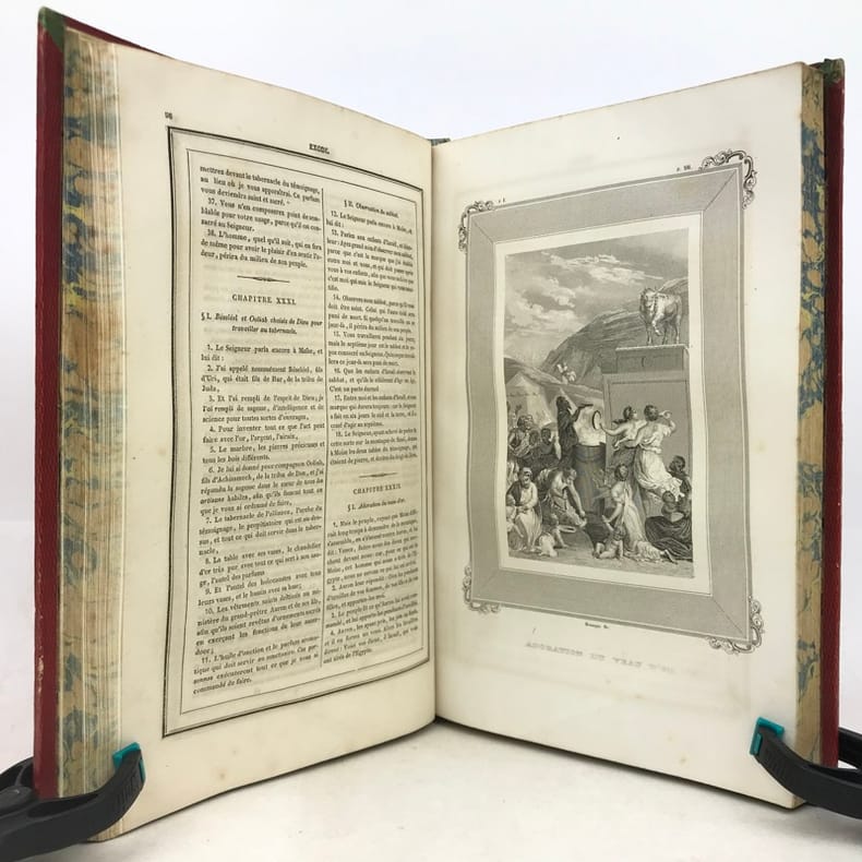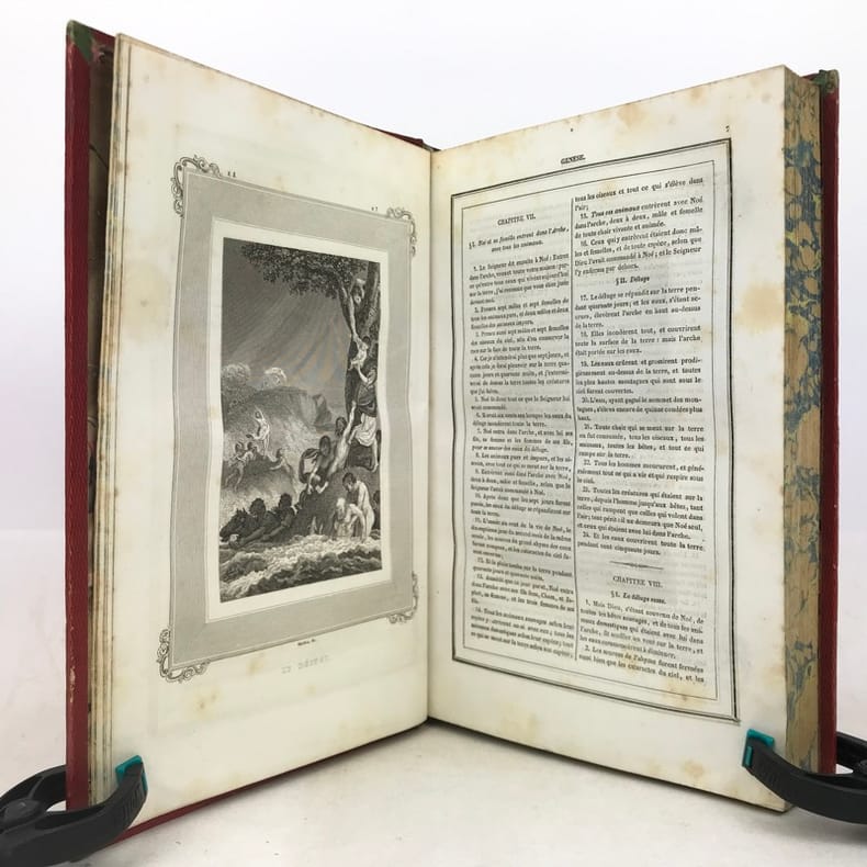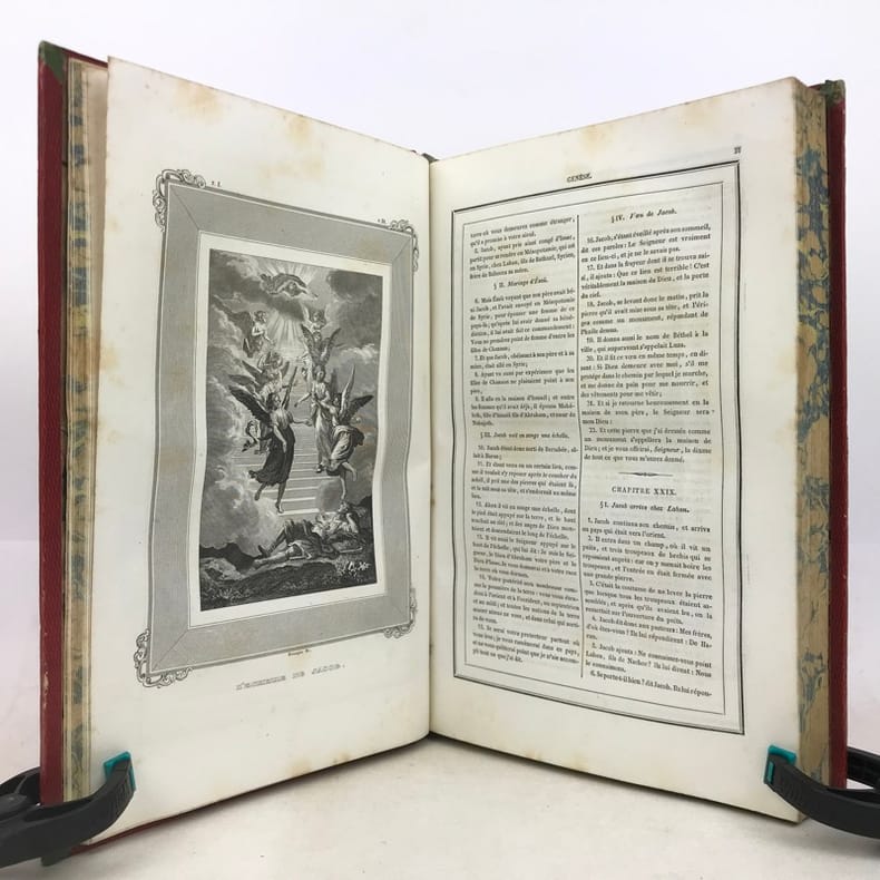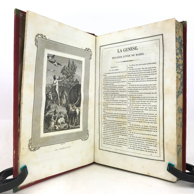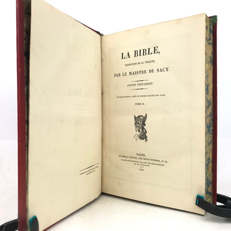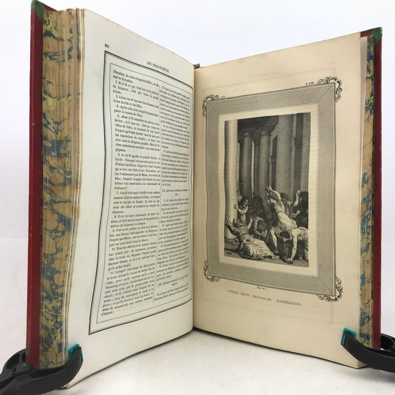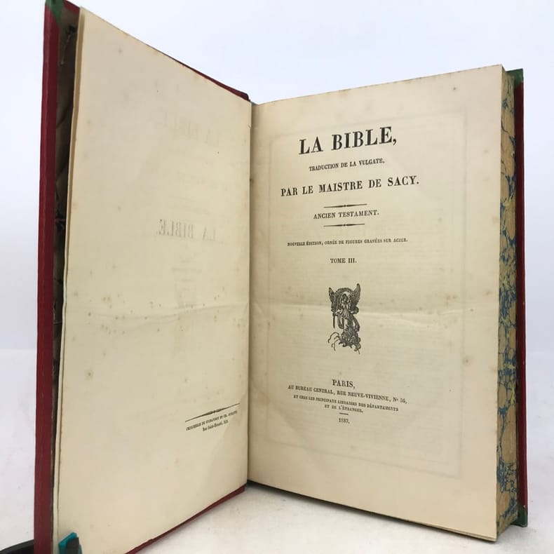 Paris, Bureau Central, rue Vivienne, 1837 Nouvelle édition, ornée de figures gravées sur acier complet en 3 vols in4, 280x200, demi cuir rouge,dos lisses ornés de fers romantiques en long,tranches marbrées,, frottements, bel état intérieur,304 pages pour le tome I, tome II paginé de 306 à 647,647 (pagination continue pour T1 et 2), 620 pp pour T3, ouvrages rares et recherchés ! Illustré de plus de 143 planches gravées sur acier par Péronard, Skelton, Domaine, etc.Texte encadré sur deux colonnes..Edition romantique en 3 volumes de la Bible dans la traduction du Maistre de Sacy, ornée de planches hors-texte gravées sur acier sous serpentes,texte élégamment encadré d'un triple filet noir gras et maigre,charnière fendillée fragile haut du t.3,sur 4cm; coiffe sup.un peu abimée au T.2.,sinon bon .Lemaistre de Sacy ,Isaac (1613-1684) ,Traducteur,Peronard ,Graveur,Lalaisse ,Graveur,Skelton ,Graveur.Les planches gravées sur acier, signées : Péronard, C. Lalaisse, Skelton, Dunaime, Canu, Monin, Rouargue, Colin, M.lle André, Mondain, Branche, Morinet, Desjardins, Lecerf, Butavand, L. Berlie, Euzet, Gossard, Pauquet, Emile Giroux, Château, Lejeune, Thiery, Villerey.